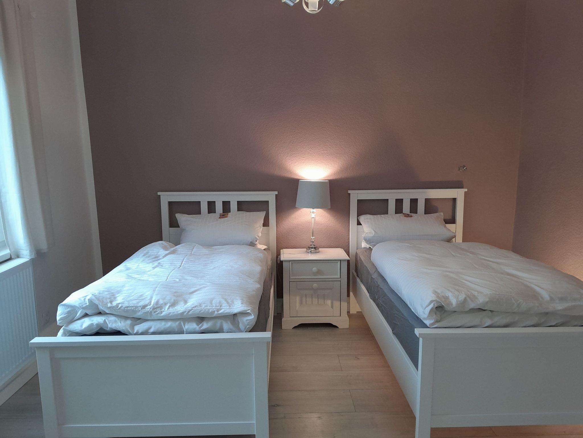 Das Hauptschlafzimmer, mit einem Doppelbett, hat direkte Anbindung an das Badezimmer. Das zweite Schlafzimmer hat zwei Einzelbetten. Der Weg von diesem Zimmer zum Badezimmer führt durch das Hauptschlafzimmer. Bedingt durch diese Besonderheit, sind die Ferienwohnungen für Familien oder Personen geeignet, die sich gut kennen. Eines der Schlafzimmer hat eine gemütliche Sitzecke mit TV-Gerät.