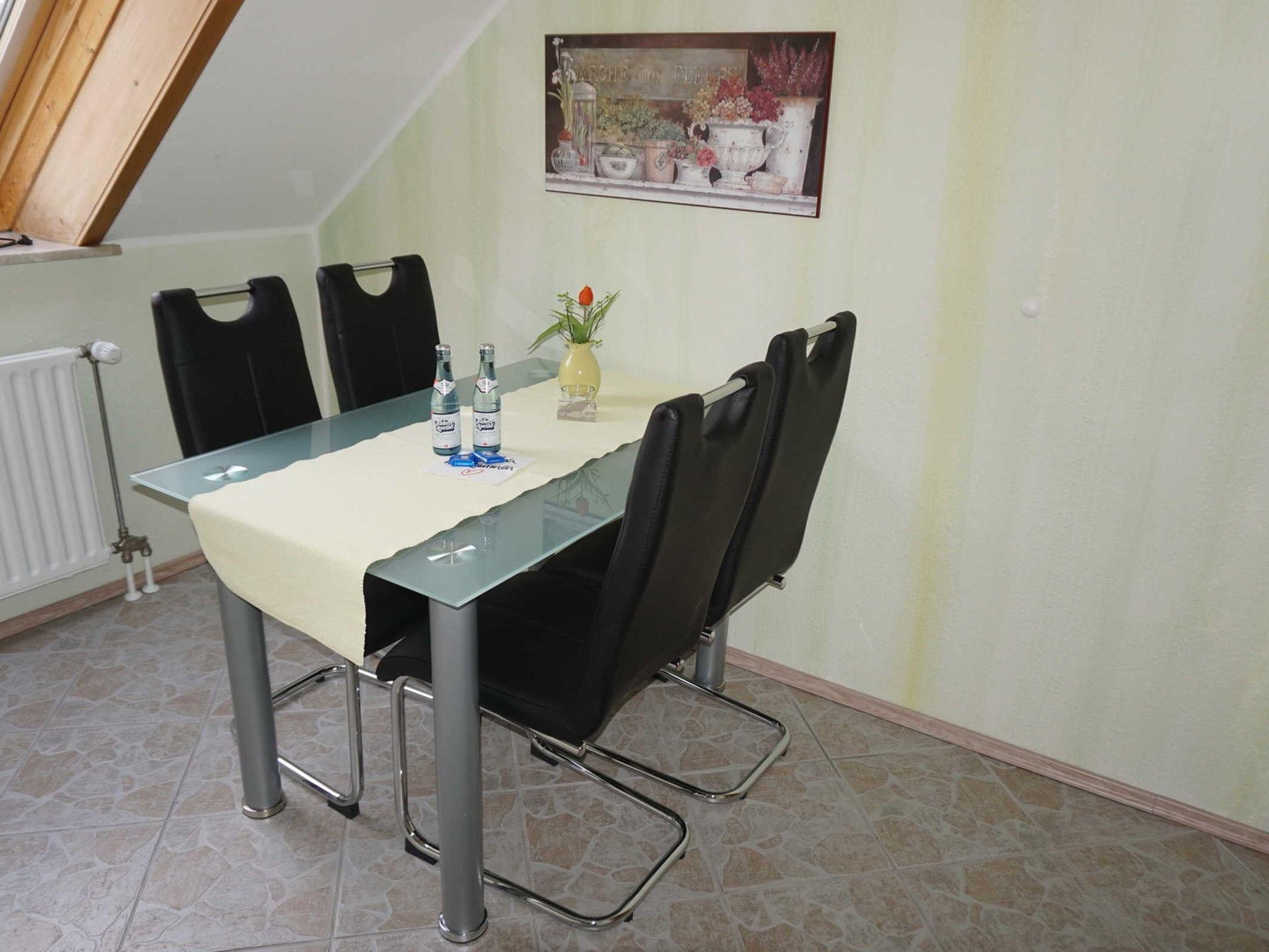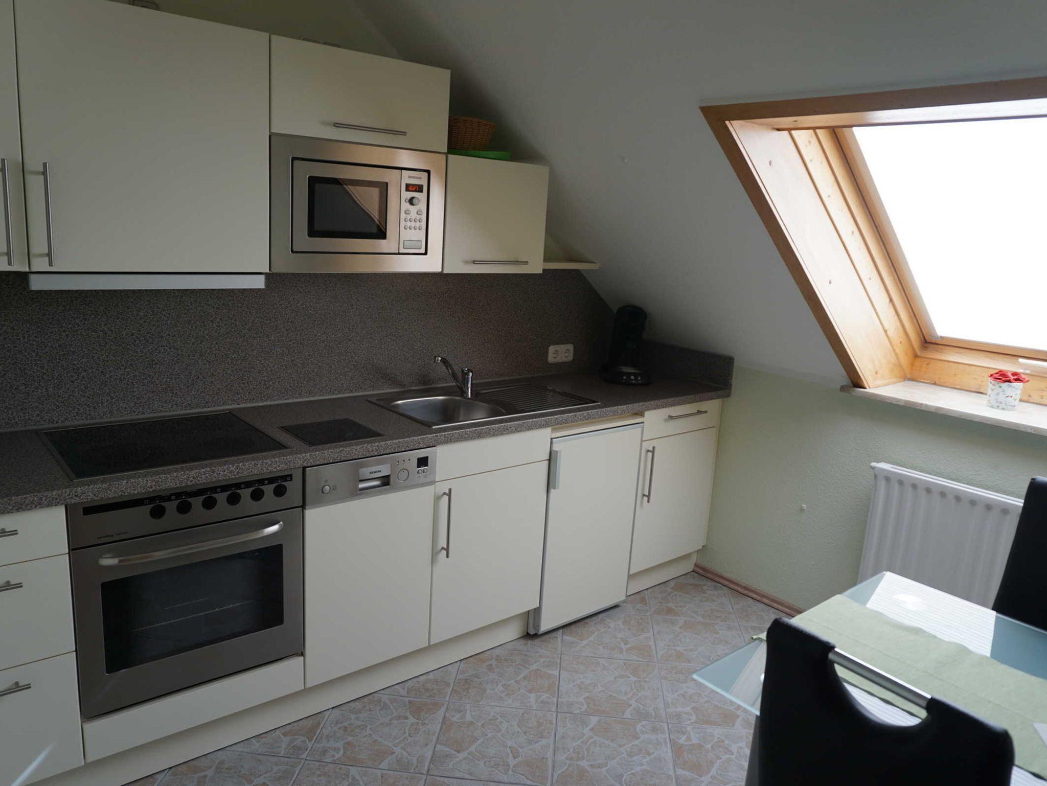 - eine komplett eingerichtete Einbauküche mit Spülmaschine, Backofen und Cerankochfeld, Gefrier-Kühlkombination und Mikrowelle mit einer Essecke für 4 Personen
