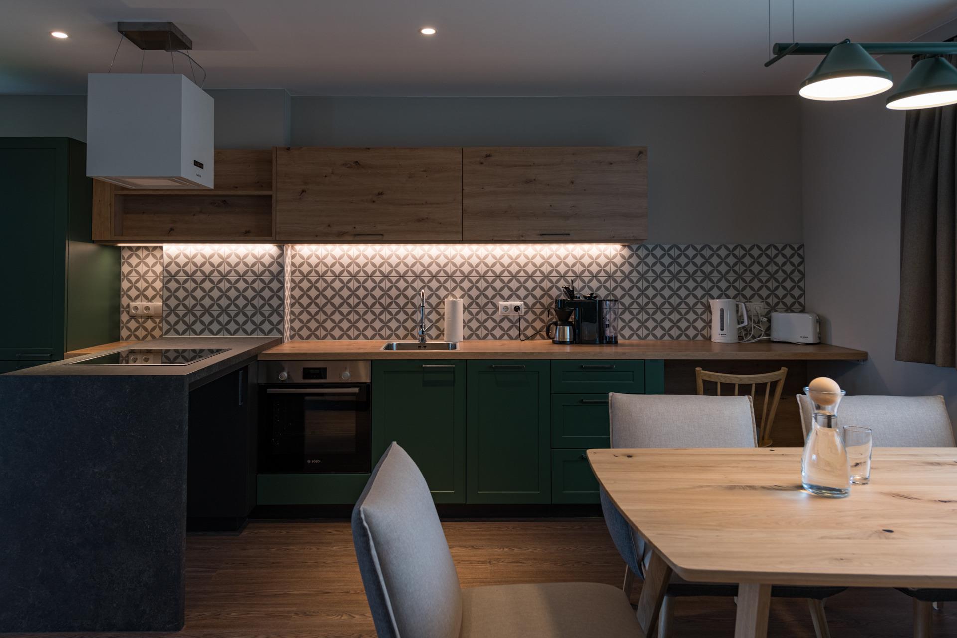 Der offene Wohn/ Essbereich bietet eine gemütliche Sofaecke mit TV sowie einen Essplatz. Es gibt eine voll ausgestattete Küche mit Herd/ Backofen, Kühlschrank mit Gefrierfach, Spülmaschine, Kaffeemaschine und Wasserkocher. Die zwei Schlafzimmer verfügen jeweils über ein gemütliches Boxspringbett (1,80 x 2,00 m), sowie TV.