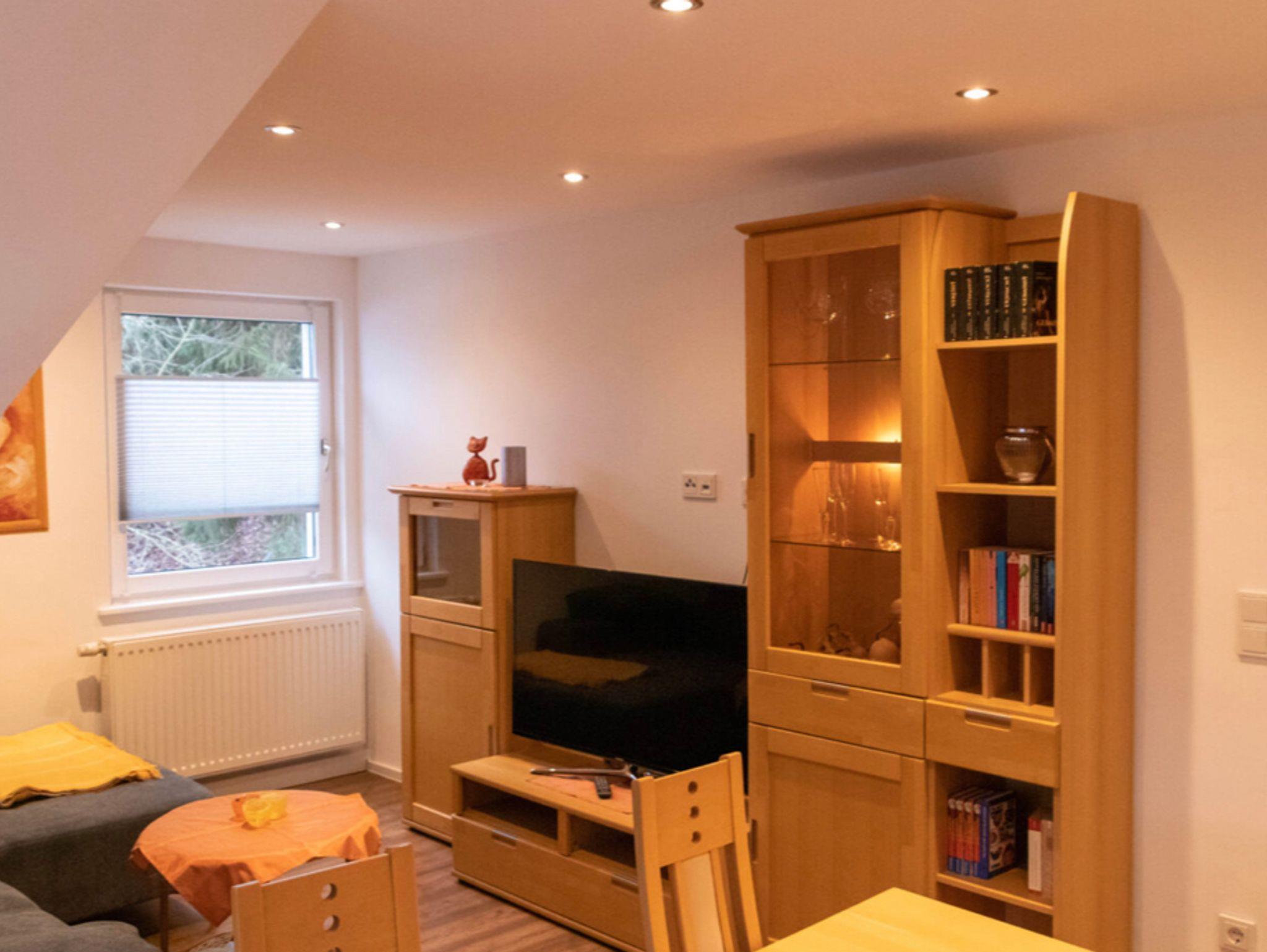 Die Ferienwohnung bietet auf 60 Quadratmetern Platz für 3 Personen. Sie liegt im Obergeschoss eines 2-Familien-Wohnhauses. Sie verfügt über ein Wohn-/ Esszimmer mit Schlafcouch und TV sowie ein Schlafzimmer mit Doppelbett (bestehend aus 2 Einzelbetten 0,90 x 2,00 m auch getrennt stellbar). Die Küche ist mit Essplatz und Barhocker, E-Herd mit Cerankochfeld und Backofen, Spülmaschine, Kühlschrank mit Gefrierfach, Toaster, Kaffeemaschine und Wasserkocher vollständig ausgestattet. Das Tageslichtbad verfügt über Waschbecken und Badewanne mit Duschvorrichtung. Zudem gibt es ein separates WC. Bettwäsche, Handtücher und Geschirrtücher sind kostenfrei vorhanden. Auch WLAN steht Ihnen kostenfrei zur Verfügung. 1 Auto-Stellplatz befindet sich direkt am Haus.