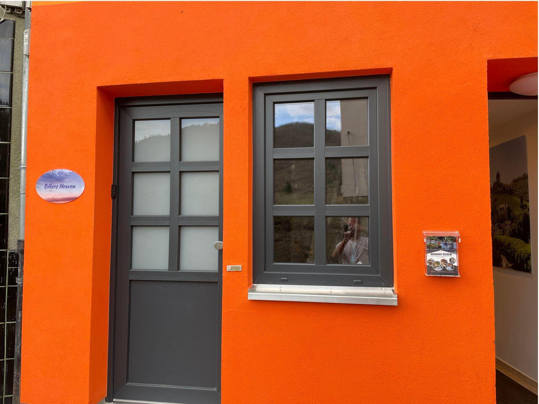 Es ist gerade mal 4 m breit und direkt an den Felsen gebaut. Dafür bieten die Wohnungen einen herrlichen Blick auf die Mosel und den gegenüber liegenden Weinberg.