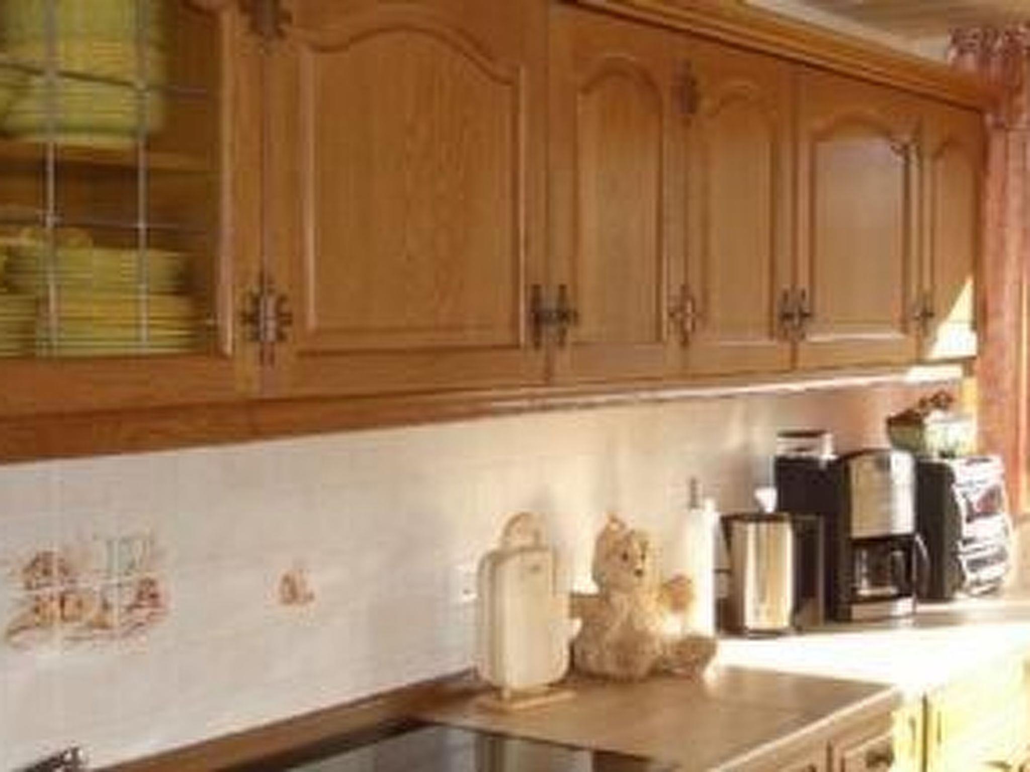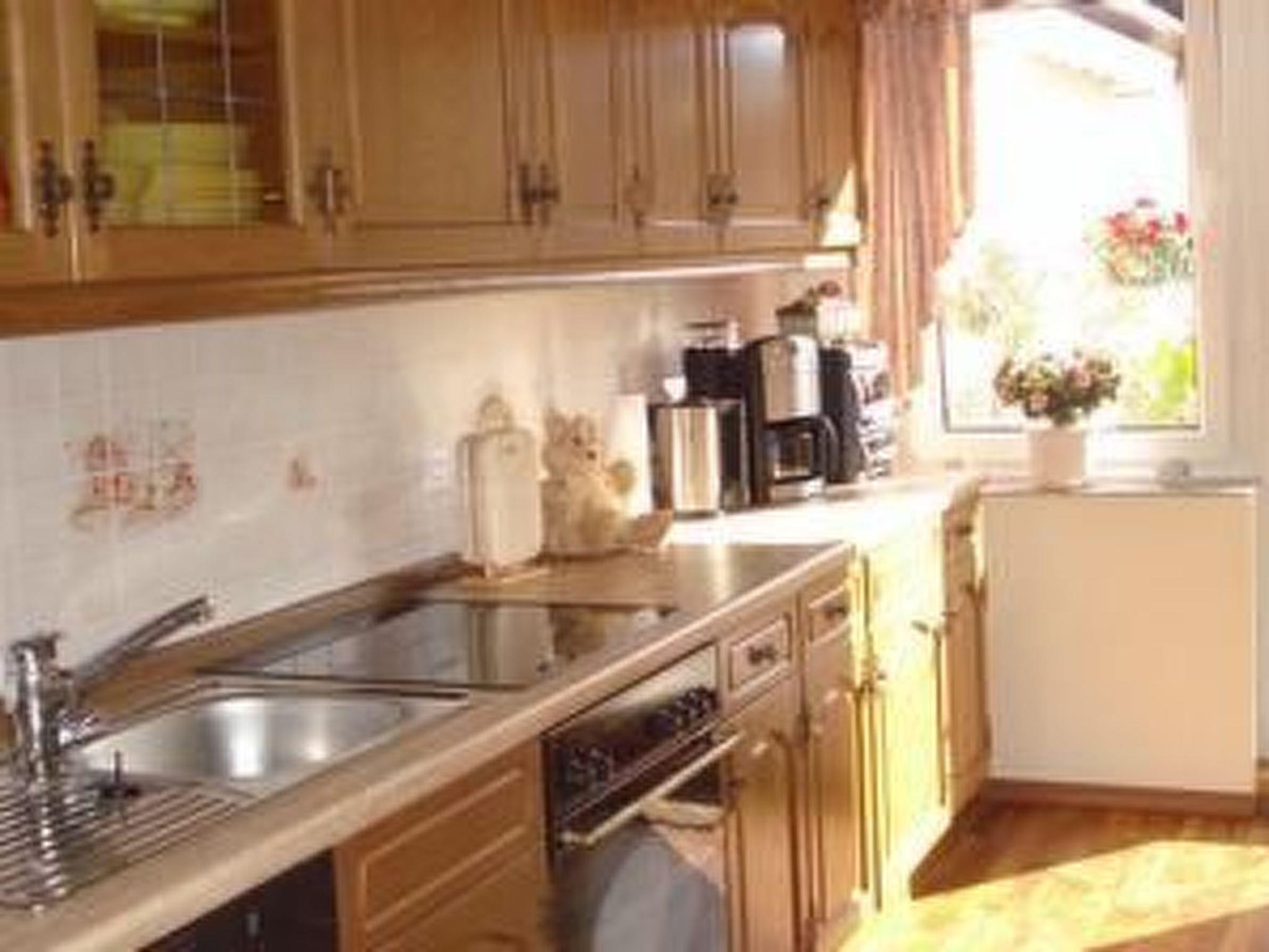 - aus einer Küche mit einem Esstisch und 3 Stühlen sowie Küchenzeile mit einem 4-er Ceranfeld, Backofen, Spüle, Geschirrspüler, Toaster, Kaffee- und Teemaschine, Wasser- und Eierkocher, Kühlschrank sowie Geschirr.