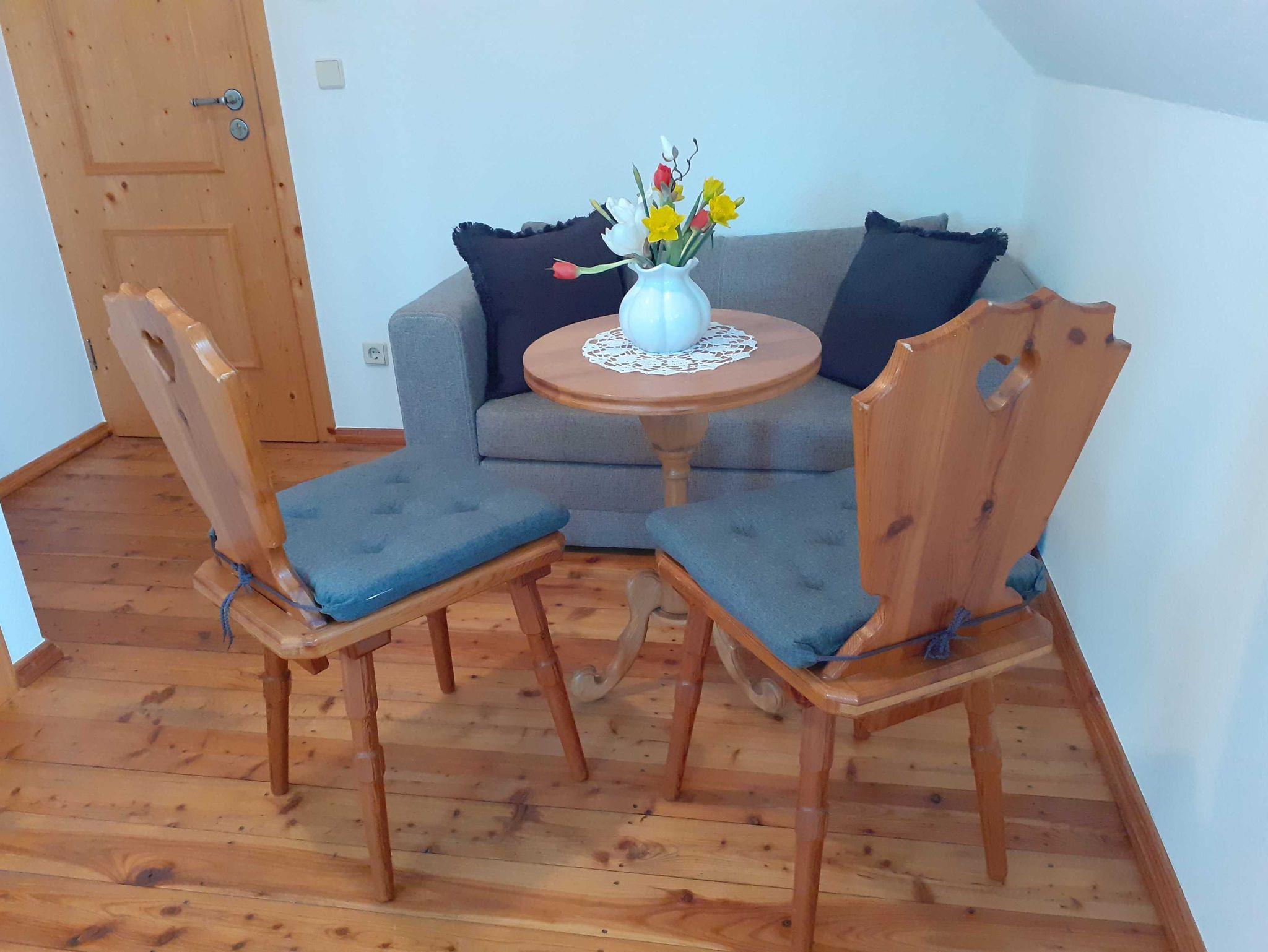 Im Zimmer befindet sich ein großer Kleiderschrank, ein kleines Sofa sowie ein Tisch mit 2 Stühlen und eine kleine Garderobe.