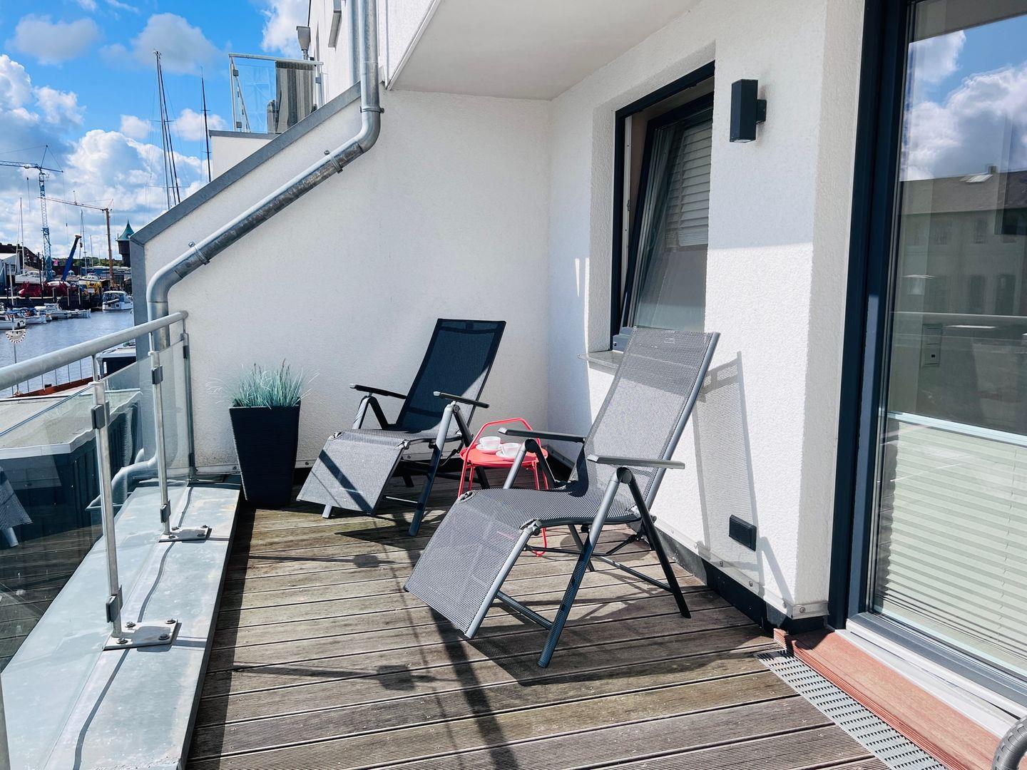 Über den Wohnbereich im Erdgeschoss gelangt man auf die Terrasse, die nach Westen ausgerichtet ist und die Gäste es sich hier auf den Terrassenmöbeln gemütlich machen und den Blick auf den Yachthafen genießen können. Im 1. Obergeschoss befindet sich eine Balkonterrasse, die nach Osten ausgerichtet ist und mit zwei bequemen Stühlen und einer Liege ausgestattet ist. Im 3. Obergeschoss erwartet die Urlaubsgäste auf der Dachterrasse eine traumhafte Aussicht. Am großen Tisch finden alle Gäste Platz. Hier kann der Urlaubstag an lauen Sommerabenden und an der frischen Nordseeluft zu Ende gehen.