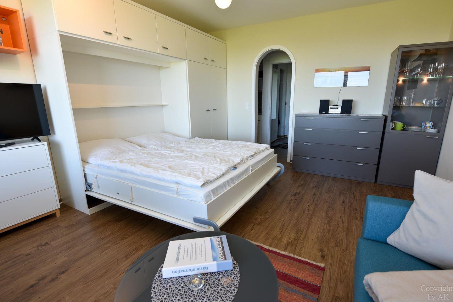 1-Zimmer Ferienappartement im 4. OG im Haus JAN AM STRAND mit großem Balkon und toller Seesicht auf den Weltschifffahrtsweg und das Weltnaturerbe Wattenmeer. Komfortable eingerichtetes Appartement für 2 Personen, mit moderner Küchennische. Im Wohnbereich befindet sich ein Schrankbett , ein Sofa sowie ein Tisch und 2 Stühle. Das Duschbad ist neu. Der Tiefgaragenstellplatz hat eine Einstellhöhe von 195cm.
