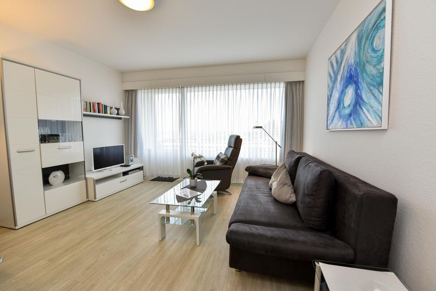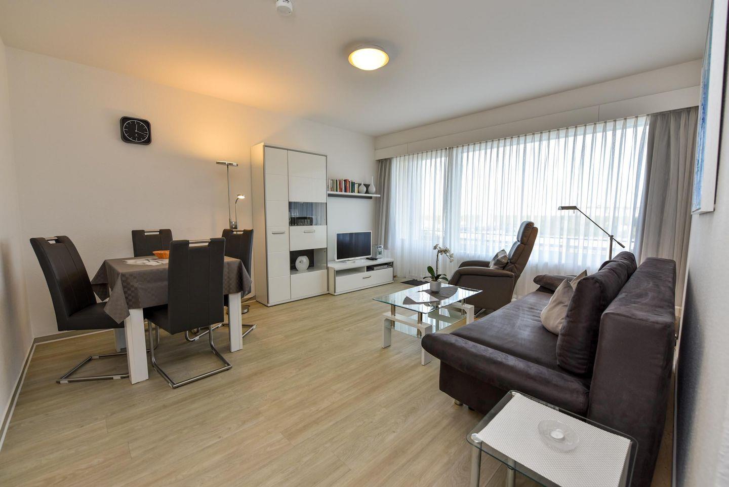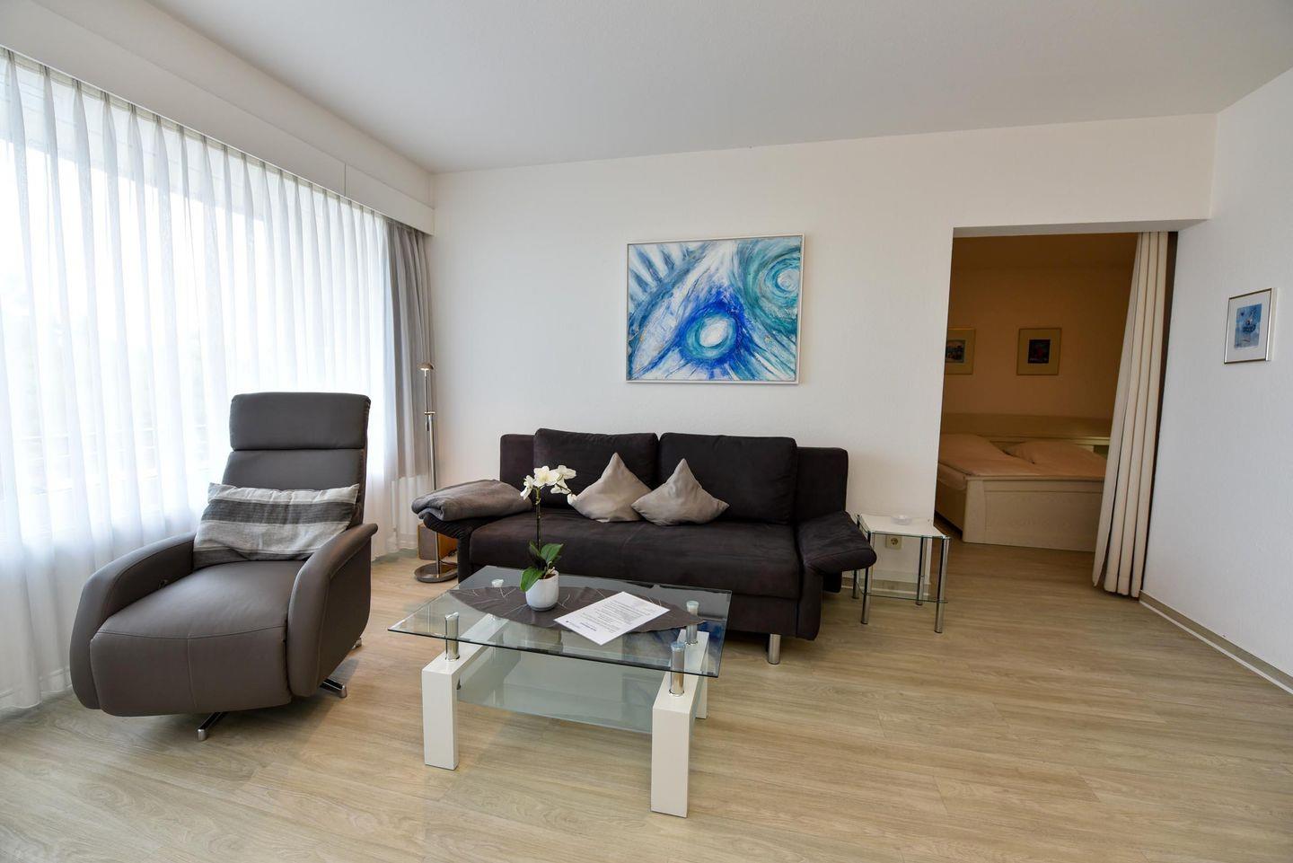 Renoviertes allergikerfreundliches mit Vinylboden ausgelegtes 2-Zimmer Appartement im 1. OG mit großem Balkon und Teilseesicht, inkl. eigenem Strandkorb (01.05.-30.09.) am Sandstrand. Der Wohnraum ist u.a. mit einem Schlafsofa und einem gemütlichen Relax-Sessel ausgestattet. Im Schlafraum, welcher zum Wohnraum offen ist, befindet sich ein Ehebett und ein geräumiger Kleiderschrank. In der gut ausgestatteten Kochnische können Sie sich kleine Mahlzeiten zaubern. Das Appartement verfügt außerdem über einen Fernseher, einen DVD Player sowie eine Stereoanlage. Das helle Duschbad mit WC verfügt zudem über zwei Waschbecken. Der kostenlose Tiefgaragenstellplatz hat eine Einstellhöhe von 195 cm.