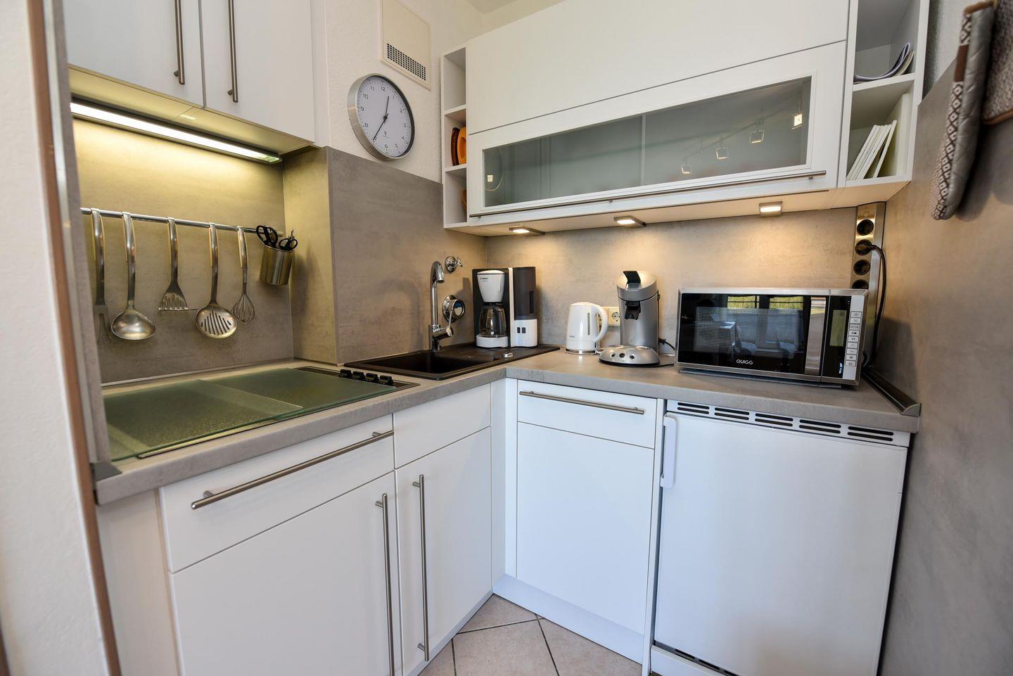 Für gemeinsame Mahlzeiten steht Ihnen ein Esstisch mit bequemen Stühlen zur Verfügung. Die integrierte Küchenzeile ist mit einer Mikrowelle, einem 2-Plattenherd und einem Geschirrspüler ausgestattet, um Ihren Aufenthalt so angenehm wie möglich zu gestalten. Das Schlafzimmer bietet zwei Einzelbetten, und das Appartement verfügt über ein modernes, neu renoviertes Duschbad mit WC.