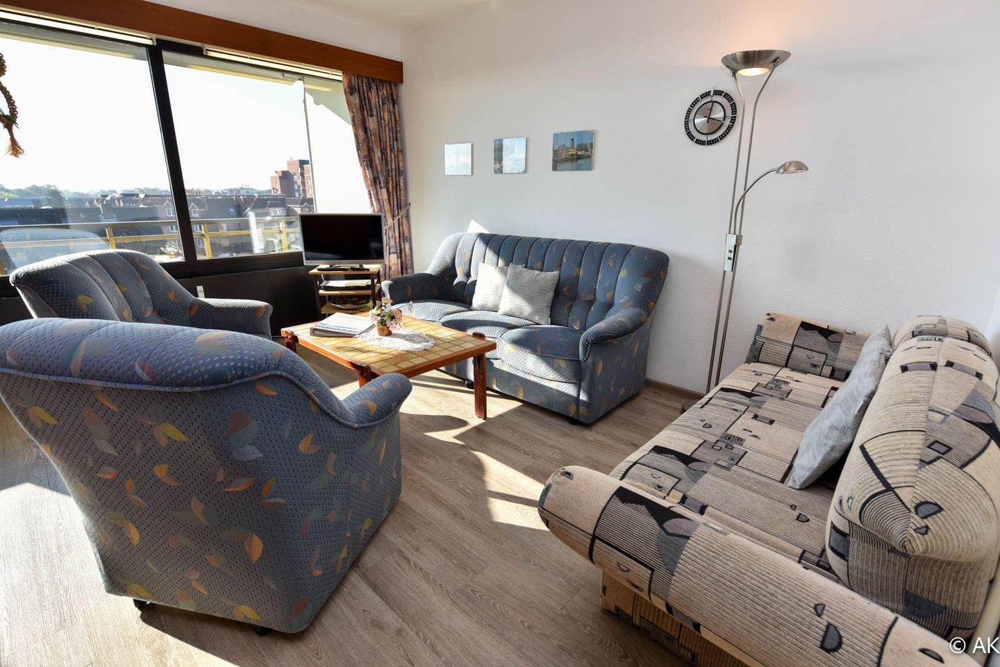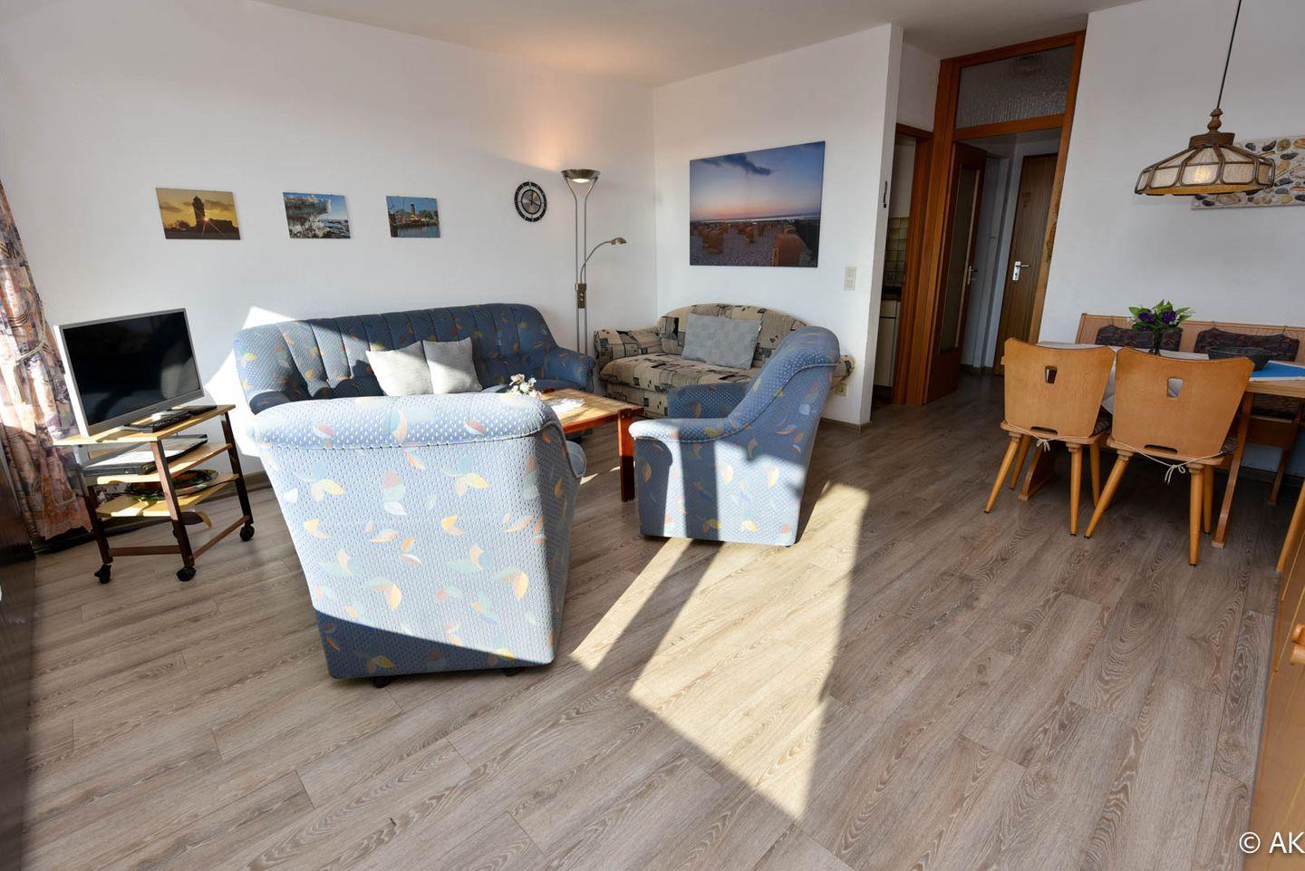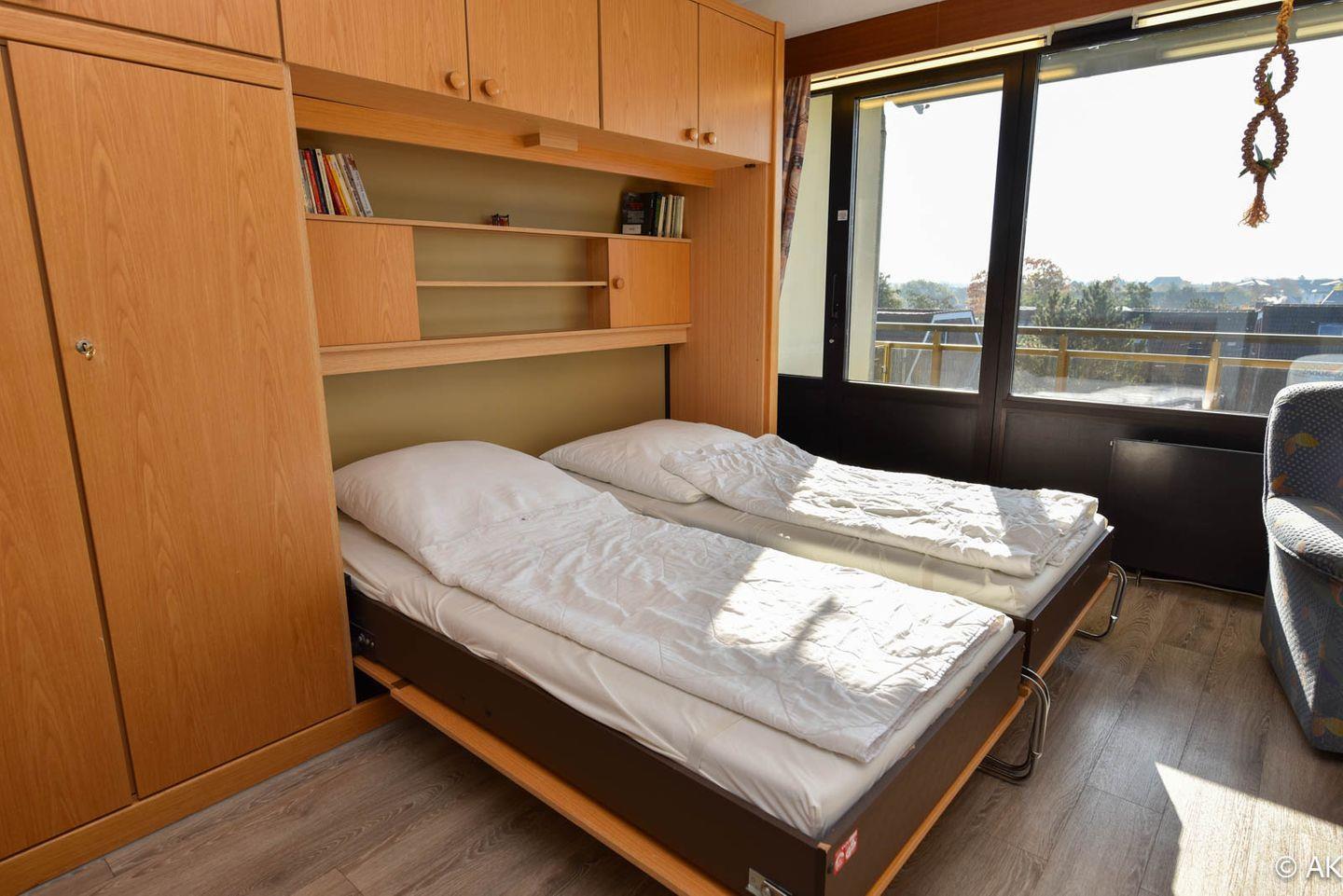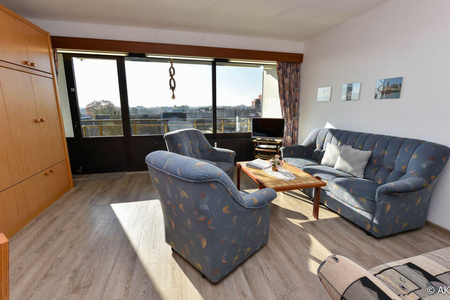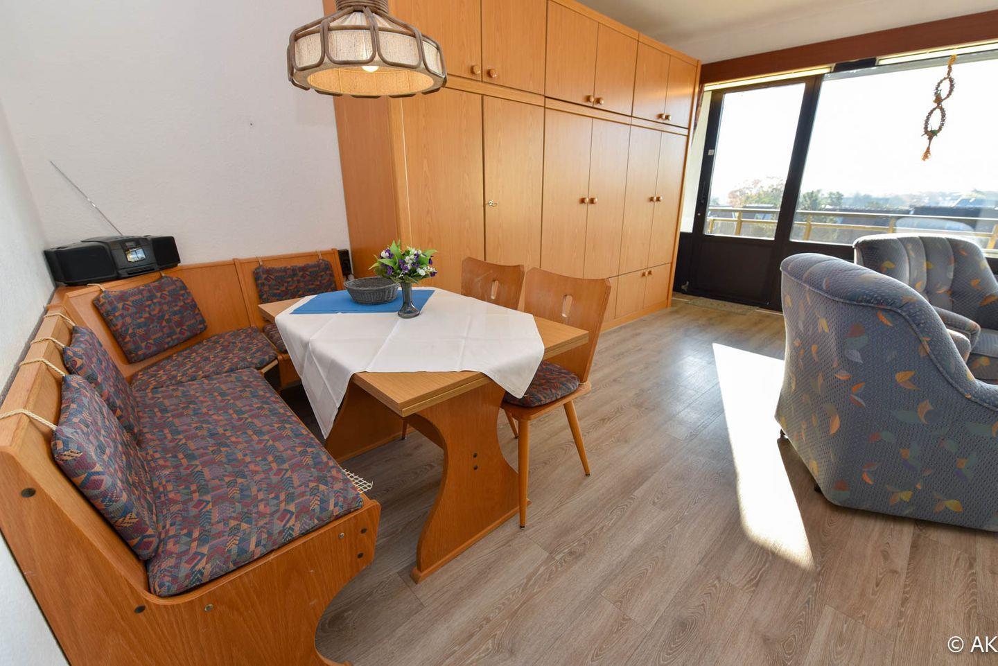Großzügiges 1-Zimmer Appartement mit neuem Vinyl Boden im 4. OG, mit herrlich sonnigen Balkon und eigenem Strandkorb (01.05.-30.09.) am Sandstrand. Das kostengünstige Familienappartement ist komfortabel für 2 Personen mit bis zu 2 Kindern eingerichtet. Im Wohnbereich befindet sich ein Schrankbett, ein Schlafsofa und eine Couch mit 2 Sesseln. Zum Essen gibt es eine gemütliche Eckbank mit Tisch und zwei Stühle. In der kleinen Küche befindet sich u.a. auch ein 4-Platten-Herd. Duschbad/WC. Der Tiefgaragenstellplatz hat eine Einstellhöhe von 190 cm.