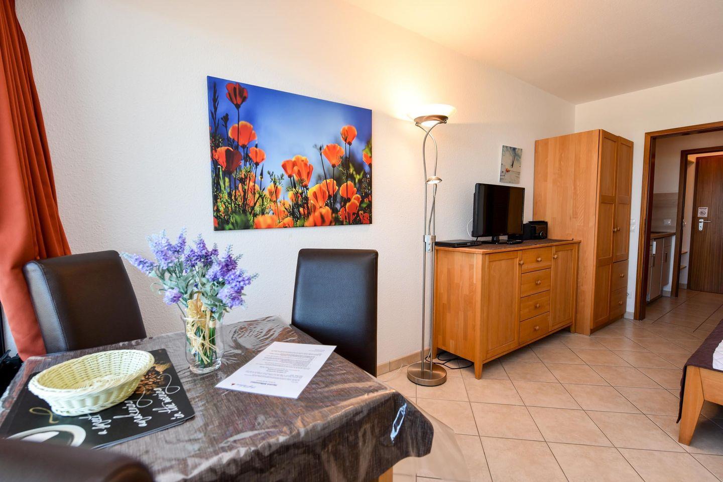 In der gut ausgestatteten Küchennische finden Sie eine Mikrowelle und einen 2-Plattenherd, sodass Sie sich schnell und einfach eine warme Mahlzeit zubereiten können. Das Duschbad mit WC rundet den Komfort des Appartements ab. Ein Kabel-Flachbild-TV sorgt für Unterhaltung am Abend.