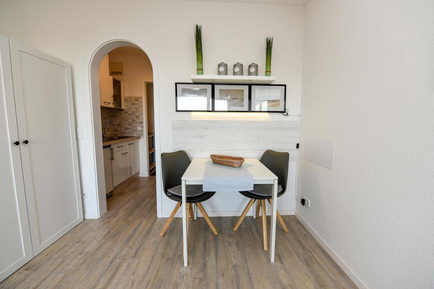 Dieses schöne 1-Raum-Appartement liegt im 1. OG des Hauses "Jan am Strand". Im Wohnraum befinden sich ein Essplatz, eine gemütliche Couch, ein TV, sowie ein solides Schrankbett (140cm x 190cm) . Die kleine Küchennische ist separat, das Badezimmer ist mit einer Dusche ausgestattet. Zur Wohnung, die Sie bequem mit dem Fahrstuhl erreichen, gehört außerdem ein Tiefgaragen-Stellplatz mit 149cm Höhe. In der Anlage finden Sie eine Waschmaschine, die Sie gegen Gebühr nutzen können. W-LAN ist für Sie inklusive. Der Hauptzugang zum Döser Sandstrand befindet sich in Sichtweite.