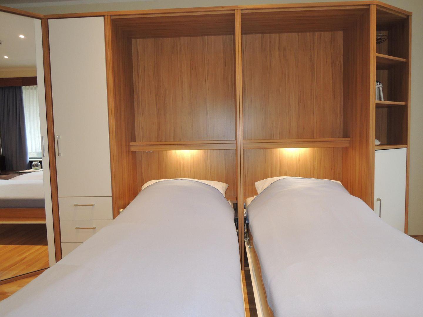 Modern eingerichtetes und bedingt behindertengerechtes 1- Zimmer-Appartement im Erdgeschoss mit großem Balkon. Im Wohn-/Schlaf-/ Essbereich gibt es ein einzeln klappbares Doppelschrankbett, ein Sofa mit passendem Sessel, sowie einen Esstisch. Zum Kochen gibt es eine Kochnische, welche mit einem Ceranfeld Herd mit zwei Platten ausgestattet ist. Das Appartement hat ein neues WC/Duschbad. Es gibt natürlich einen Kabel-Flach- TV und W-LAN. Der dazugehörige PKW Stellplatz in der Tiefgarage hat eine Einstellhöhe von 1,49.m