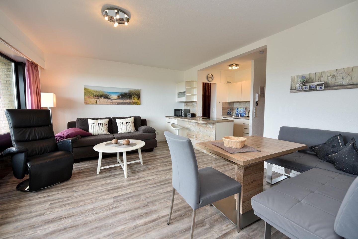 Freundliches 2-Zimmer Appartement im 1. OG mit großem Balkon und eingeschränkter Sicht auf den Weltschifffahrtweg. In 2018 wurde dieses freundliche Appartement grundsaniert und verfügt u.a. über einen allergikerfreundlichen Vinylboden. Im Wohn-/ Essbereich befindet sich eine integrierte und voll ausgestattete Küche, sowie ein Schlafsofa (140cm x 200cm), ein Sessel und eine Eckbank mit einem Stuhl. Das Schlafzimmer ist mit einem Doppelbett und einen weiteren TV -Gerät ausgestattet. Das Duschbad hat eine bodentiefe Dusche. Der kostenlose Tiefgaragenstellplatz hat eine Einstellhöhe von 149 cm, Der Eigentümer stellt seinen Gästen aber auch einen Parkausweis für den städtischen Parkplatz vor dem Haus zur Verfügung.