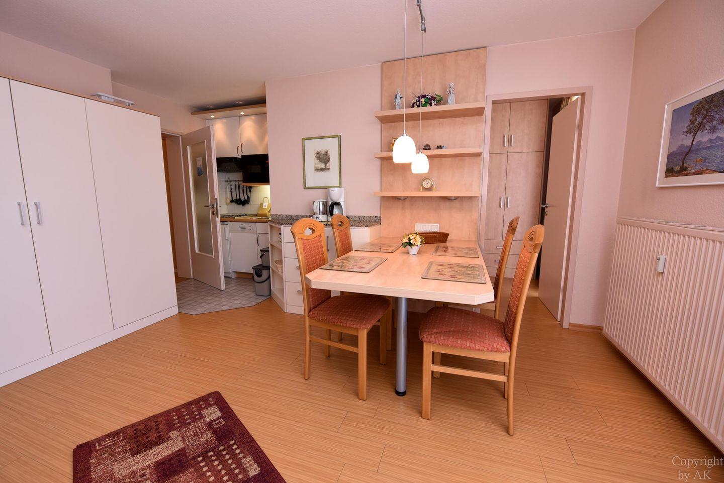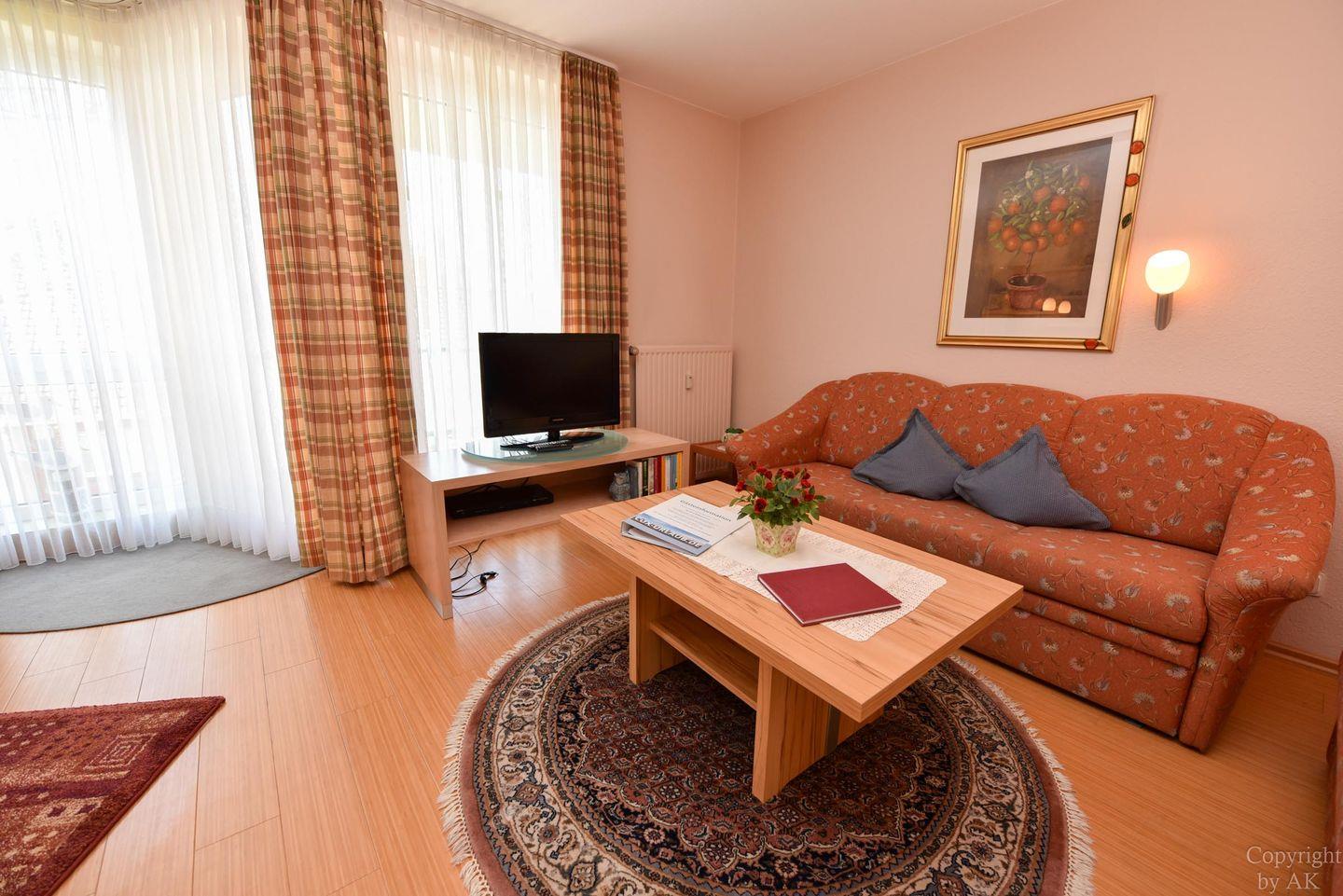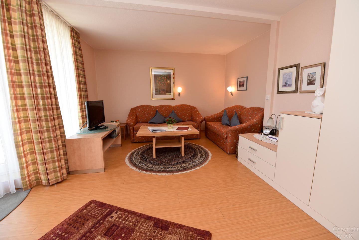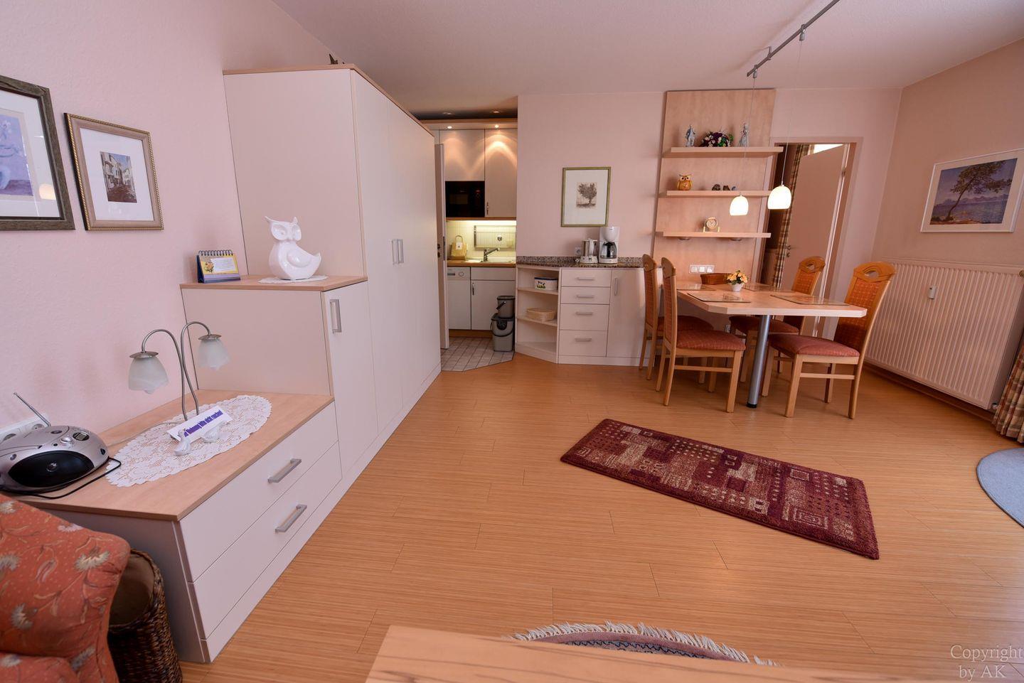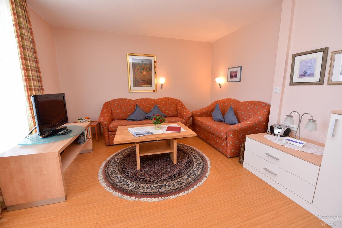 2-Zimmer-Appartement im 1. OG im Haus PAVILLON mit WLAN. Sehr komfortabler Wohn-/Ess-Schlafraum, ausgestattet mit einer Doppelschlafcouch und moderner sowie gut ausgestatteten Küchenzeile (inkl. Mikrowelle und Geschirrspüler), einem Esstisch mit Stühle. Es steht eine Hi-Fi Anlage mit CD zur Verfügung. Die bequemen Sofas laden zum Verweilen ein. Das Schlafzimmer verfügt über 2 Einzelbetten. Duschbad/WC, Kabel-TV, kleiner Balkon, Stellplatz, incl. Strandkorb (01.05.-30.09.)