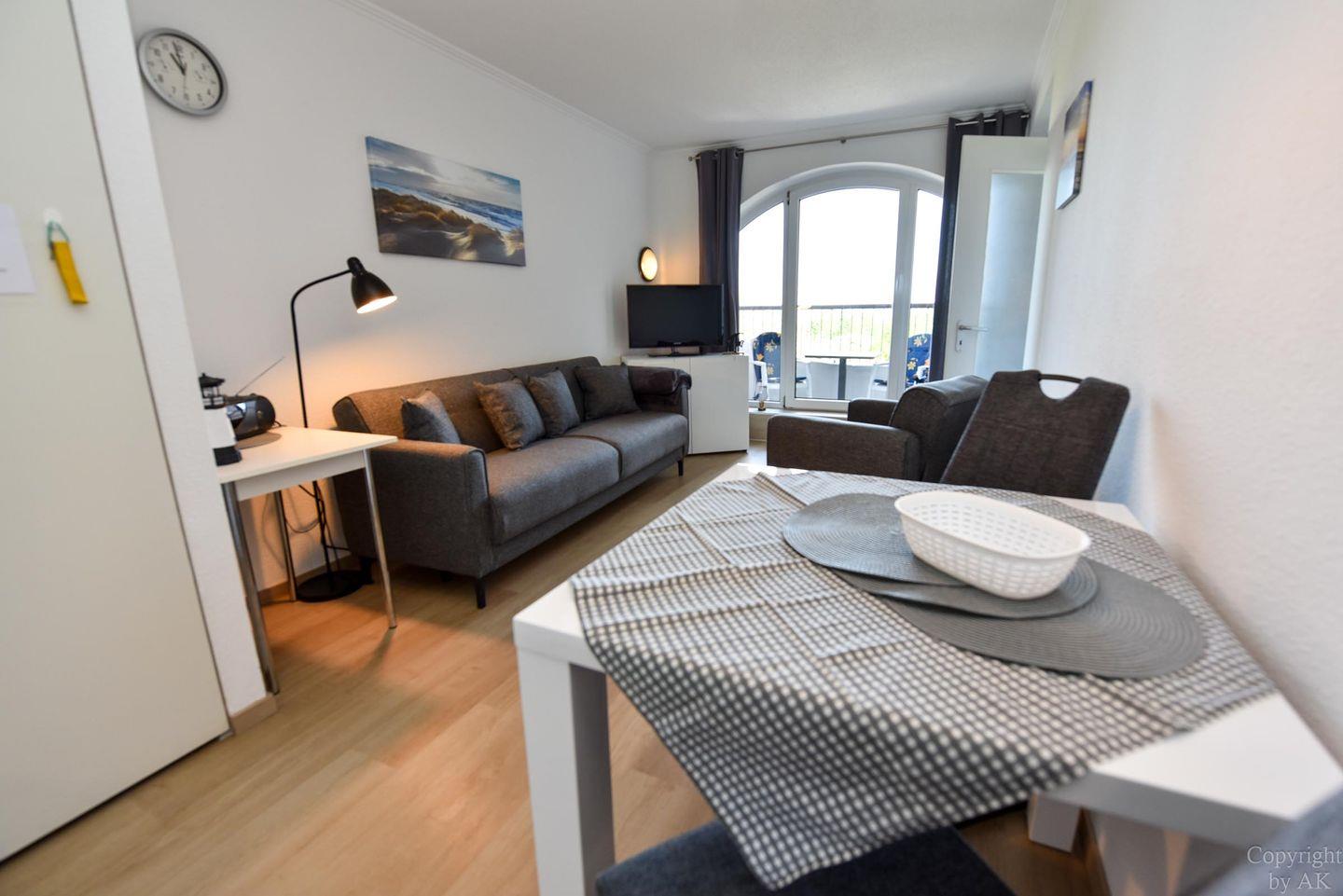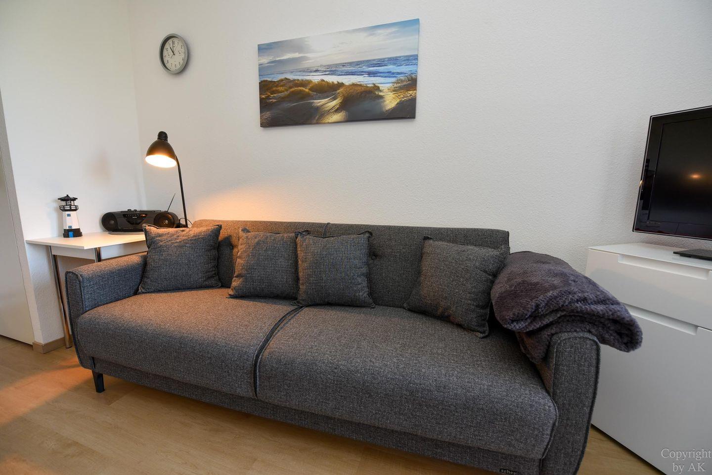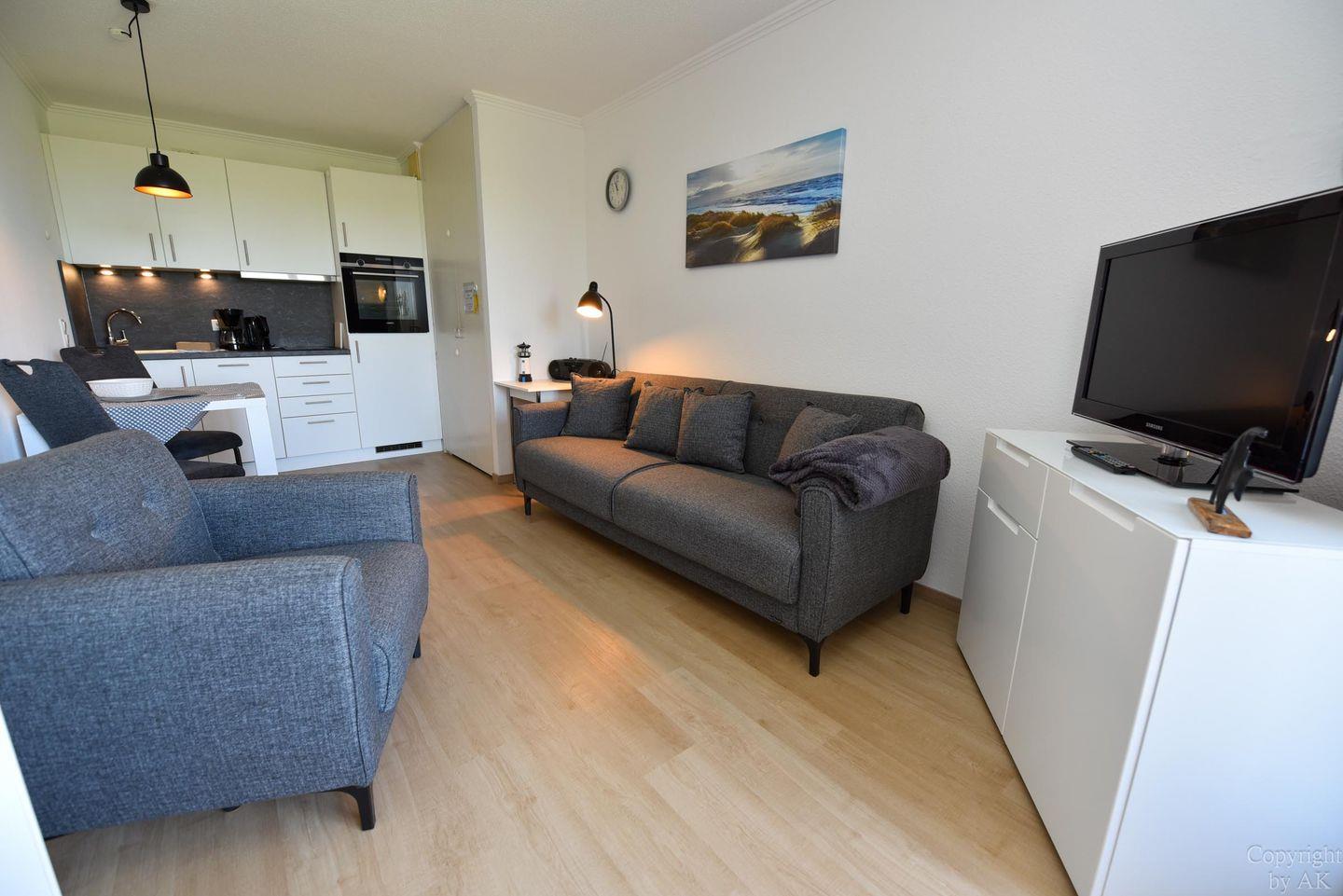 Das Ferienappartement D351 besticht durch ein modernes und klares Design. Die helle und offene Wohnfläche ist mit hochwertigen Möbeln und zeitgemäßen Annehmlichkeiten ausgestattet, um Ihren Aufenthalt so angenehm wie möglich zu gestalten. Das Wohnzimmer bietet ein komfortables Sofa und einen Flachbild-TV – ideal für entspannende Abende nach einem Tag am Meer. Eine voll ausgestattete Küche steht Ihnen zur Verfügung, inklusive moderner Geräte wie Herd mit Backofen und integrierter Mikrowelle und Kühlschrank, um eigene Mahlzeiten zu zaubern.