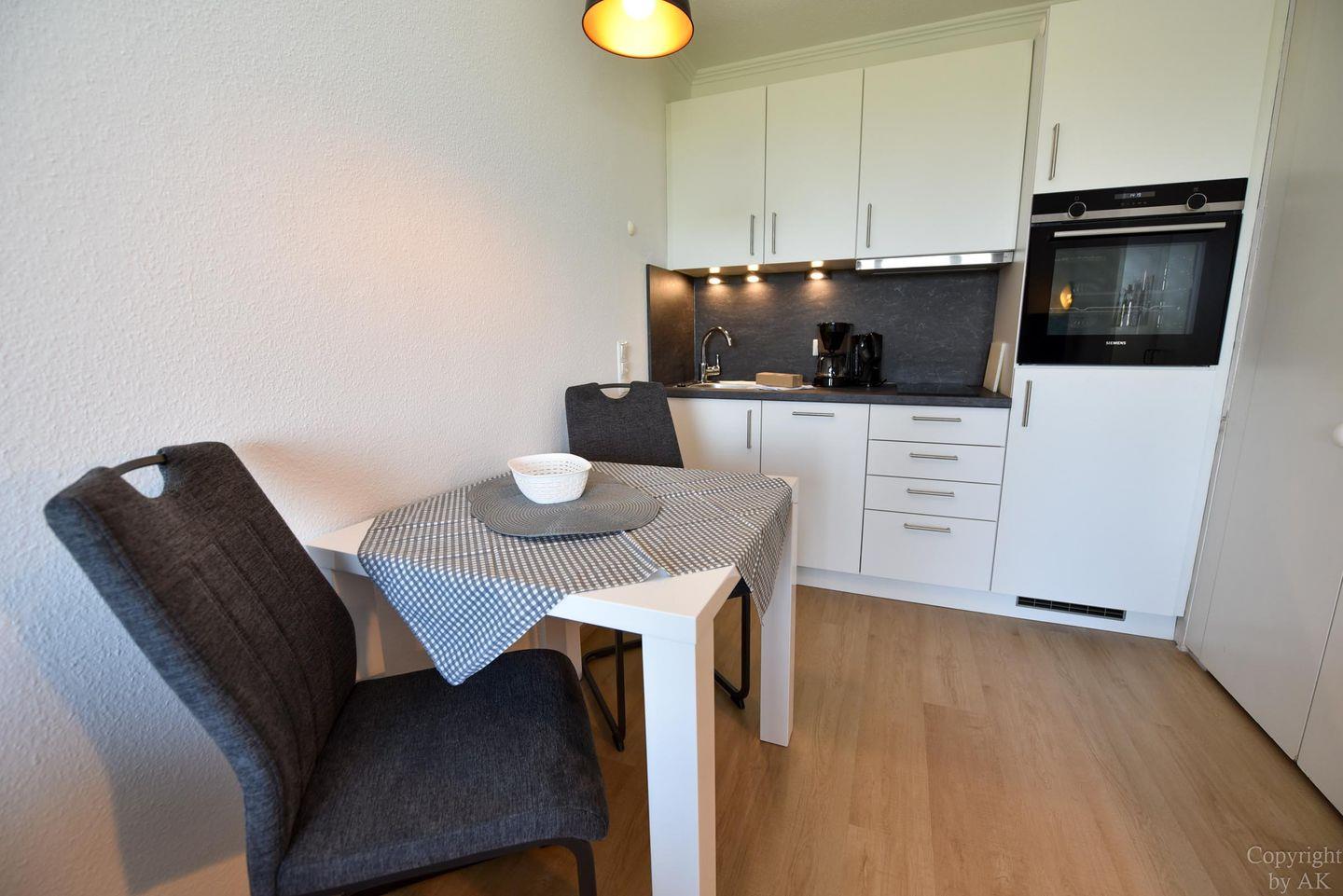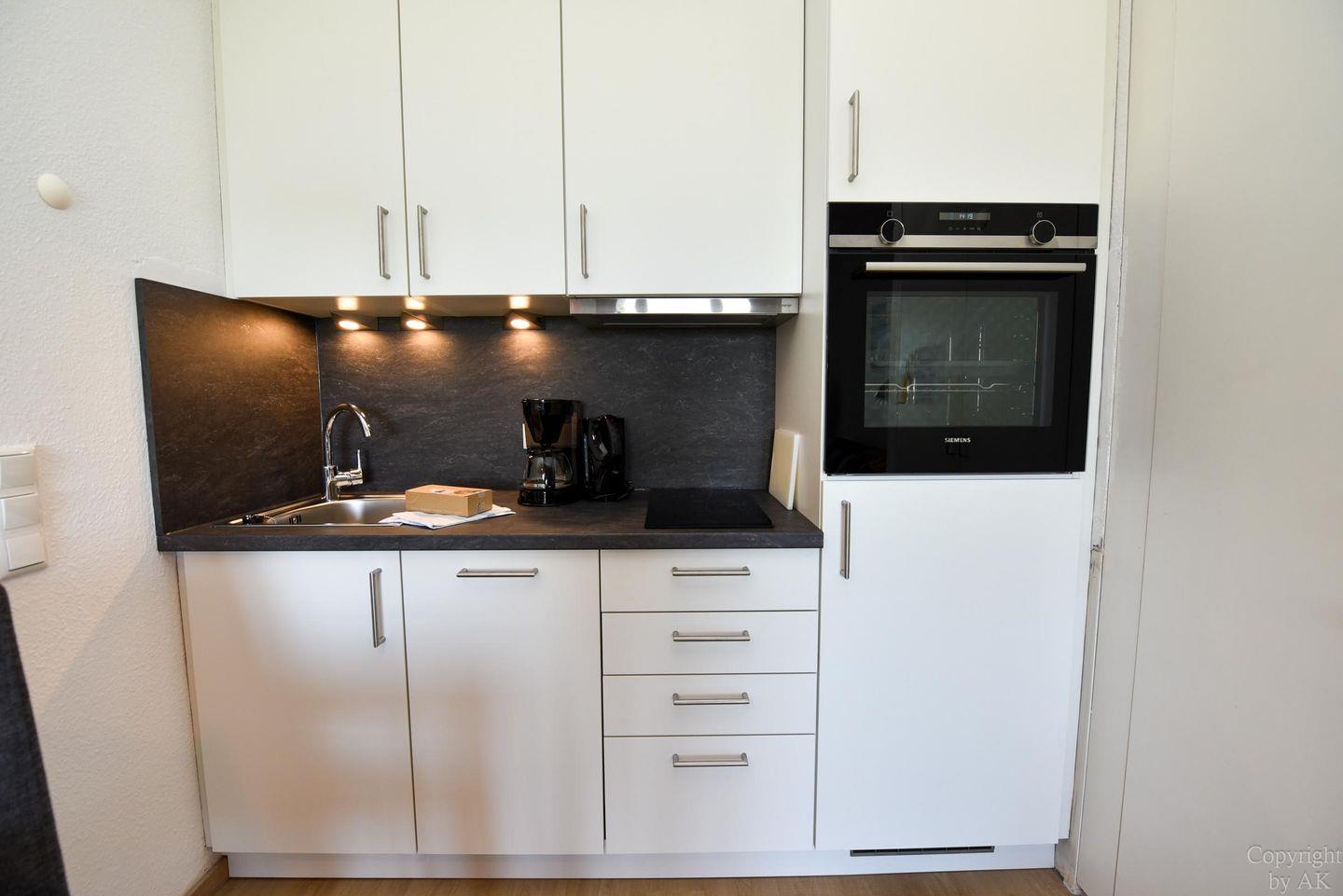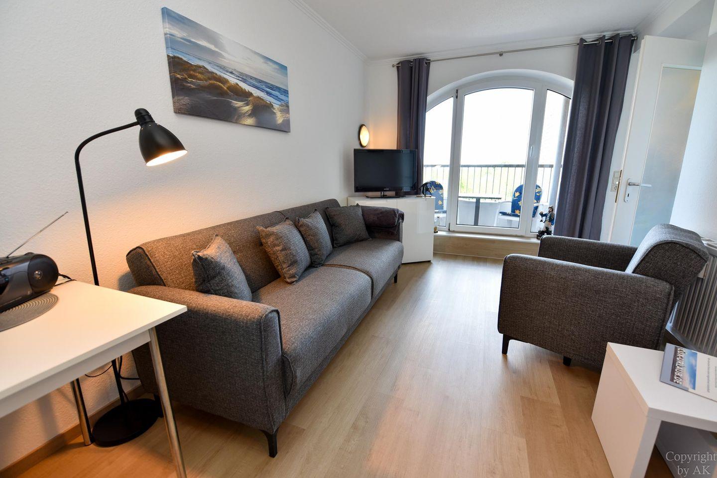 Das Ferienappartement D351 besticht durch ein modernes und klares Design. Die helle und offene Wohnfläche ist mit hochwertigen Möbeln und zeitgemäßen Annehmlichkeiten ausgestattet, um Ihren Aufenthalt so angenehm wie möglich zu gestalten. Das Wohnzimmer bietet ein komfortables Sofa und einen Flachbild-TV – ideal für entspannende Abende nach einem Tag am Meer. Eine voll ausgestattete Küche steht Ihnen zur Verfügung, inklusive moderner Geräte wie Herd mit Backofen und integrierter Mikrowelle und Kühlschrank, um eigene Mahlzeiten zu zaubern.