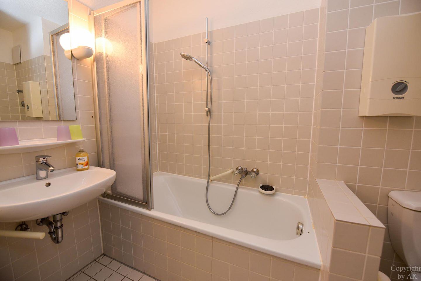 Das Badezimmer ist hell gestaltet und verfügt über eine Badewanne einen geräumigen Waschtisch und einen Haartrockner.