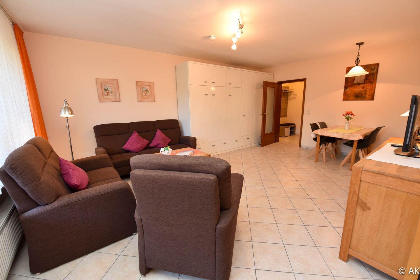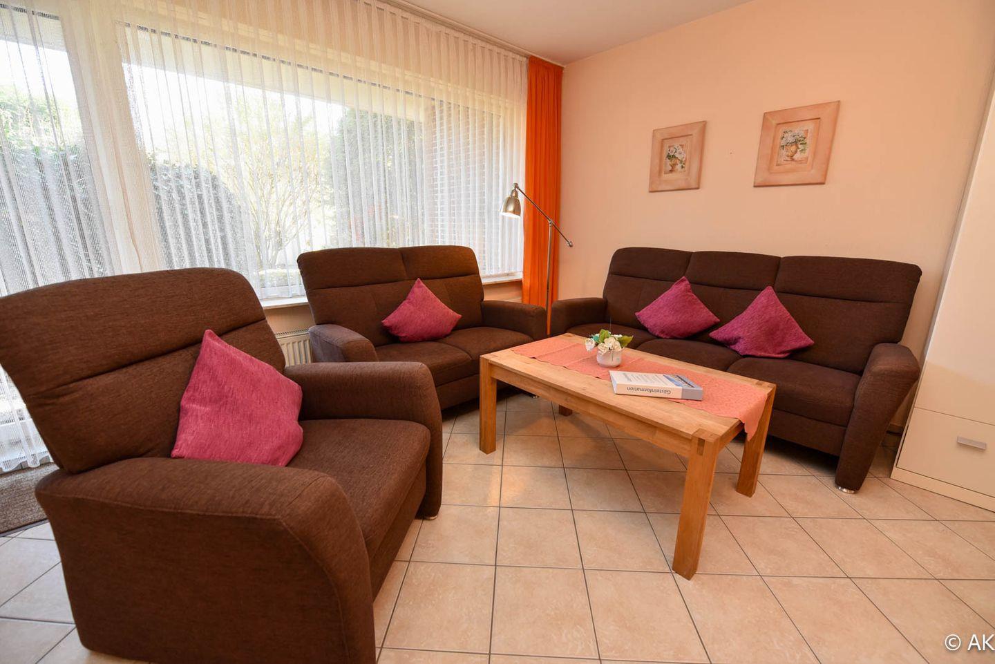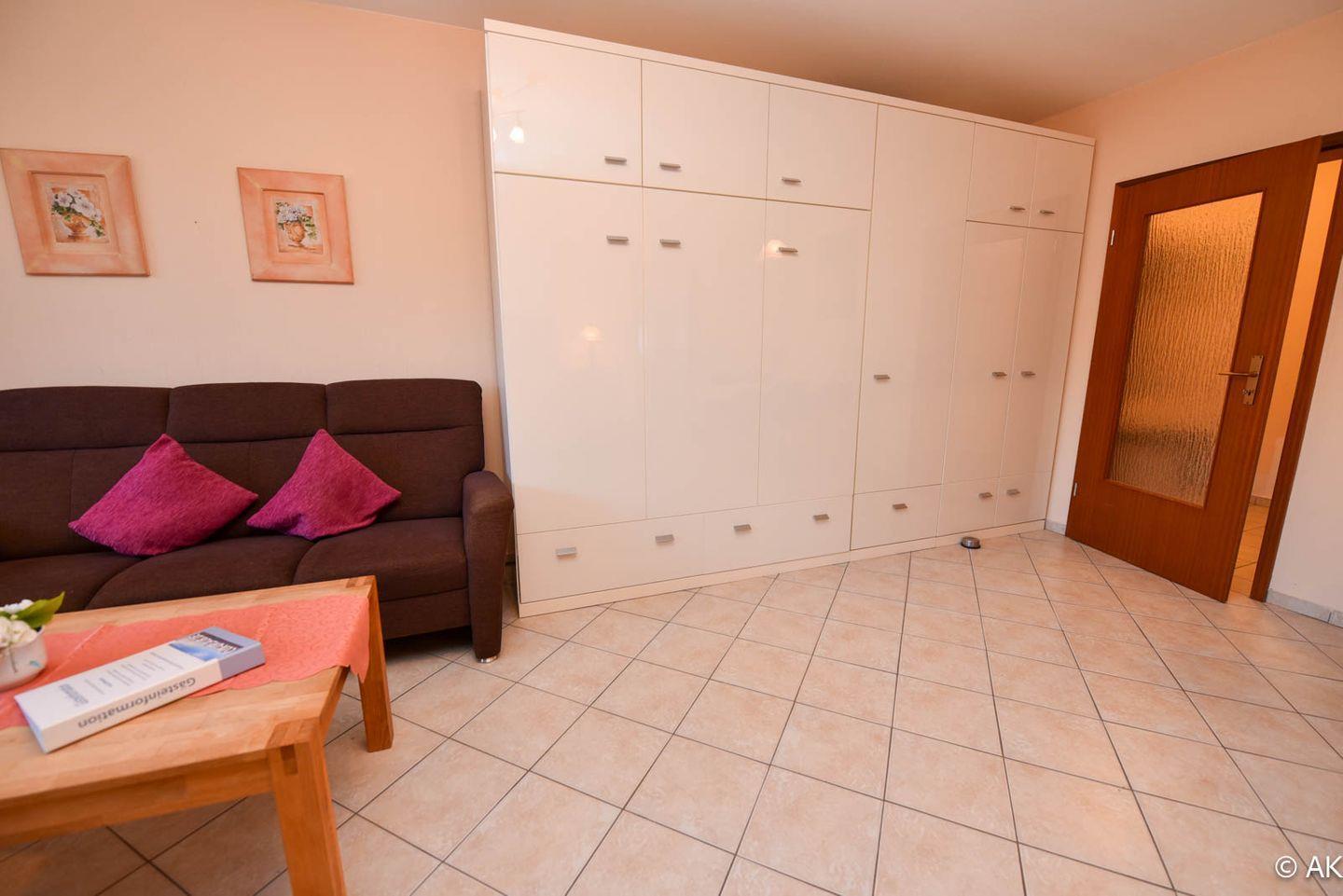 2-Zimmer-Ferienwohnung mit Terrasse im EG des Hauses LEE mit WLAN. Großzügiges und allergikerfreundlich gefliestes Appartment bestehend aus einem Wohn- /Ess-/ Schlafraum mit einem Schrankbett für 2 Personen, einer Couchgarnitur und einem Eßtisch mit 4 Stühlen. Die Küche ist mit einem Backofen, einer Mikrowelle und einem Geschirrspülautomaten ausgestattet. Das Schlafzimmer bietet zwei Einzelbetten, einen großen Kleiderschrank und zusätzlich noch Platz für eines unserer kostenfreien Kinderbetten. Ein modernes Duschbad mit WC rundet das Appartement ab. Spielrasen, Spielgerät und Sandkiste befinden sich auf dem Grundstück der Anlage. Garagenstellplatz und Schwimmbadbenutzung sind kostenfrei!