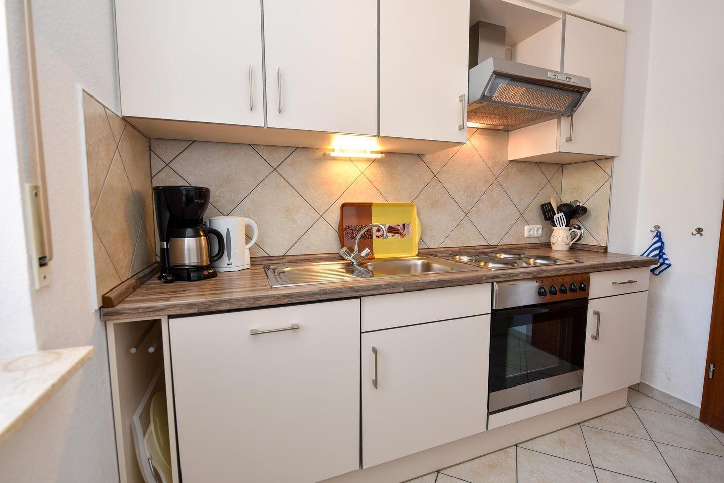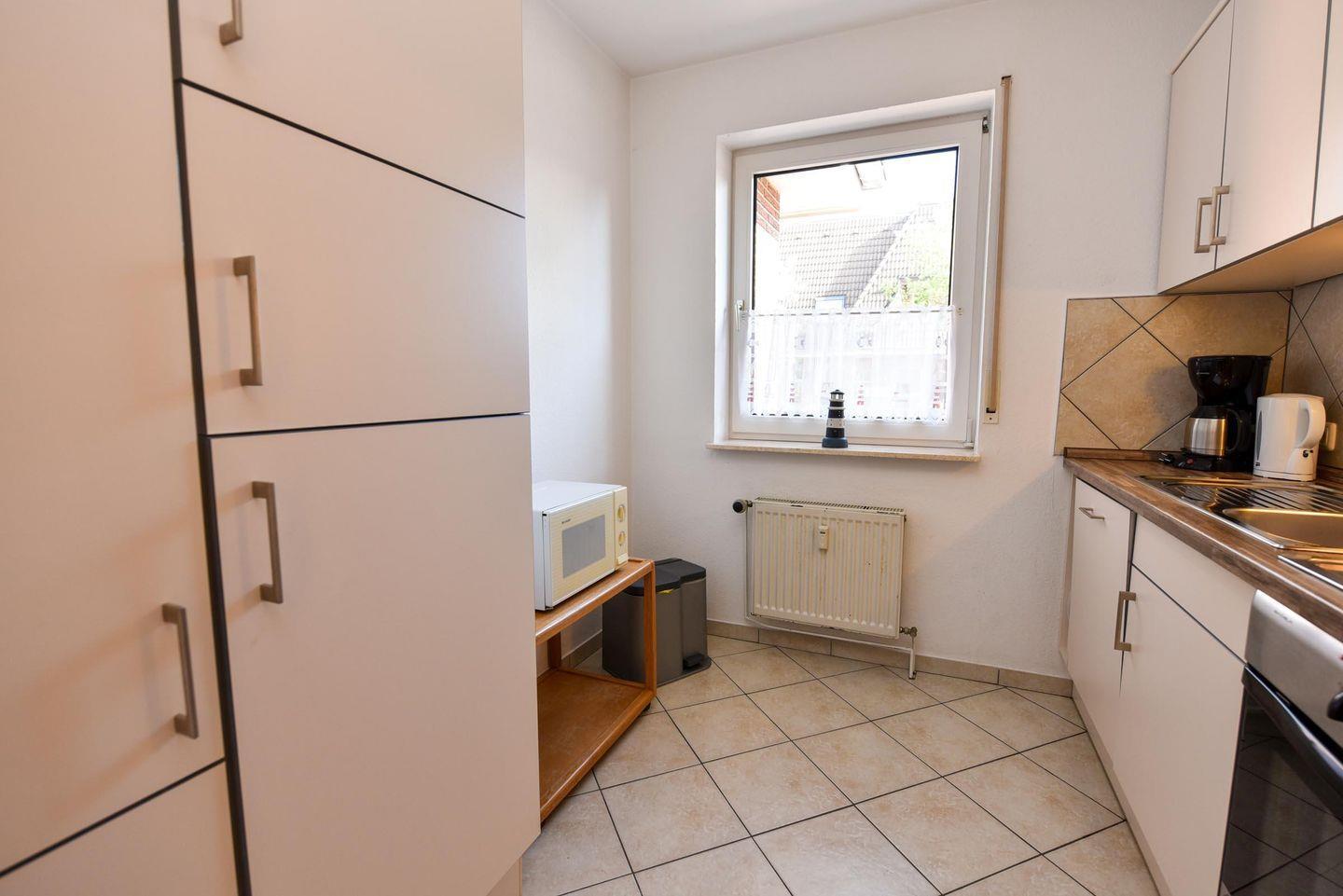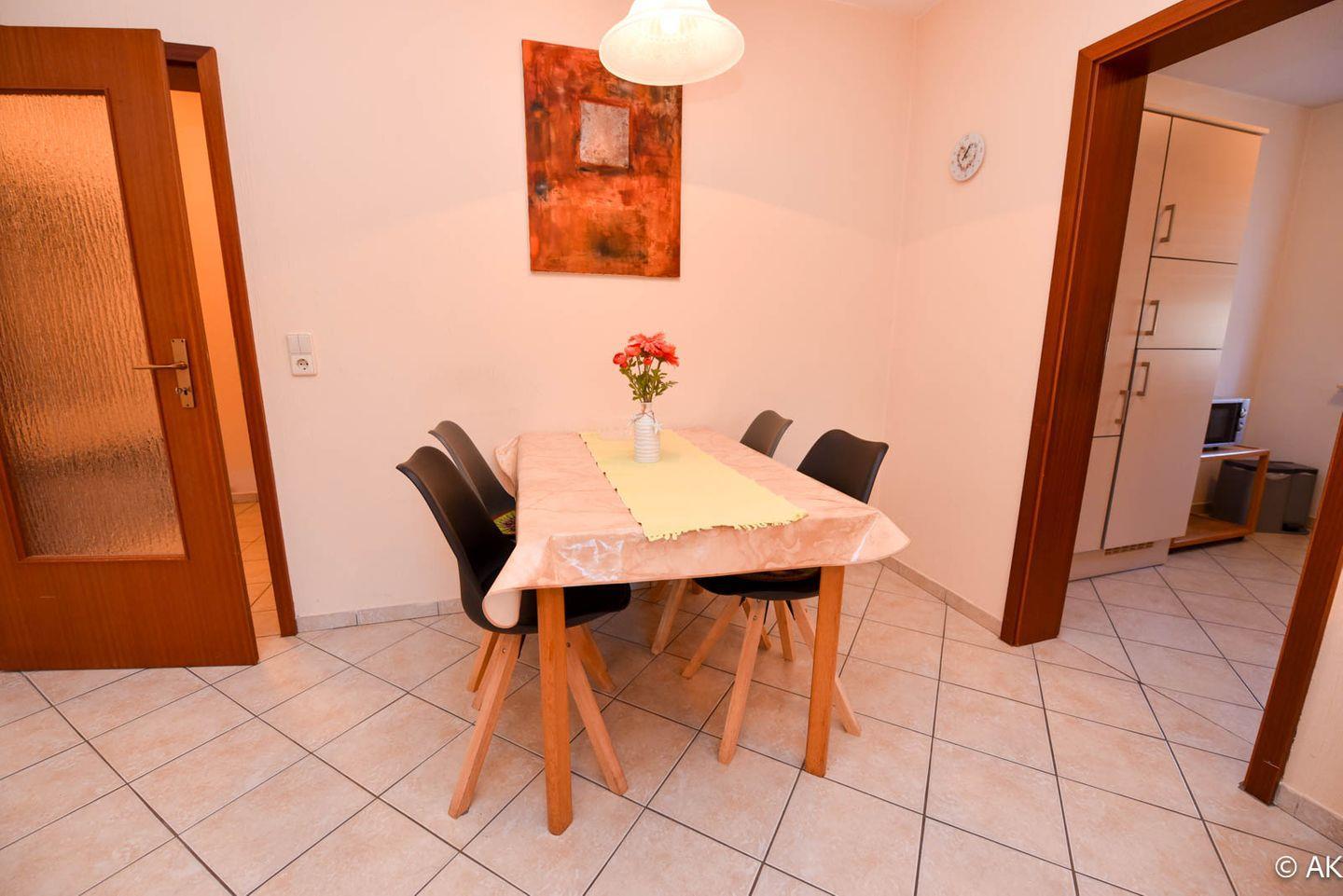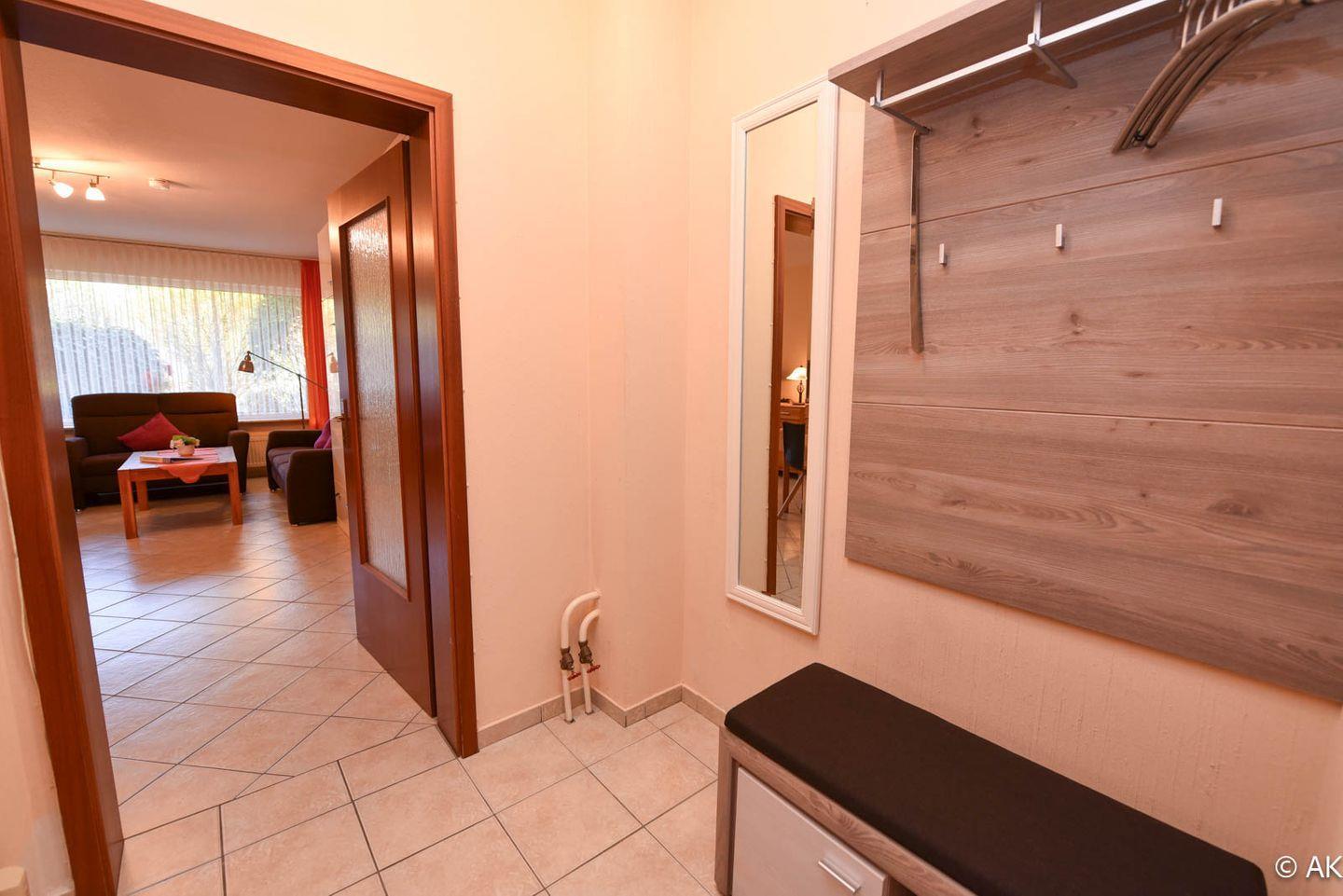 2-Zimmer-Ferienwohnung mit Terrasse im EG des Hauses LEE mit WLAN. Großzügiges und allergikerfreundlich gefliestes Appartment bestehend aus einem Wohn- /Ess-/ Schlafraum mit einem Schrankbett für 2 Personen, einer Couchgarnitur und einem Eßtisch mit 4 Stühlen. Die Küche ist mit einem Backofen, einer Mikrowelle und einem Geschirrspülautomaten ausgestattet. Das Schlafzimmer bietet zwei Einzelbetten, einen großen Kleiderschrank und zusätzlich noch Platz für eines unserer kostenfreien Kinderbetten. Ein modernes Duschbad mit WC rundet das Appartement ab. Spielrasen, Spielgerät und Sandkiste befinden sich auf dem Grundstück der Anlage. Garagenstellplatz und Schwimmbadbenutzung sind kostenfrei!