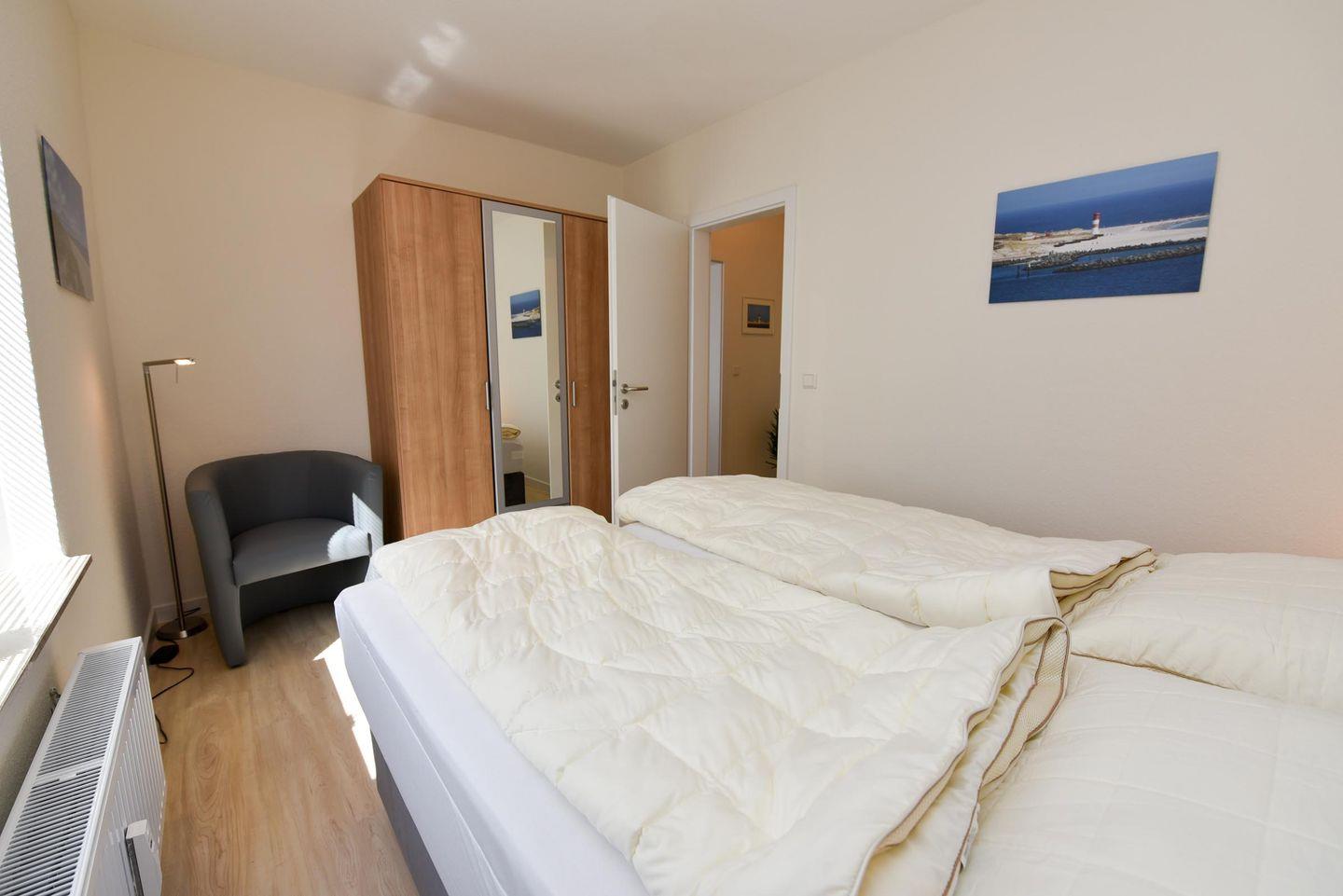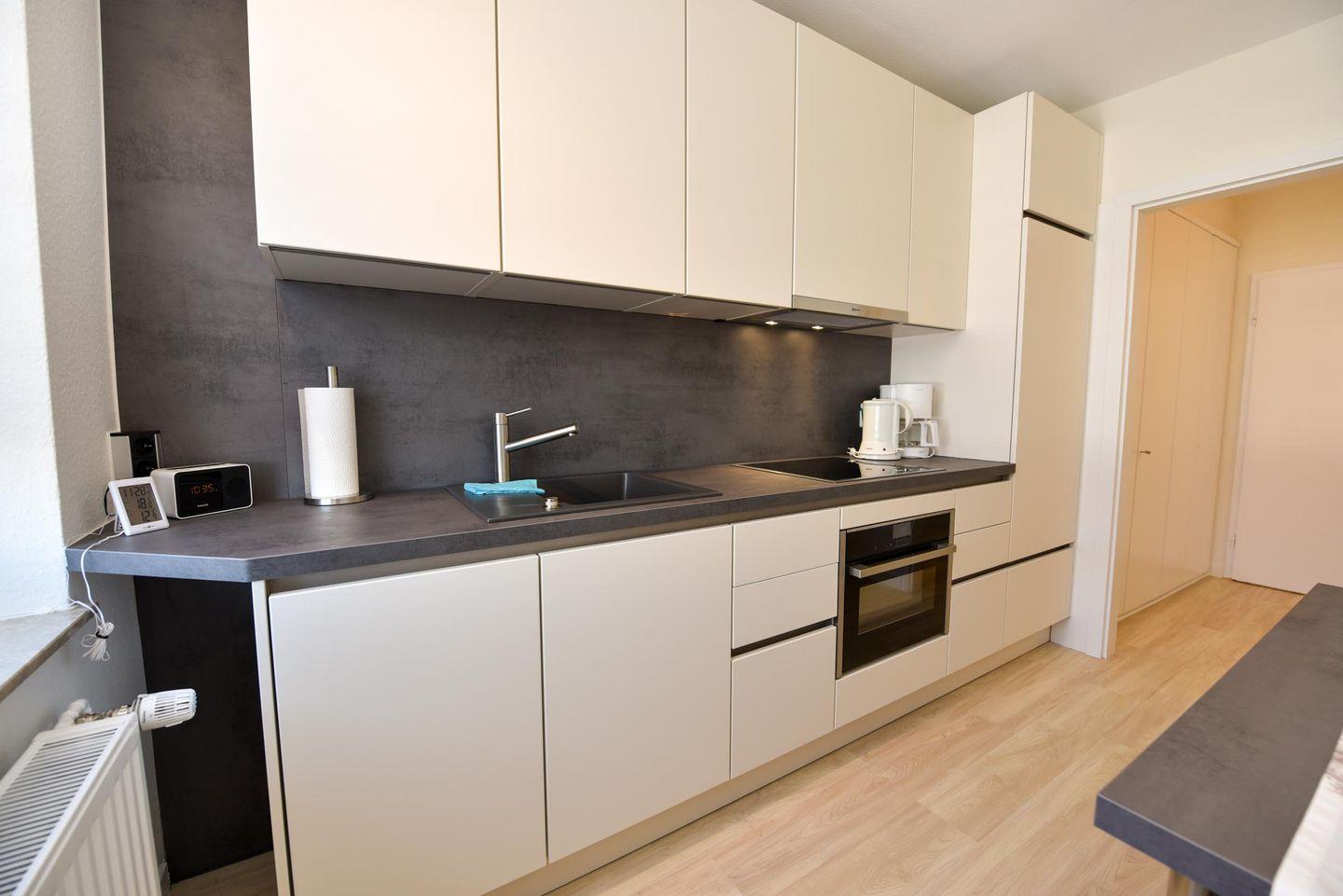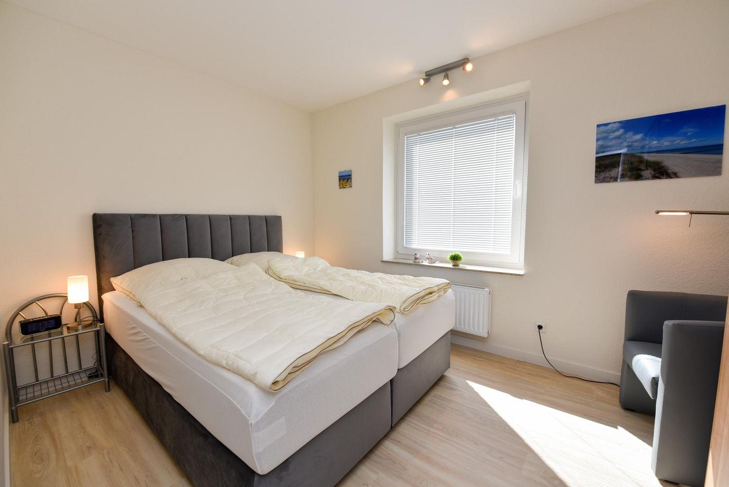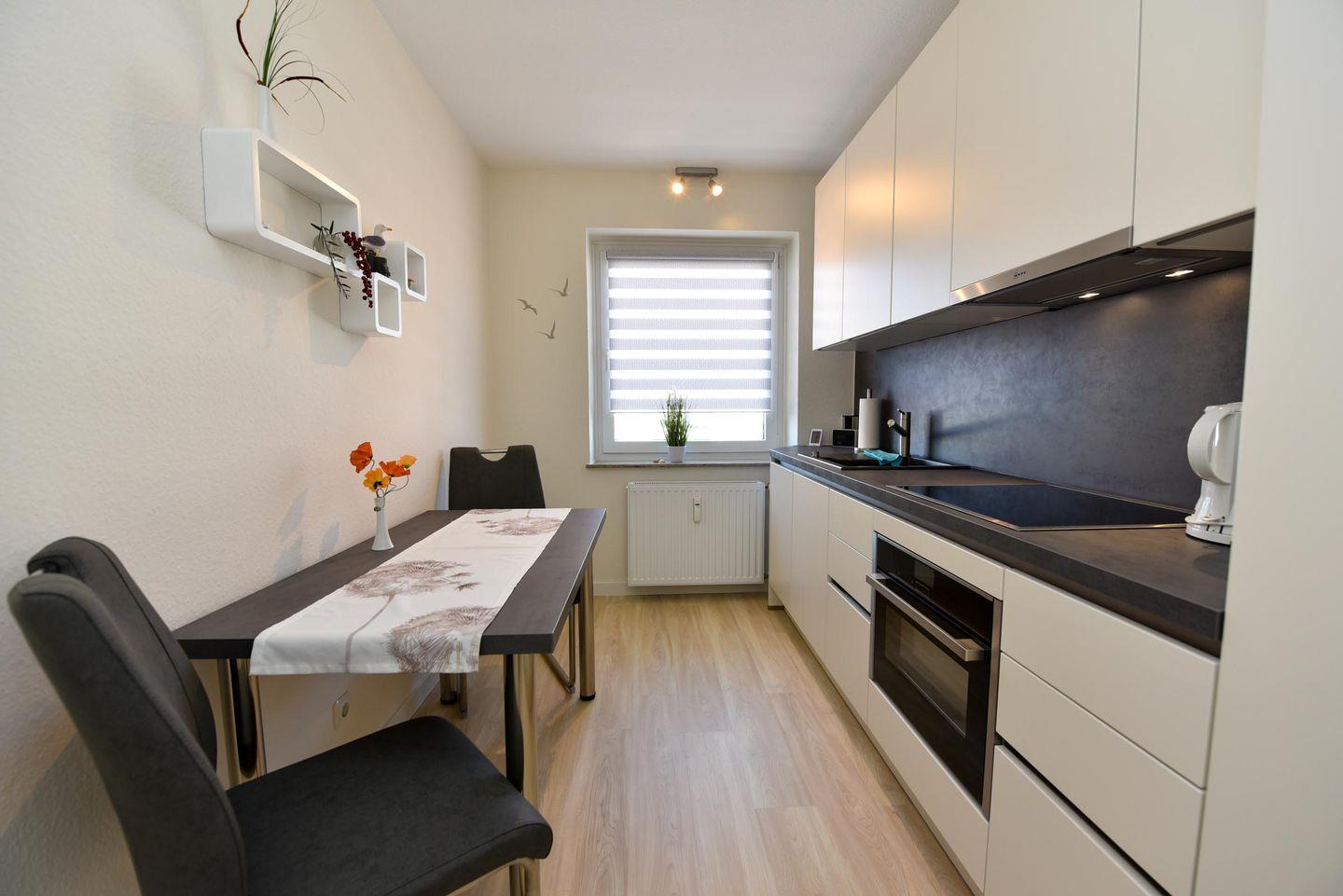 Modern renovierte 3-Raum-Ferienwohnung in Cuxhaven-Döse, mit Fahrstuhl, zwei Schlafzimmern mit Boxspringbetten, voll ausgestatteter Küche und PKW-Stellplatz.