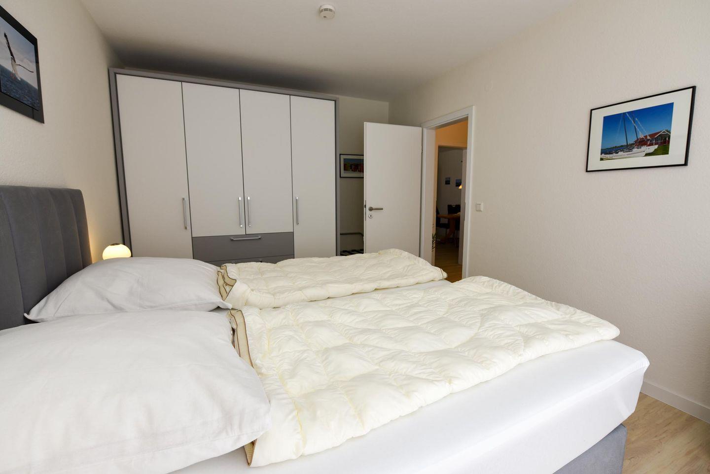 Der helle Wohnbereich lädt mit einem gemütlichen Sofa und einer separaten Essecke zum Verweilen ein. Vom ersten Flur gelangen Sie in die freundliche, voll ausgestattete Küche mit Ceranfeld, Backofen, Mikrowelle und Geschirrspüler – ideal für Selbstversorger. Über den zweiten Flur erreichen Sie die beiden Schlafzimmer, die jeweils mit komfortablen Boxspringbetten und geräumigen Kleiderschränken ausgestattet sind – perfekt für erholsamen Schlaf und ausreichend Stauraum.