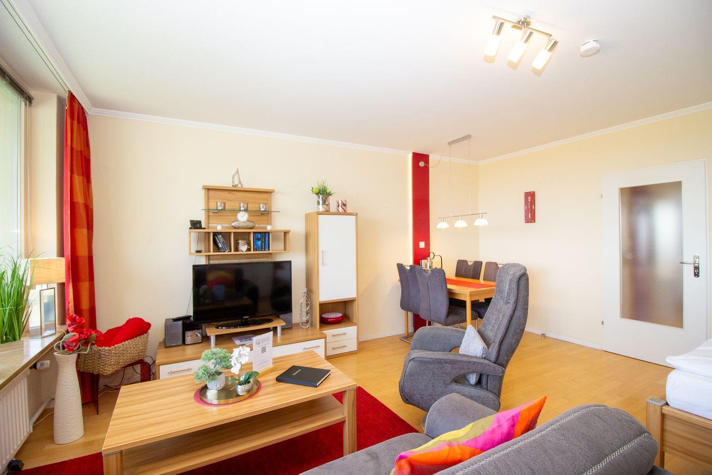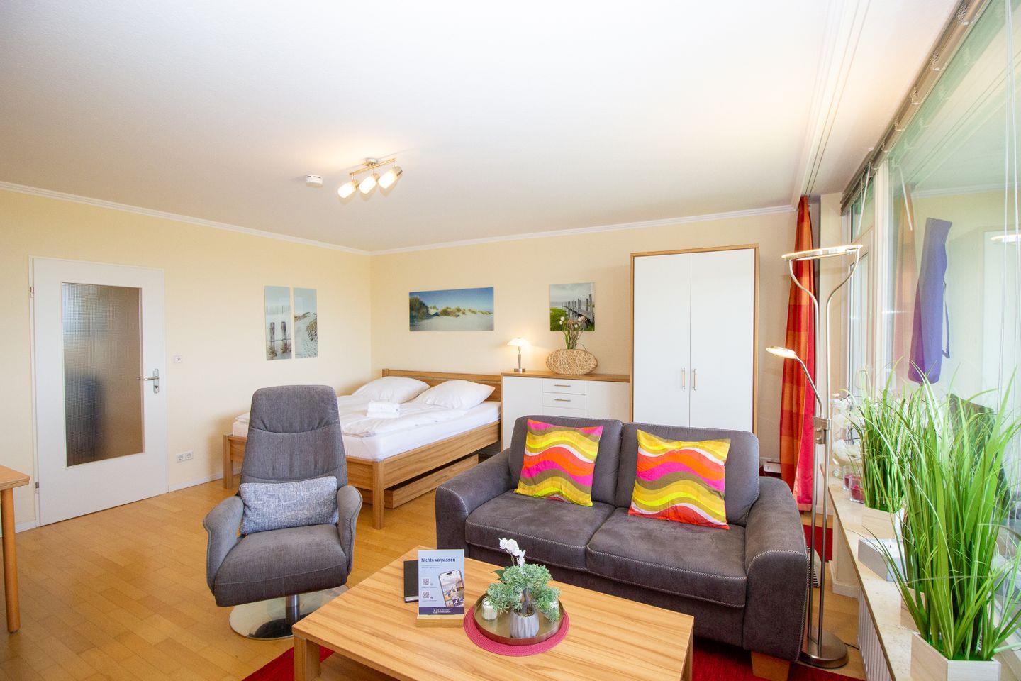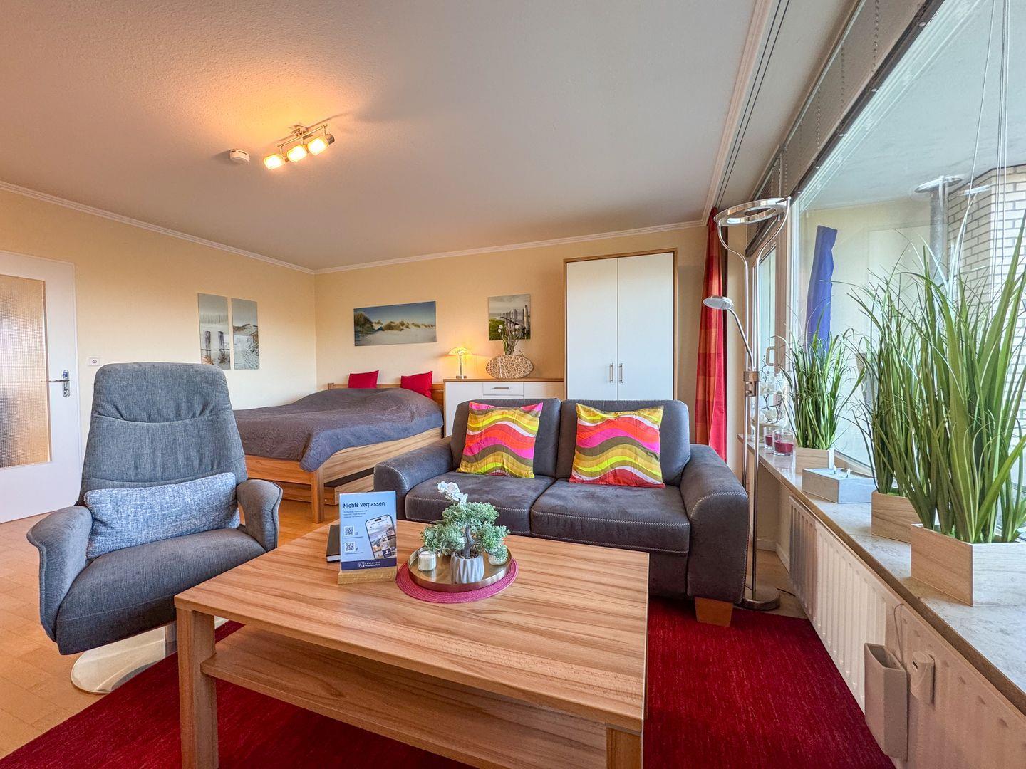 Diese Ferienwohnung bietet neben dem (durch Baumkronen eingeschränkten) Ausblick auf die Nordsee direkte Strandnähe auf 45 m² mit einer modernen Einrichtung in ansprechenden Farben. Die Wohnung bietet Platz für bis zu 2 Personen.