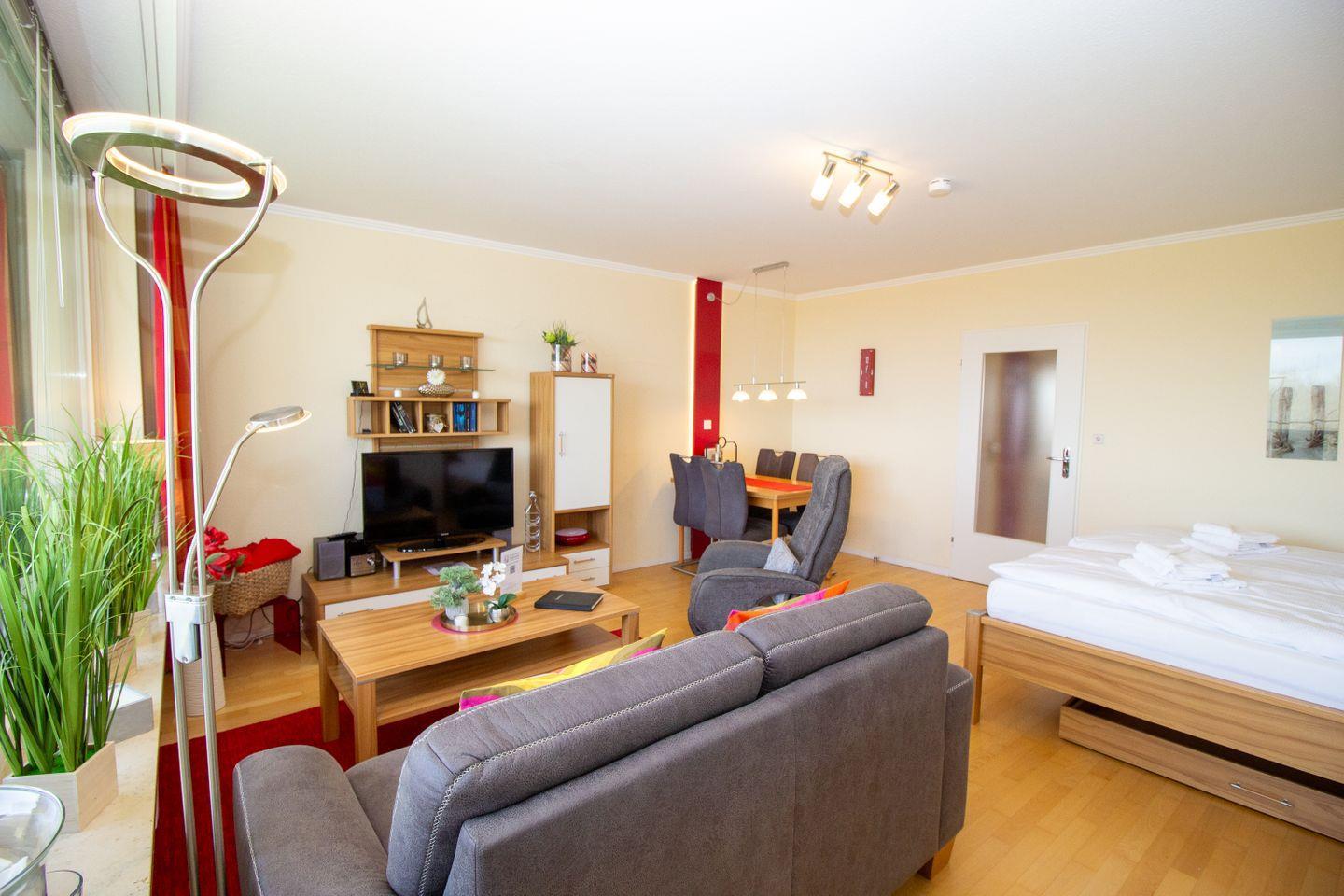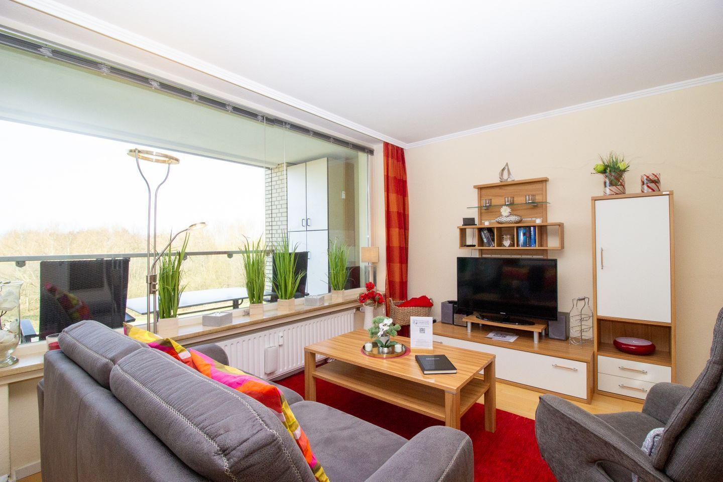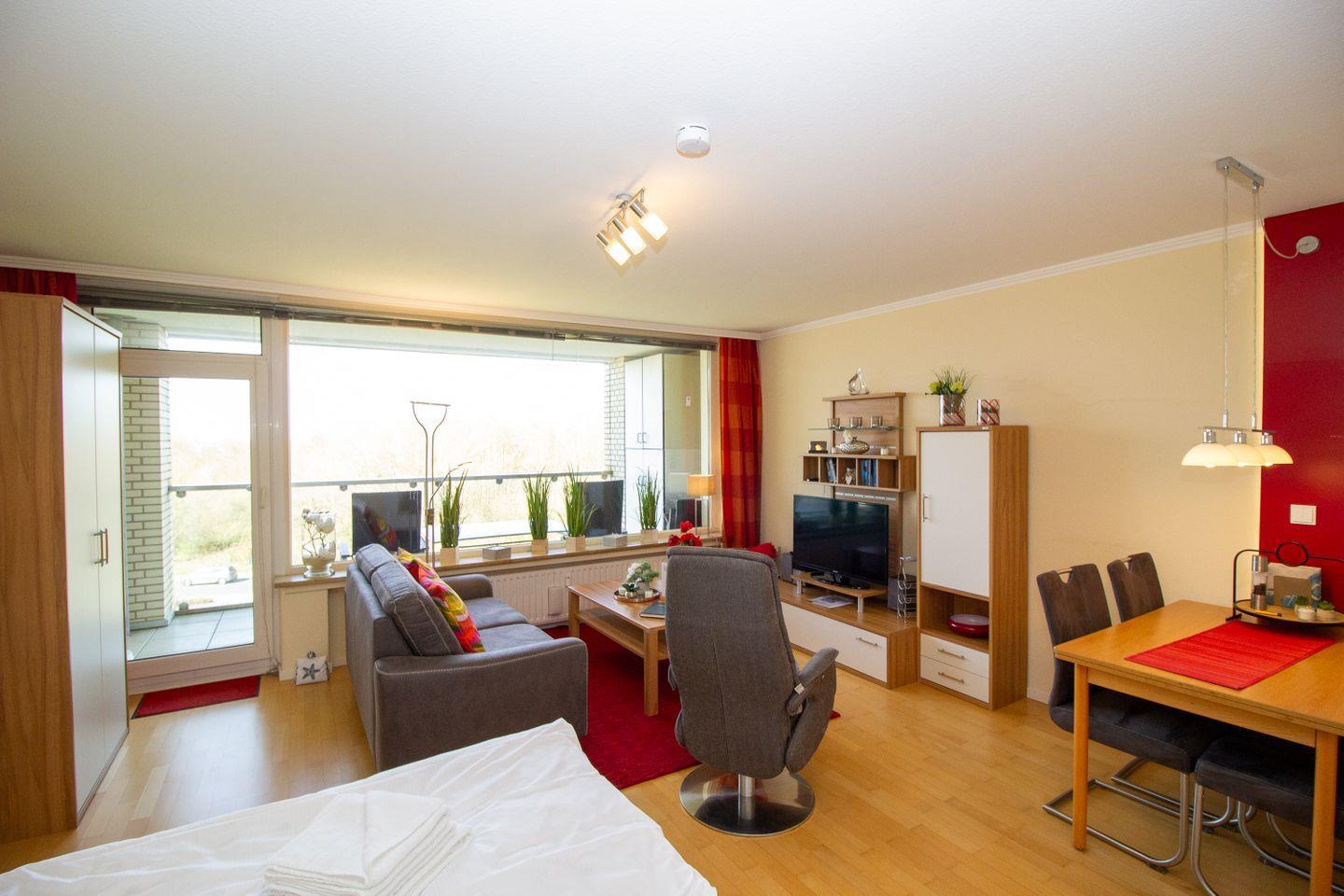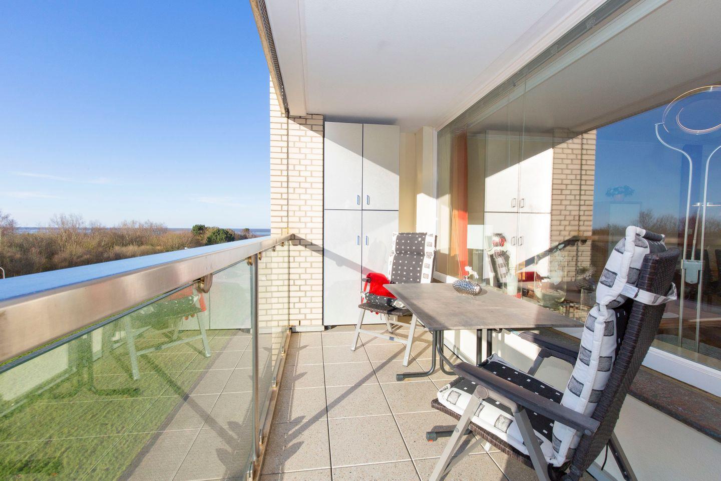 Moderne Ferienwohnung im Strandhochhaus Cuxhaven-Döse mit Balkon und Strandnähe für erholsame Tage am Meer.