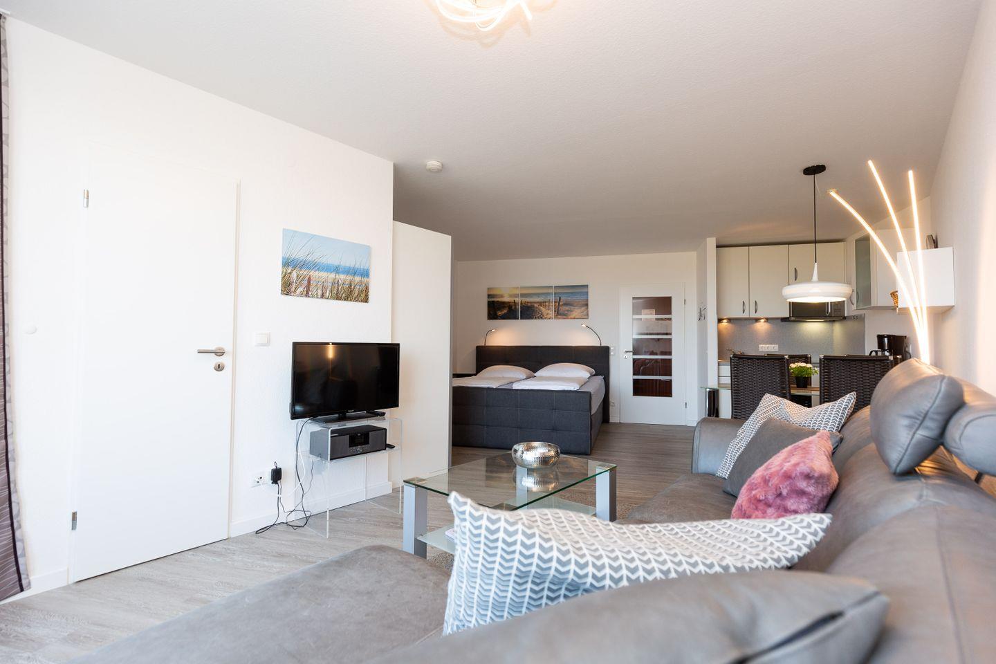 Modernes 2-Zimmer-Apartment in Cuxhaven-Döse mit Meerblick, Schwimmbad, Sauna und Balkon, nur 200 m vom Strand entfernt.