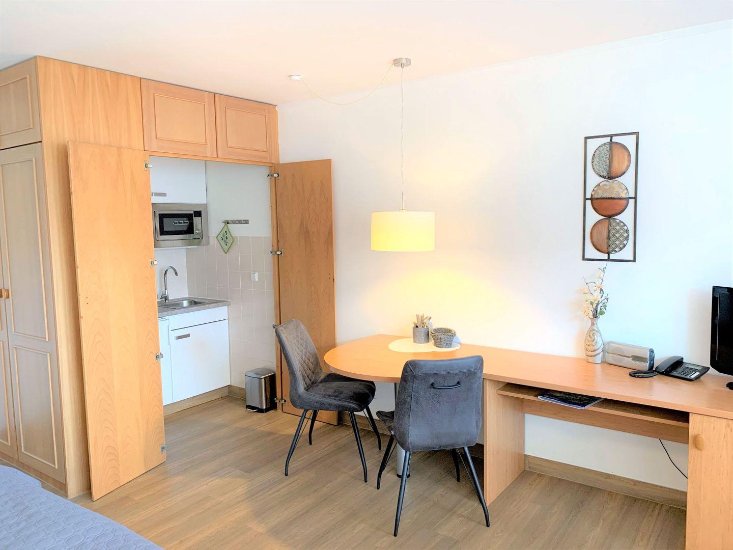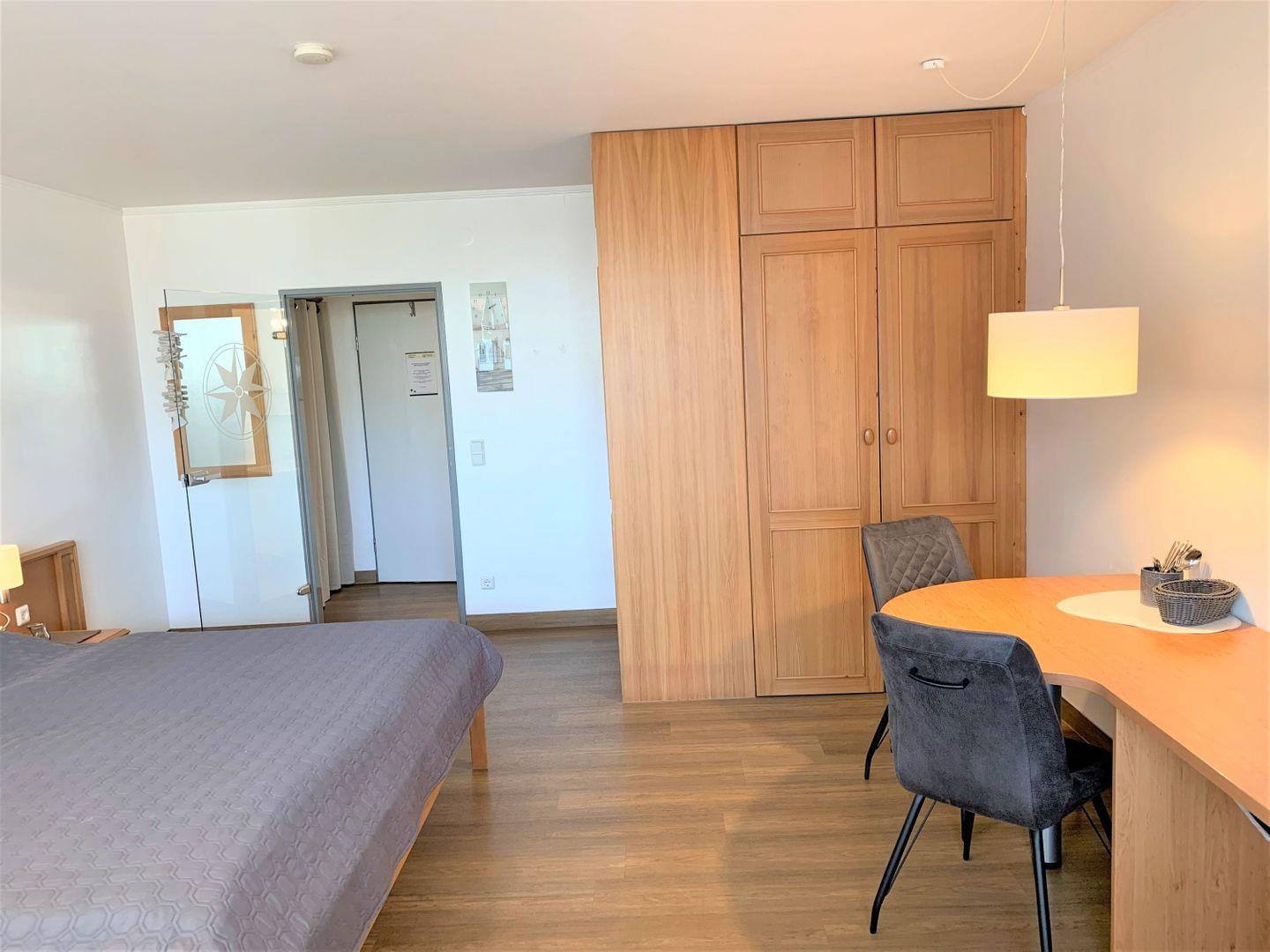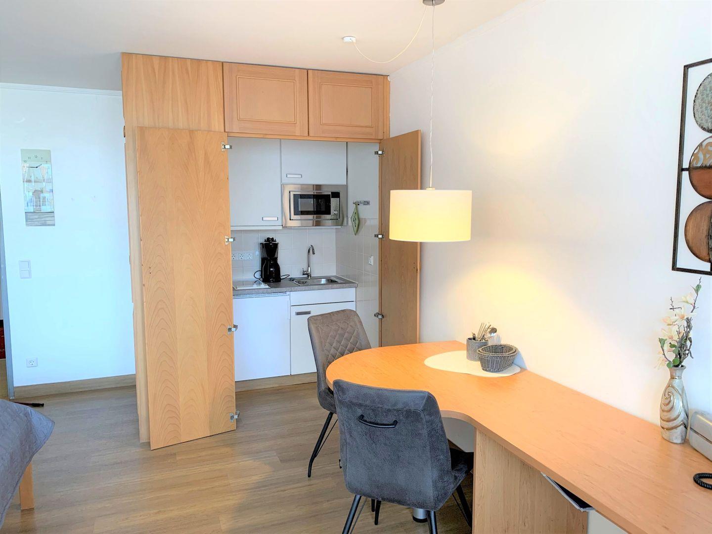 Haus "Trafalgar", Typ A-Ost, Appartement-Nr. 231, bis 2 Pers., 2.Etage, ca.34 qm, Ostseite (ohne Meerblick), Wohn/Schlafbereich mit fest stehendem Komfortbett (2 mal 100 x 200 cm), Küchenpantry mit Mikrowelle, Dusche/WC, Balkon, Flachbildschirm, kostenl. WLAN-Zugang im App., Tiefgaragenstellplatz, Strandkorb im Sommer 2026, ab 5 Übernachtungen 1 Wäschepaket p.P. inkl.