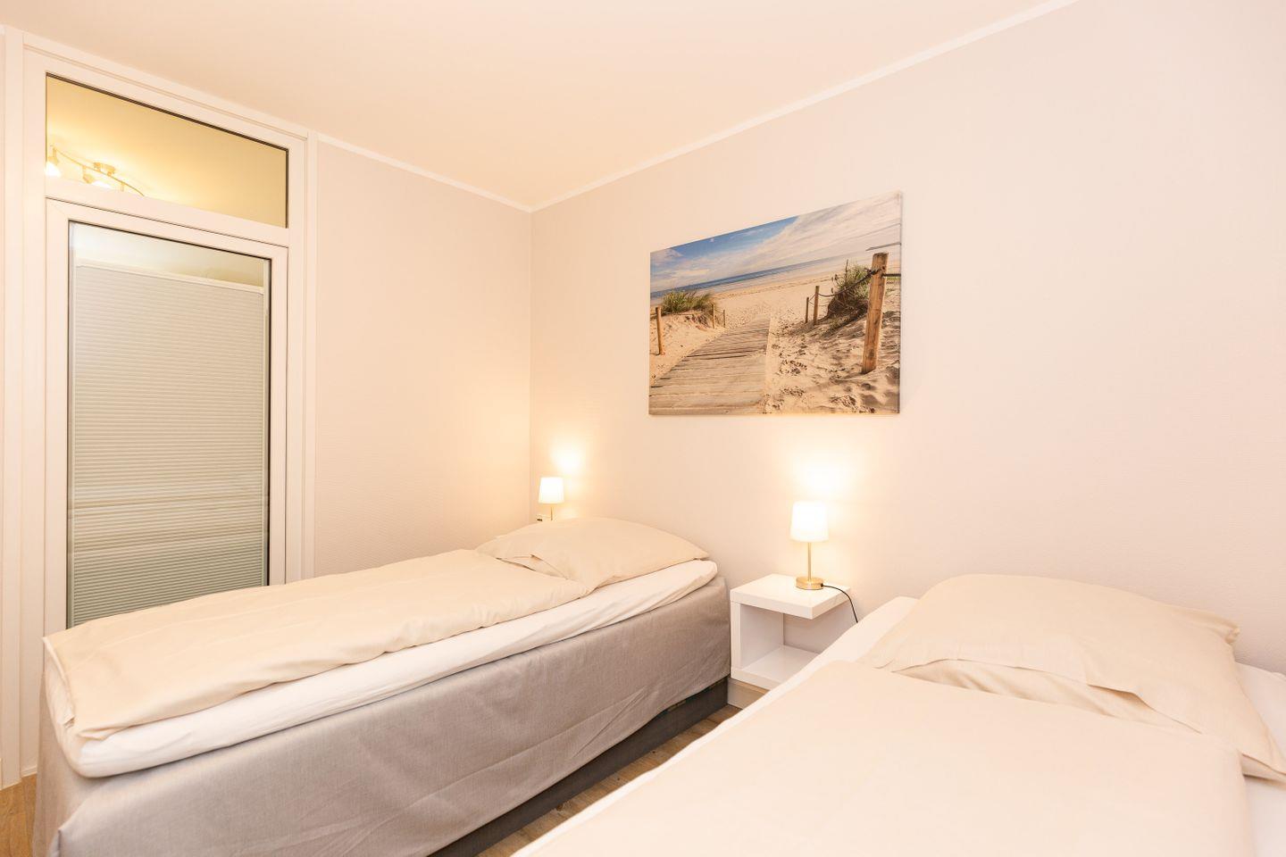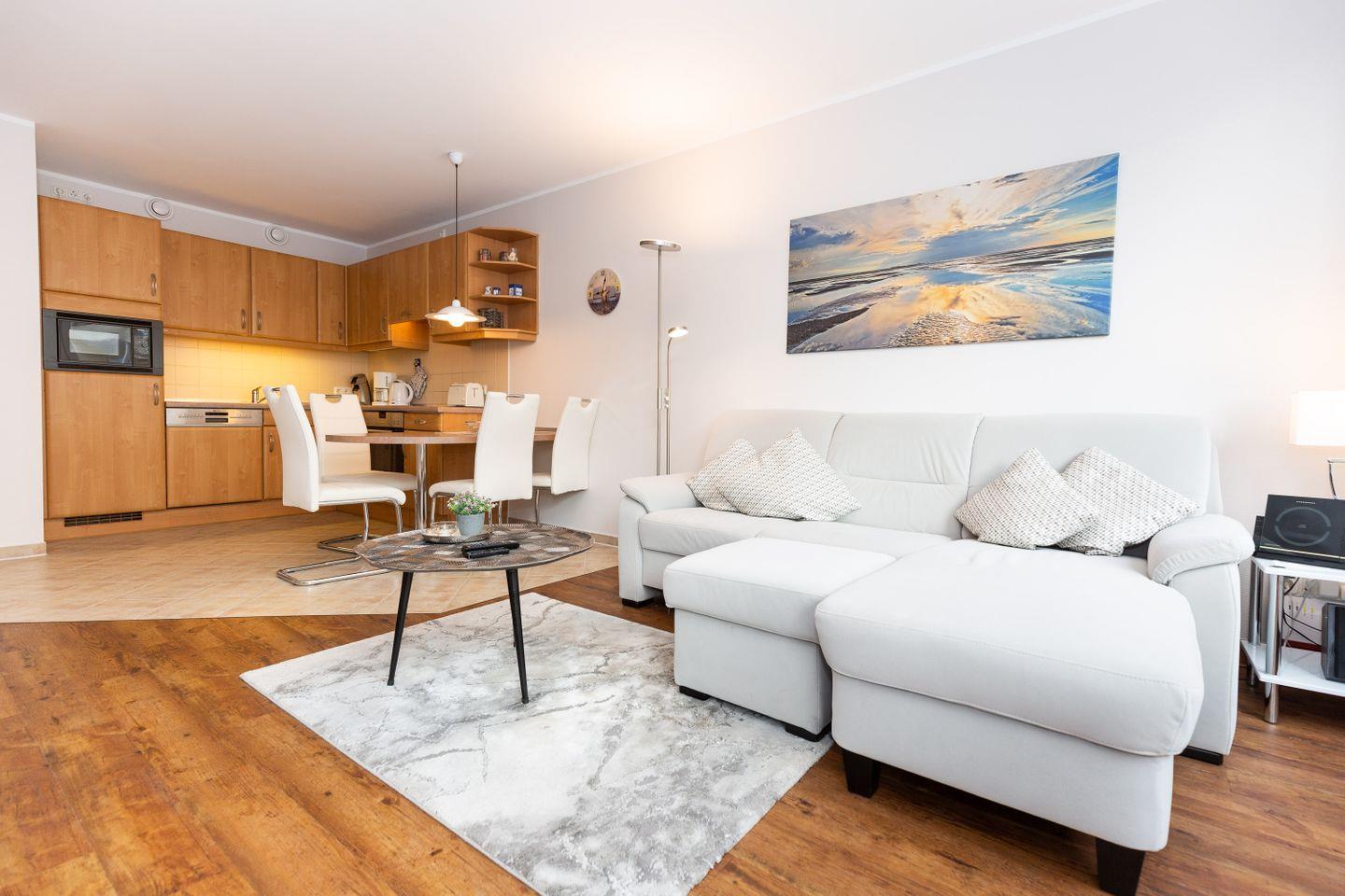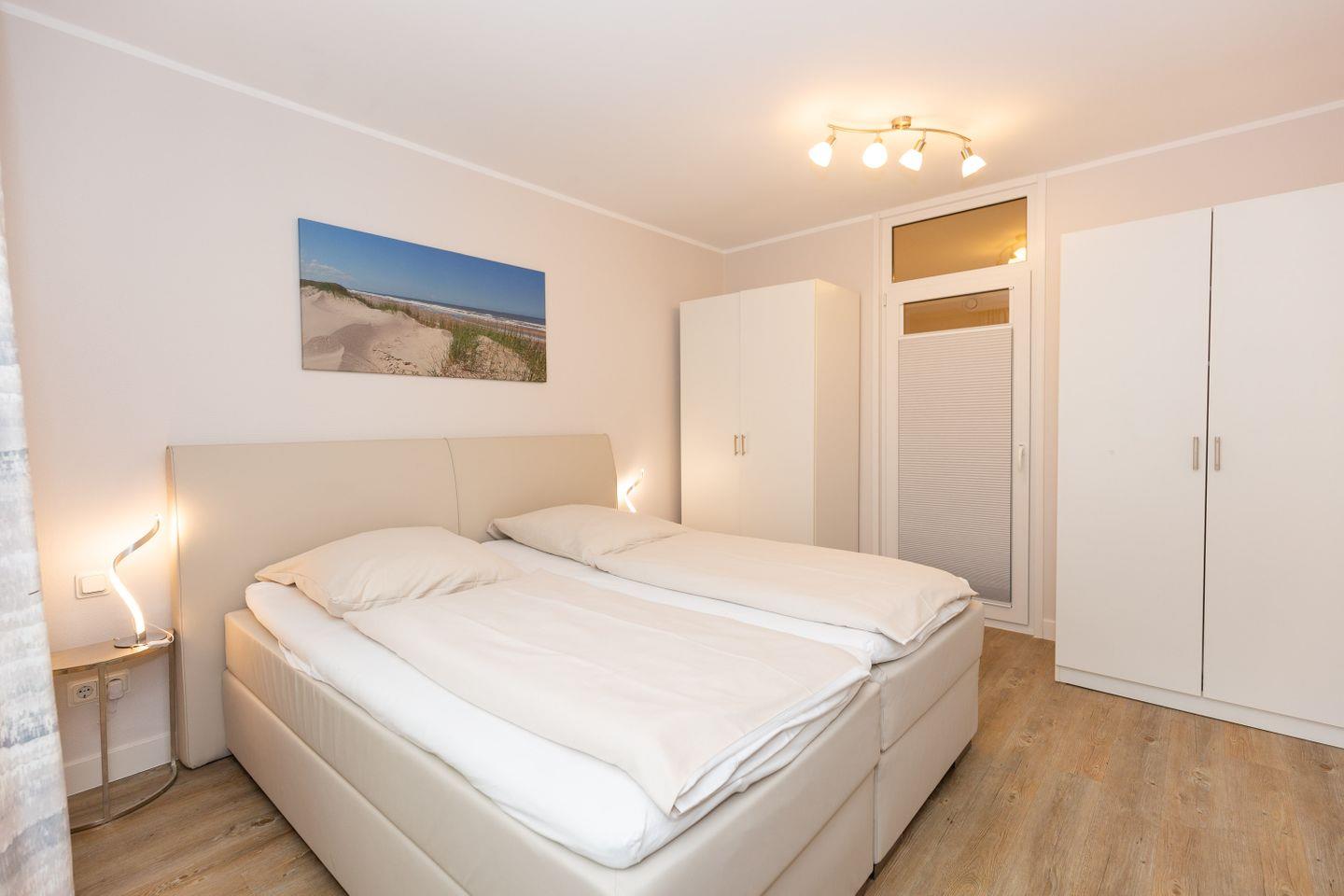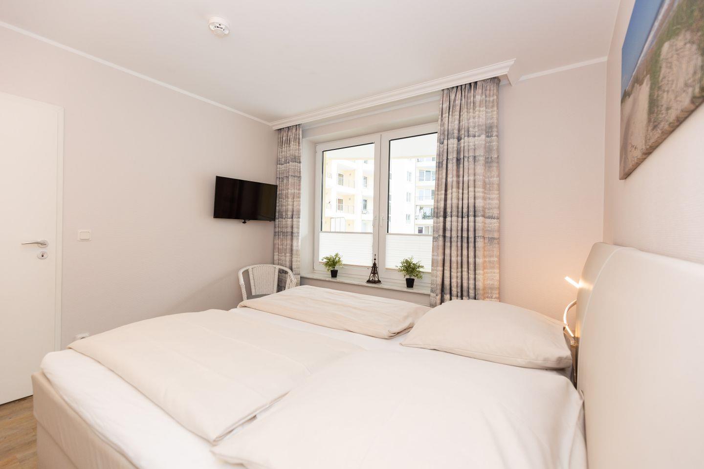 Haus "Kurpark-Residenz", Typ D2, App.-Nr. "125", bis 4 Personen, 1. OG, Ostseite ("Parkseite"), ca. 67 m² Größe, Wohnzimmer, separates Schlafzimmer mit Boxspringbett und Flachbild TV, zweites separates Schlafzimmer (innenliegend) mit zwei Boxspringbetten, Dusche/WC, Küchenzeile mit Mikrowelle, Backofen und Geschirrspüler, Balkon, kostenl. W-Lan Zugang (eigener Router) im App., SAT-TV, Tiefgaragenstellplatz, Nichtraucherwohnung, Haustiere sind nicht gestattet, Strandkorb im Sommer 2026.
