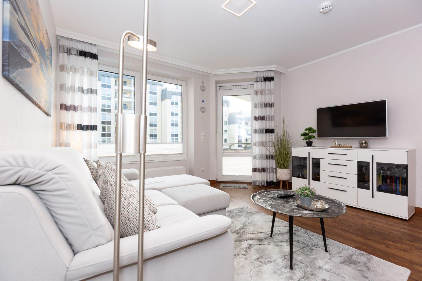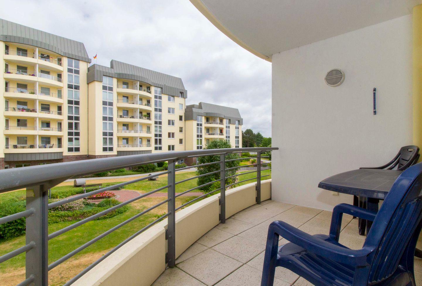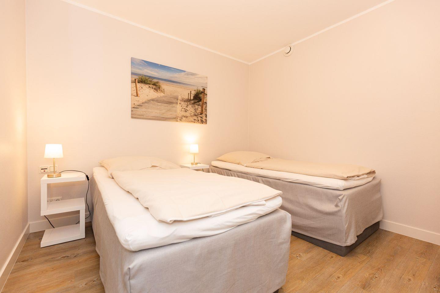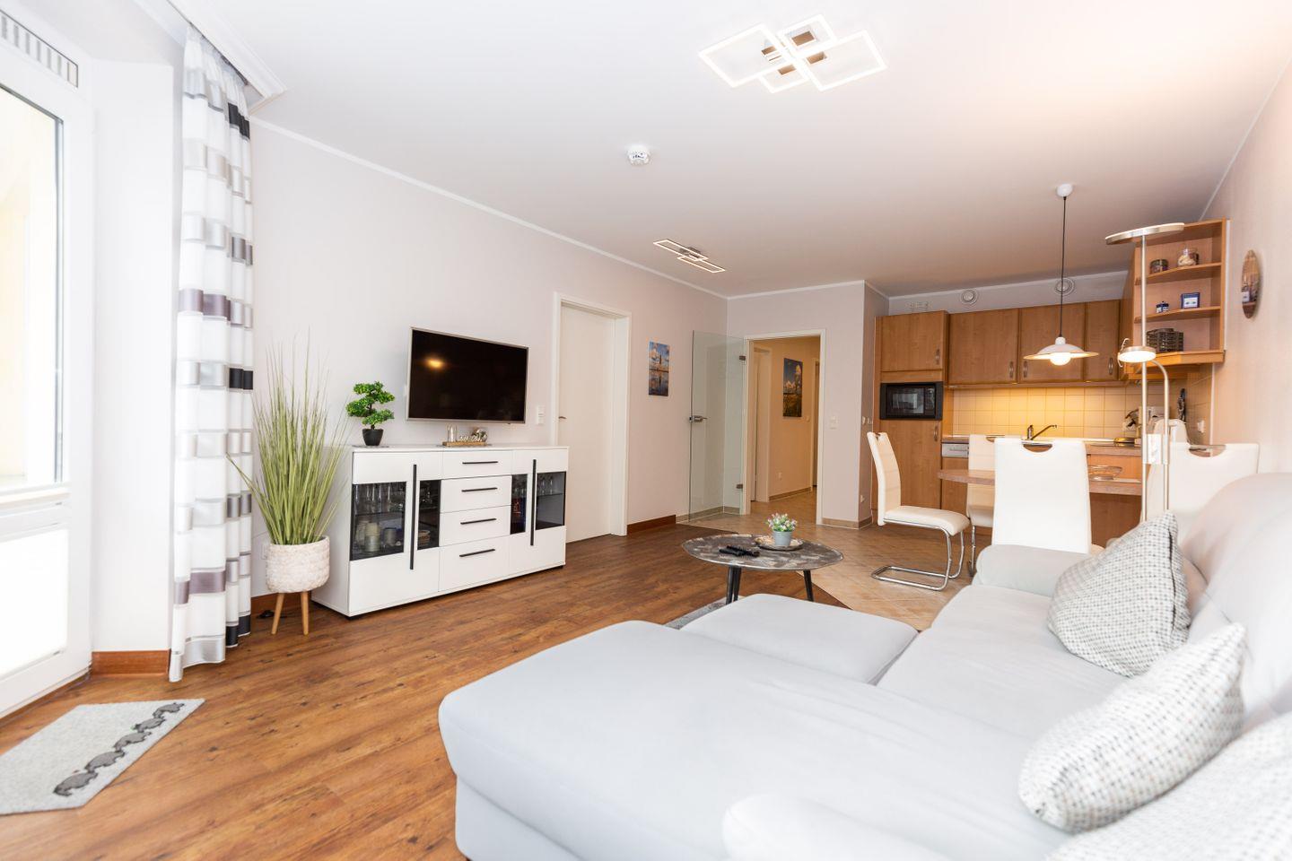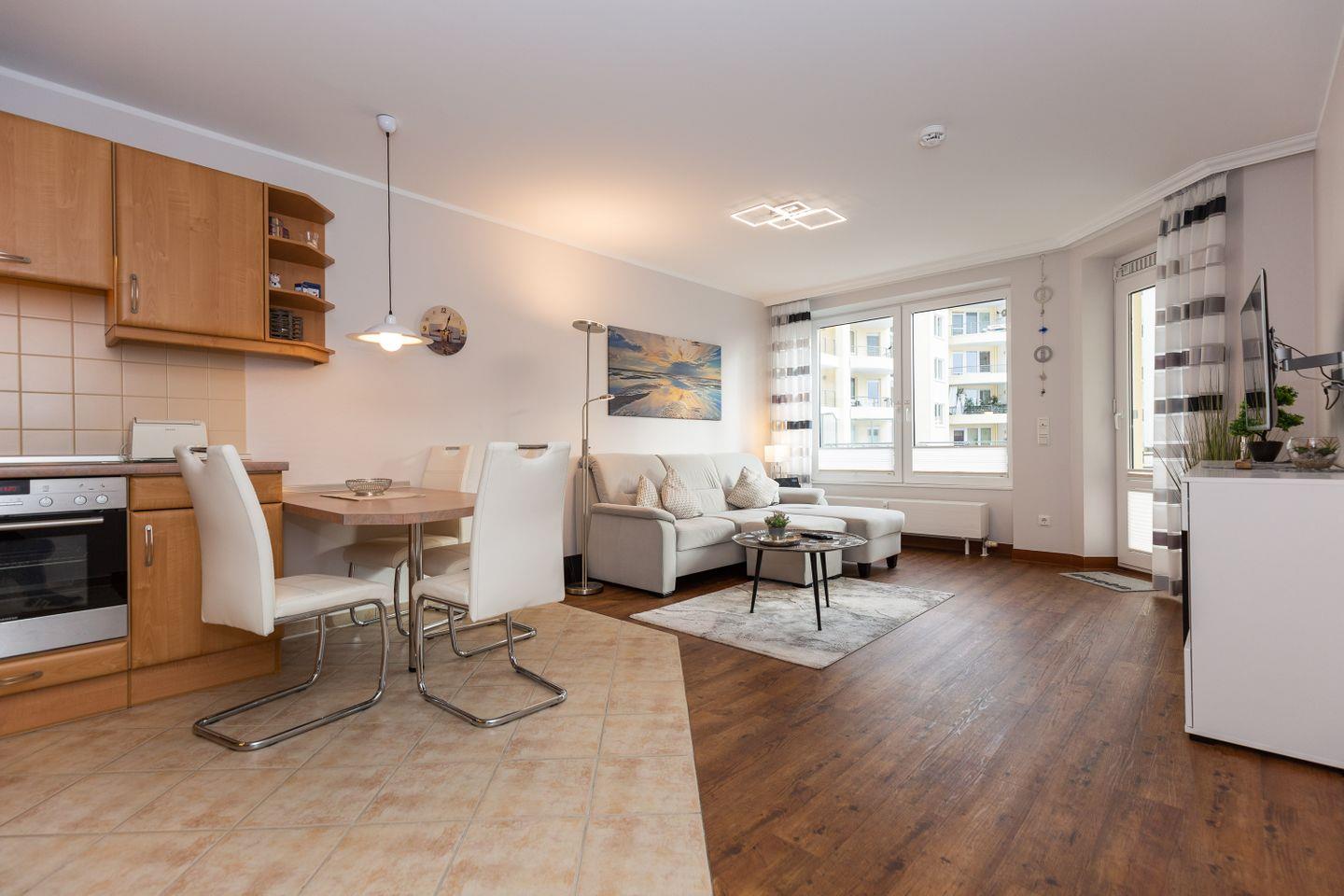 Haus "Kurpark-Residenz", Typ D2, App.-Nr. "125", bis 4 Personen, 1. OG, Ostseite ("Parkseite"), ca. 67 m² Größe, Wohnzimmer, separates Schlafzimmer mit Boxspringbett und Flachbild TV, zweites separates Schlafzimmer (innenliegend) mit zwei Boxspringbetten, Dusche/WC, Küchenzeile mit Mikrowelle, Backofen und Geschirrspüler, Balkon, kostenl. W-Lan Zugang (eigener Router) im App., SAT-TV, Tiefgaragenstellplatz, Nichtraucherwohnung, Haustiere sind nicht gestattet, Strandkorb im Sommer 2026.