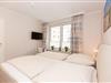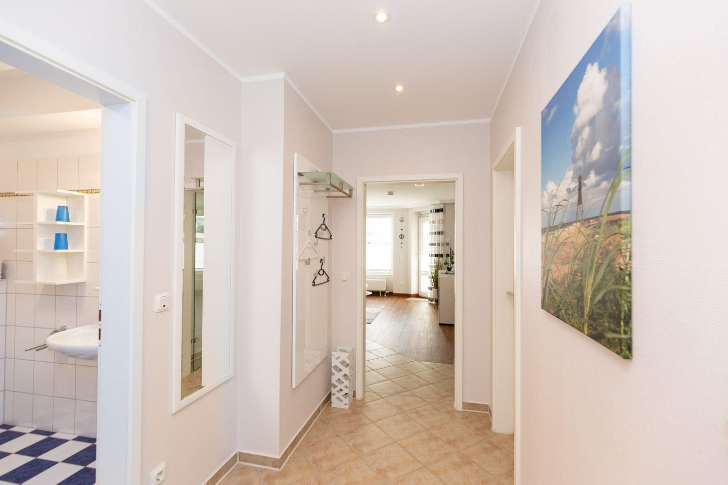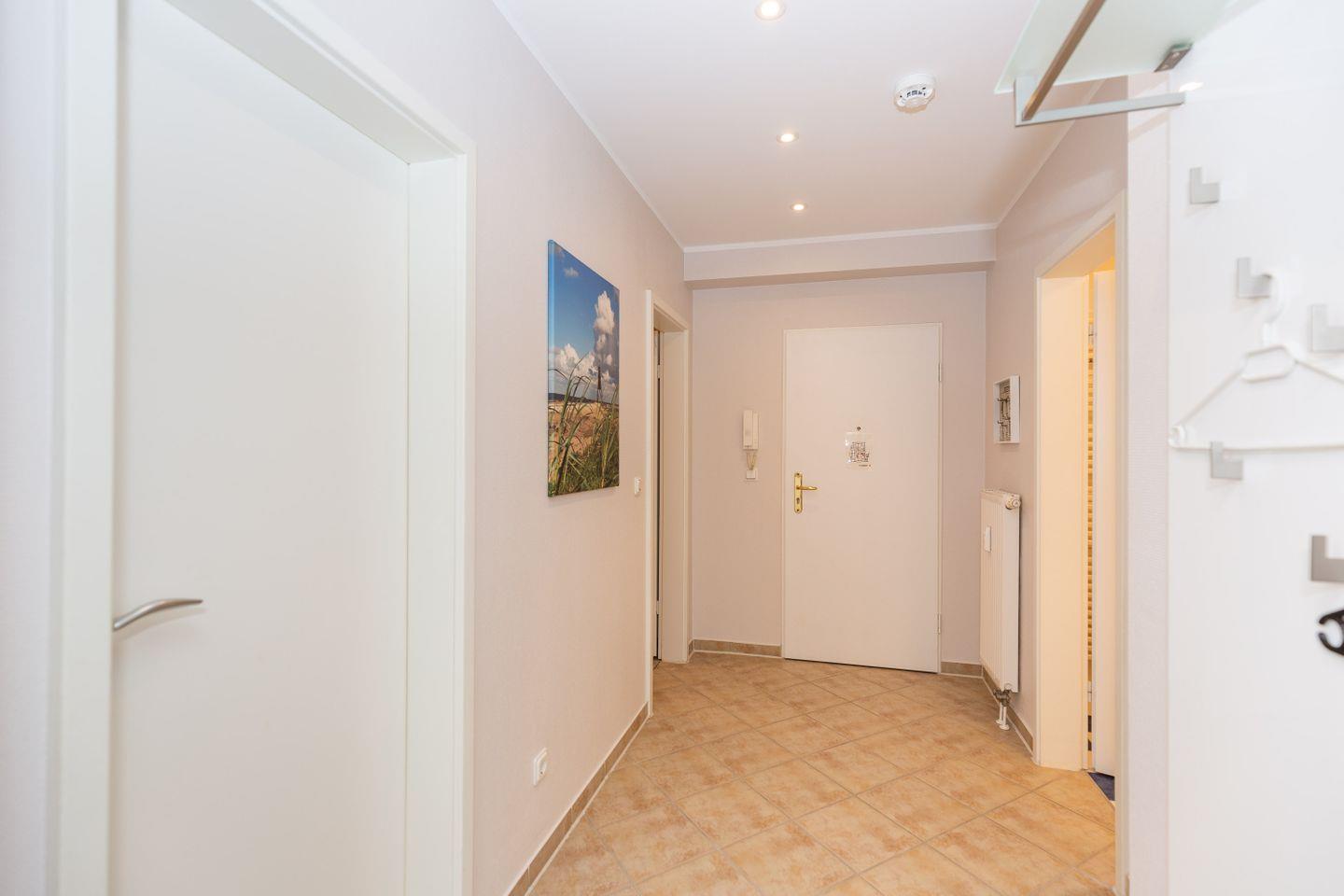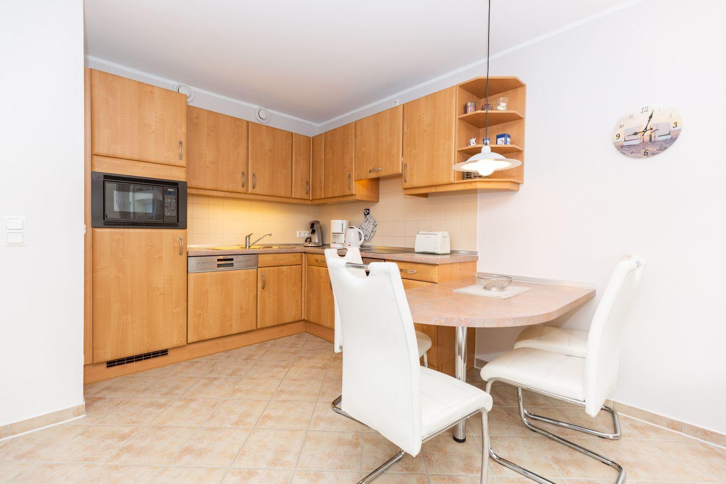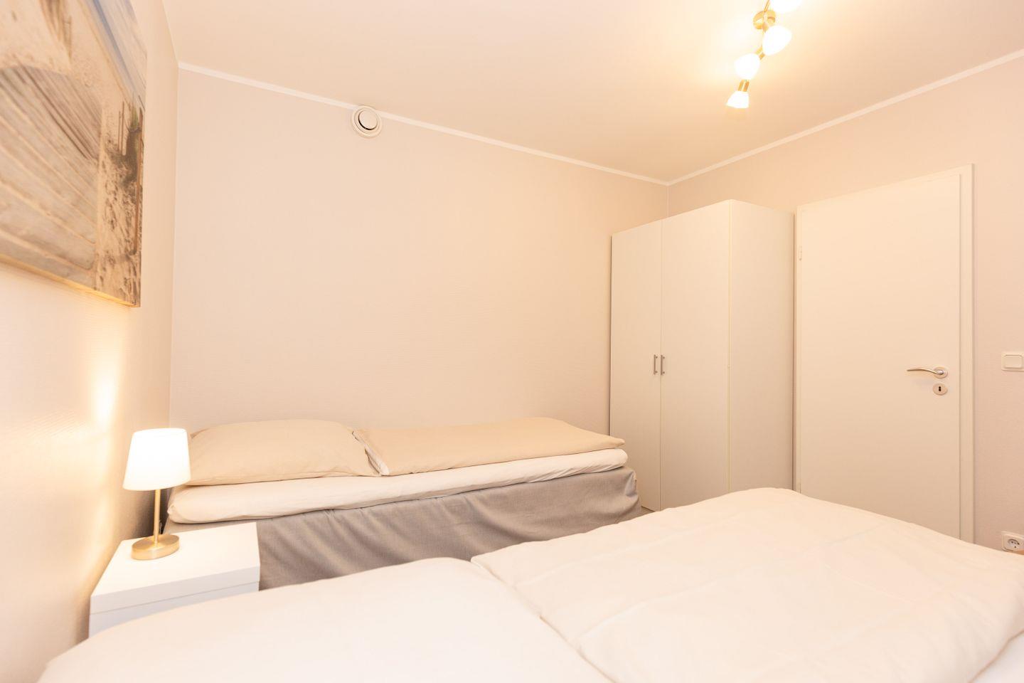 Haus "Kurpark-Residenz", Typ D2, App.-Nr. "125", bis 4 Personen, 1. OG, Ostseite ("Parkseite"), ca. 67 m² Größe, Wohnzimmer, separates Schlafzimmer mit Boxspringbett und Flachbild TV, zweites separates Schlafzimmer (innenliegend) mit zwei Boxspringbetten, Dusche/WC, Küchenzeile mit Mikrowelle, Backofen und Geschirrspüler, Balkon, kostenl. W-Lan Zugang (eigener Router) im App., SAT-TV, Tiefgaragenstellplatz, Nichtraucherwohnung, Haustiere sind nicht gestattet, Strandkorb im Sommer 2026.
