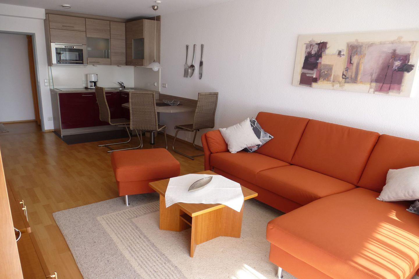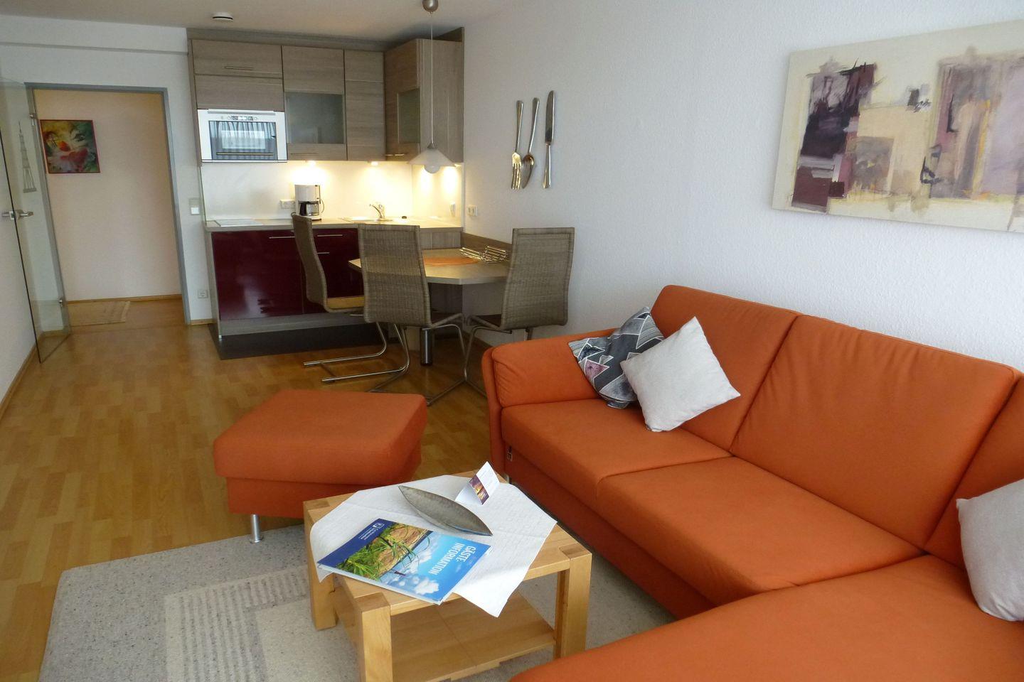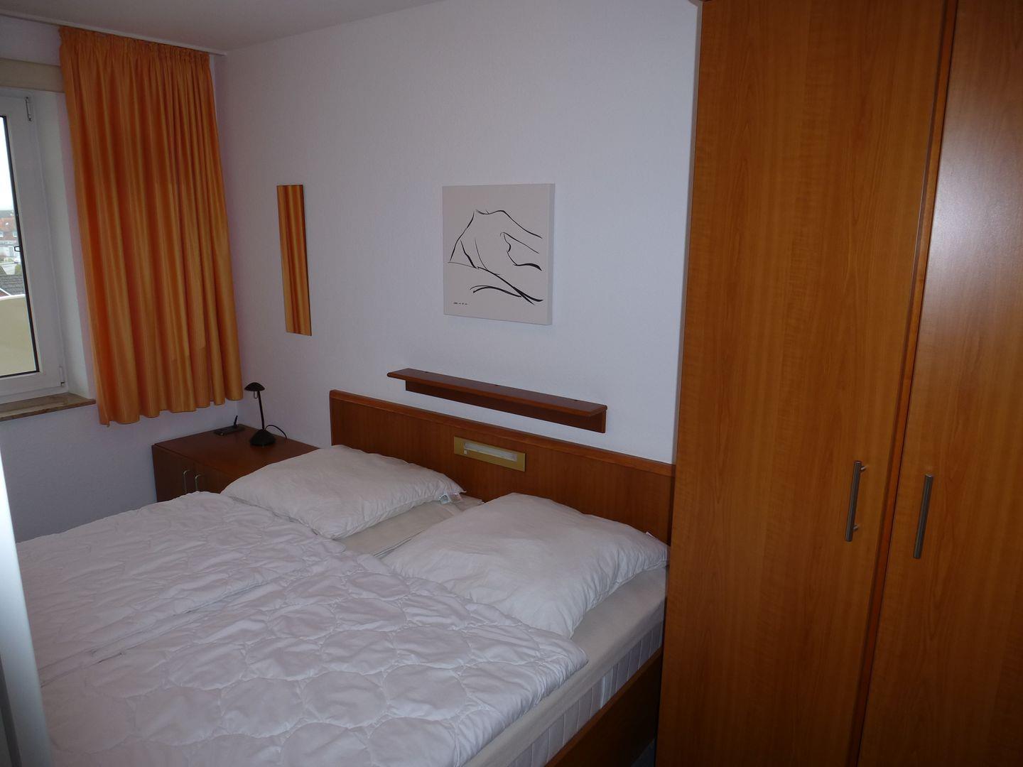 Haus "Trafalgar", Typ B, App.-Nr. 228, bis 2 Pers., 2. Etage, ca. 46 qm, Südseite (ohne Meerblick), Schlafzimmer mit Doppelbett und (abweichend vom Grundriss) durch Türen getrennt vom Wohnzimmer, Küchenzeile mit Mikrowelle und Geschirrspüler, Dusche/WC, Balkon, Kabel-TV, inkl. WLAN-Anschluss, Nichtraucherwohnung, Haustiere nicht erlaubt, Tiefgaragenstellplatz.