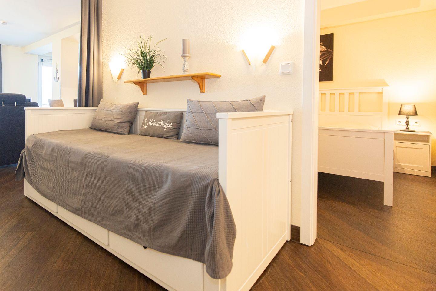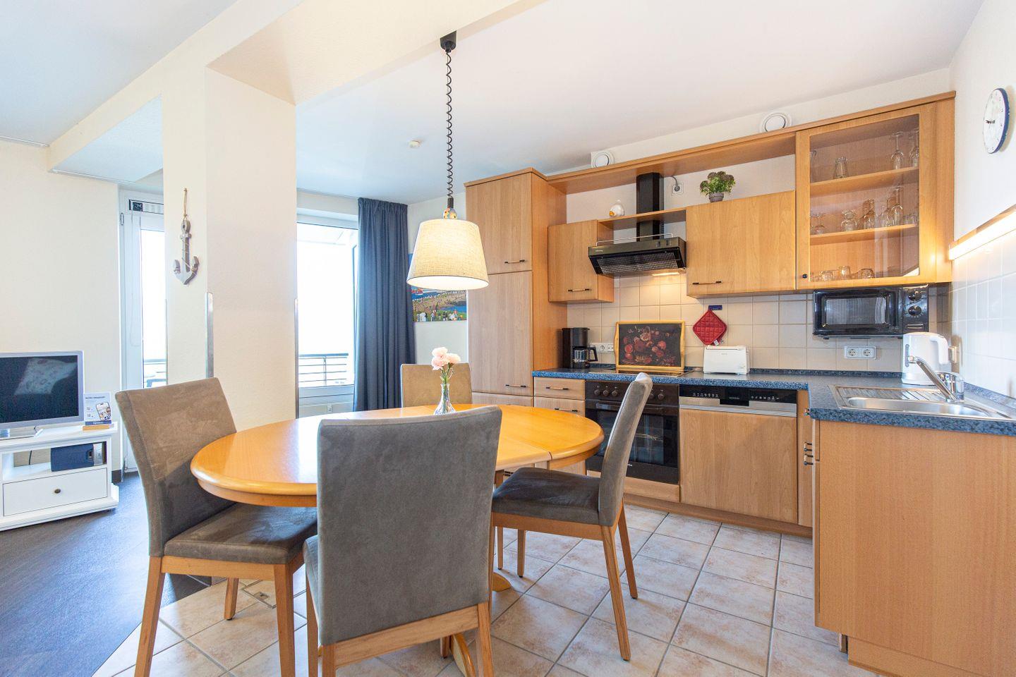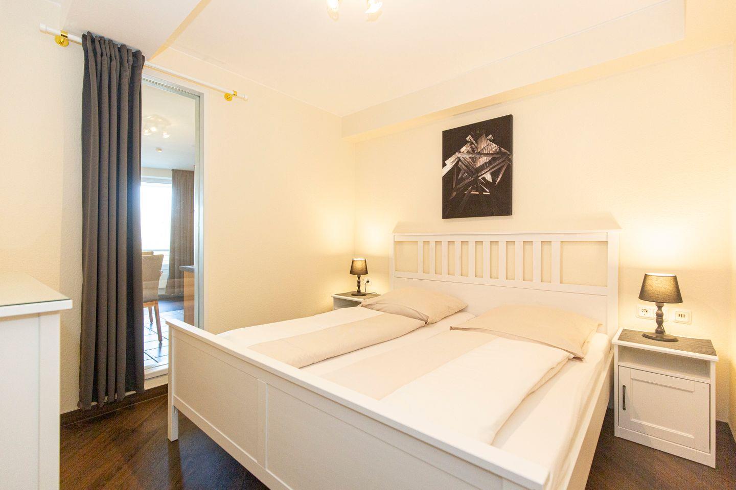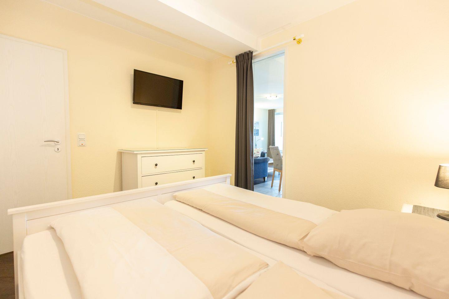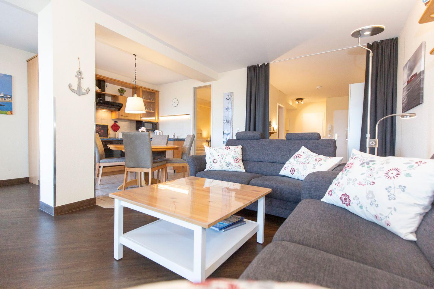 Haus "Kurpark-Residenz", Typ D1, App.-Nr. "144", bis 4 Personen, 1. OG, Nordseite, sehr eingeschränkte Seesicht Richtung Elbe, ca. 67 m² Größe, Wohnzimmer mit Schlafcouch, sep. Schlafzimmer (innenliegend) mit Doppelbett, Dusche/WC, Gäste-WC, Küchenzeile mit Mikrowelle, Backofen und Geschirrspüler, Wintergarten und Loggia, SAT-TV, WLAN Zugang im App., Tiefgaragenstellplatz, Nichtraucher, Haustiere sind nicht gestattet, Strandkorb im Sommer 2026.