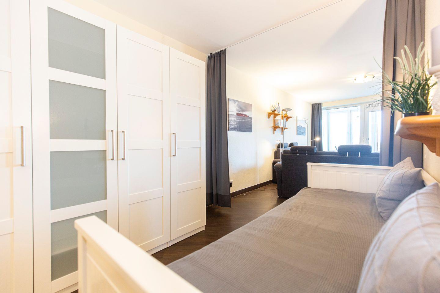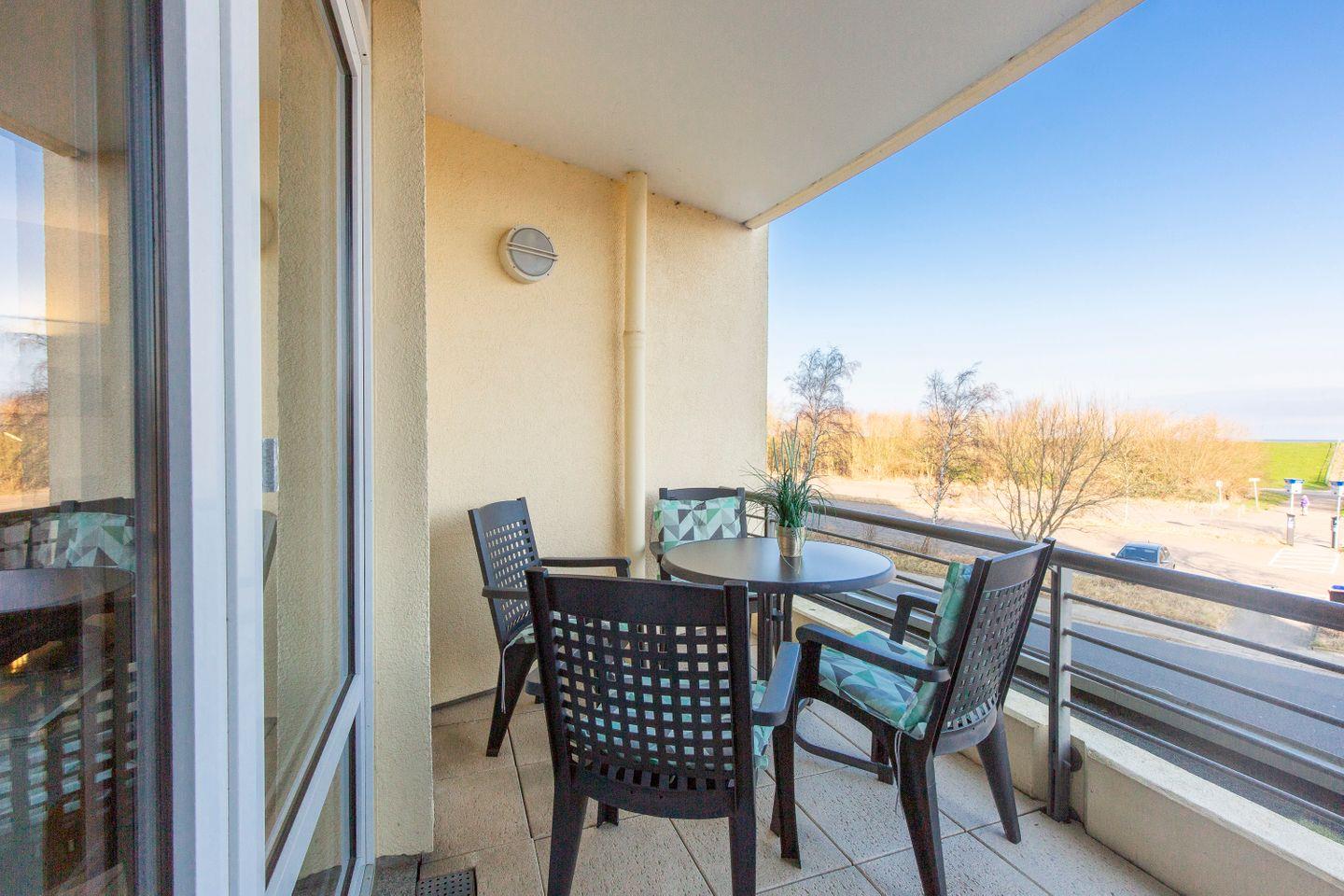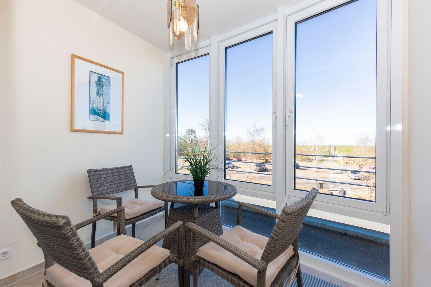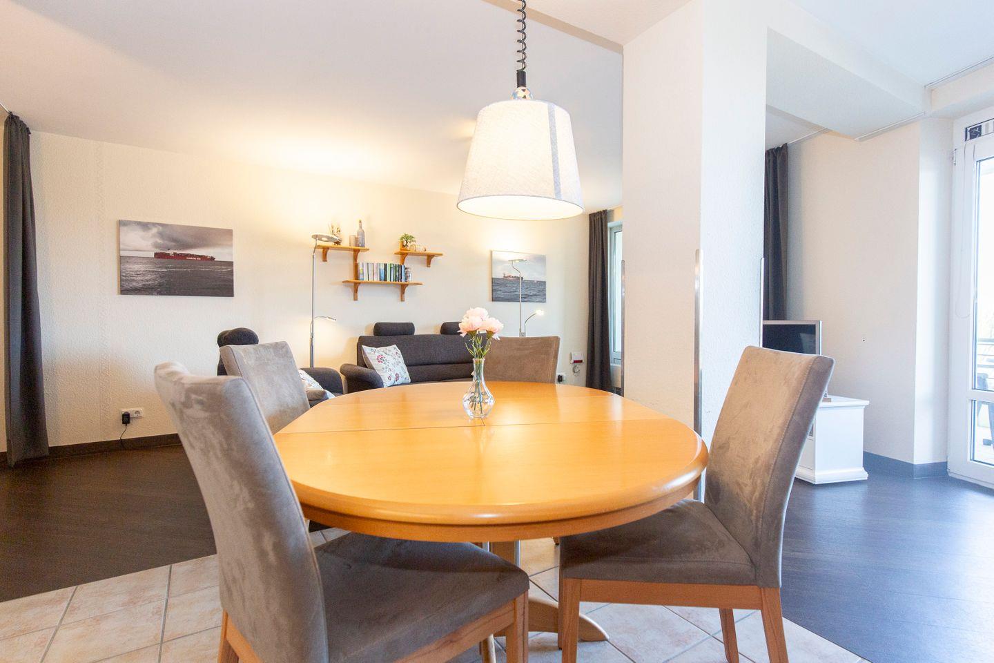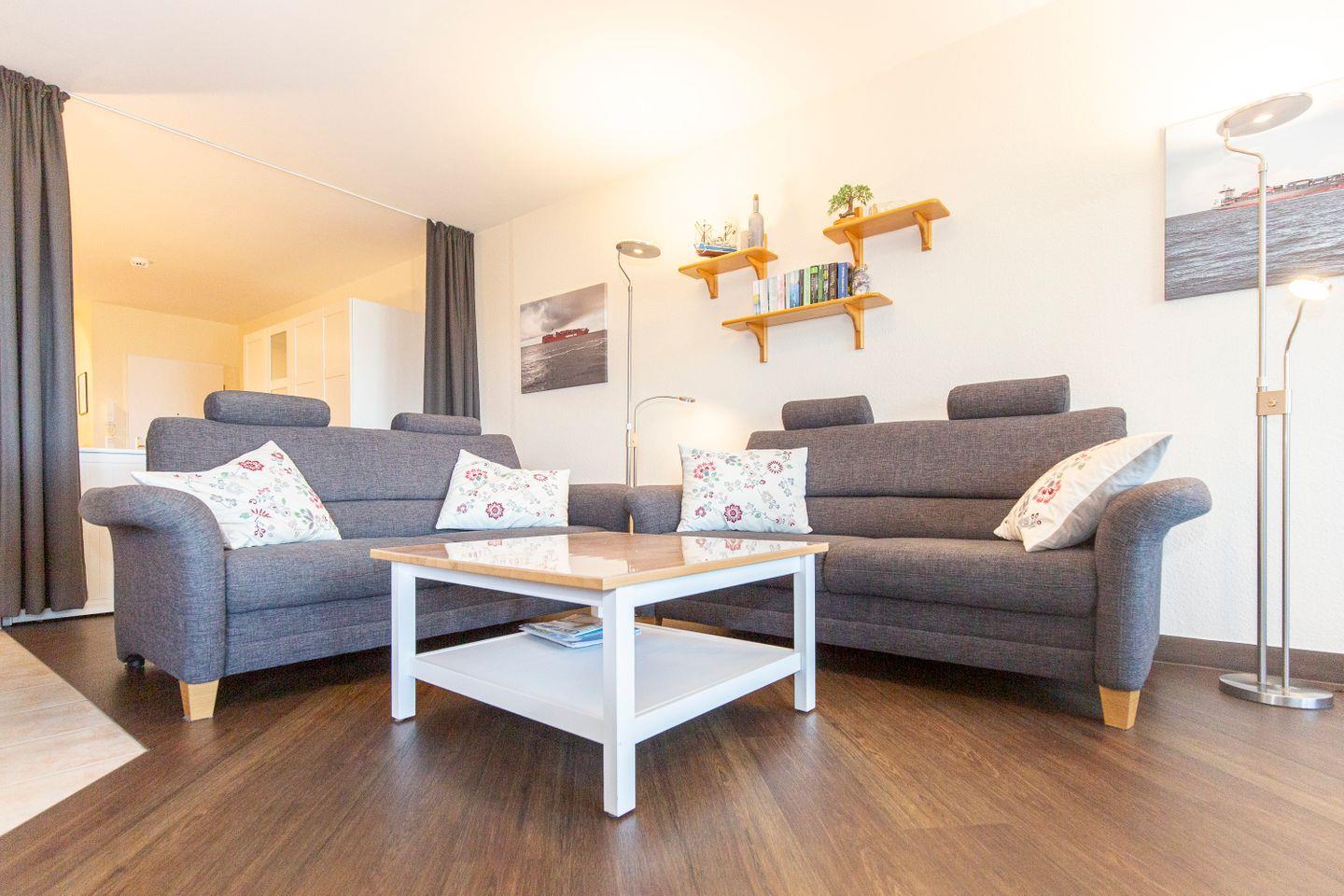 Haus "Kurpark-Residenz", Typ D1, App.-Nr. "144", bis 4 Personen, 1. OG, Nordseite, sehr eingeschränkte Seesicht Richtung Elbe, ca. 67 m² Größe, Wohnzimmer mit Schlafcouch, sep. Schlafzimmer (innenliegend) mit Doppelbett, Dusche/WC, Gäste-WC, Küchenzeile mit Mikrowelle, Backofen und Geschirrspüler, Wintergarten und Loggia, SAT-TV, WLAN Zugang im App., Tiefgaragenstellplatz, Nichtraucher, Haustiere sind nicht gestattet, Strandkorb im Sommer 2026.