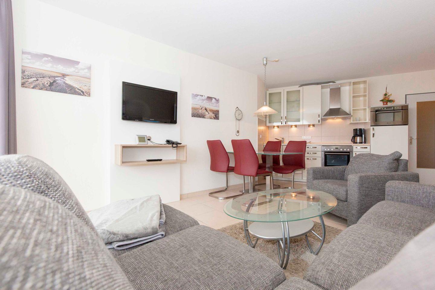 Haus "Trafalgar", Typ B, App.-Nr. "425", bis 4 Personen, 4. Etage, ca. 55 qm Größe, Westseite (Meerblick/Richtung Neuwerk), Wohn/Schlafraum mit Schlafcouch, sep. Schlafzimmer mit Doppelbett, Küchenzeile mit Mikrowelle/Geschirrspüler, Dusche/WC, das Appartement ist bis auf das Schlafzimmer gefliest, Balkon, Telefon, Kabel-TV, kostenl. W-LAN im App., Tiefgaragenstellplatz, Strandkorb im Sommer 2026, max. 2 Hunde pro Buchung gegen Gebühr erlaubt, Nichtraucher