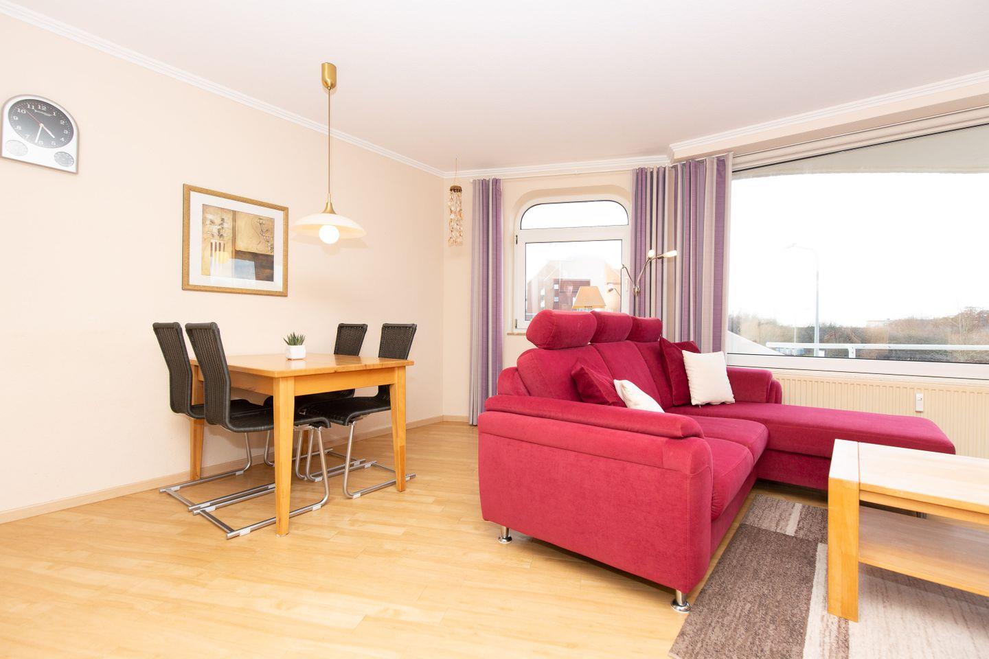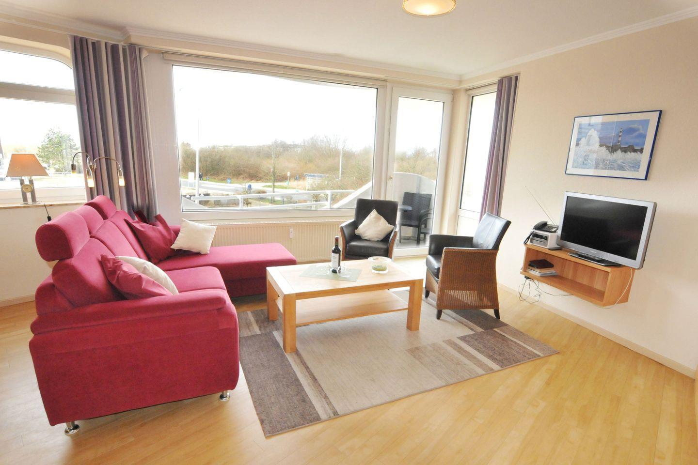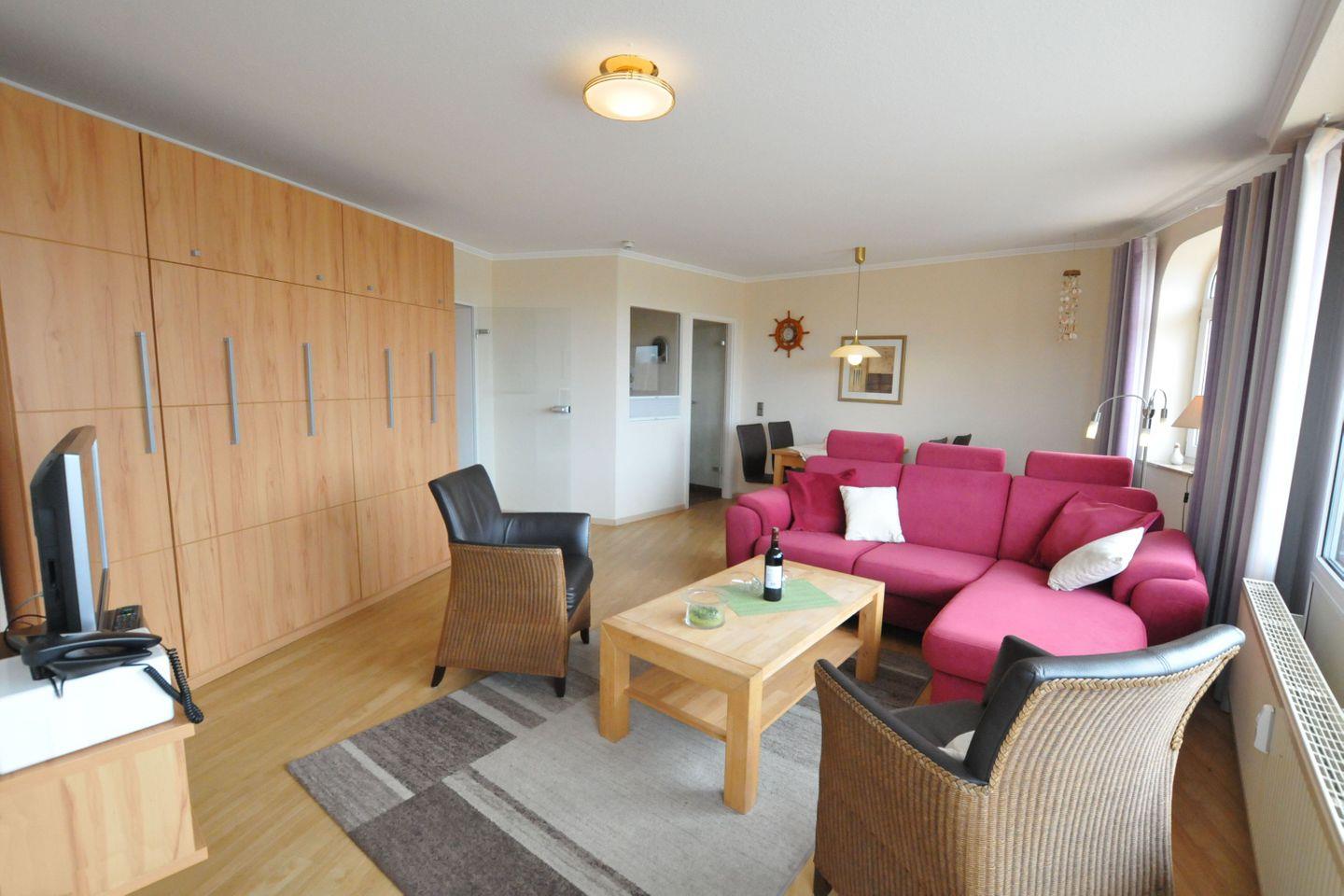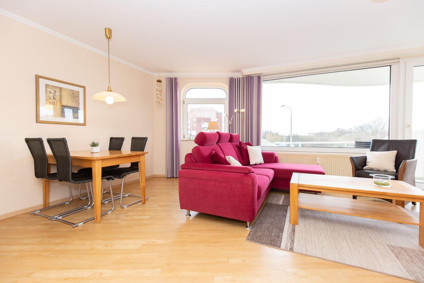 Haus "Trafalgar", Typ D, App.-Nr. 121, bis 4 Pers., 1. Etage, ca. 66 qm, Nord/Westseite (ohne Meerblick), Wohnbereich mit Schrankbett (einzeln klappbar), sep. Schlafzimmer mit Doppelbett, sep. WC, Badezimmer mit Dusche, Küche mit Geschirrspüler, Mikrowelle, Backofen und 4-Platten Ceranfeld, zusätzliche Tchibo-Kaffeemaschine für Kapseln, Balkon, Telefon, kostenl. WLAN-Zugang im App., Flachbildschirm, Kabel-TV, Tiefgaragen-Stellplatz, Strandkorb im Sommer 2025