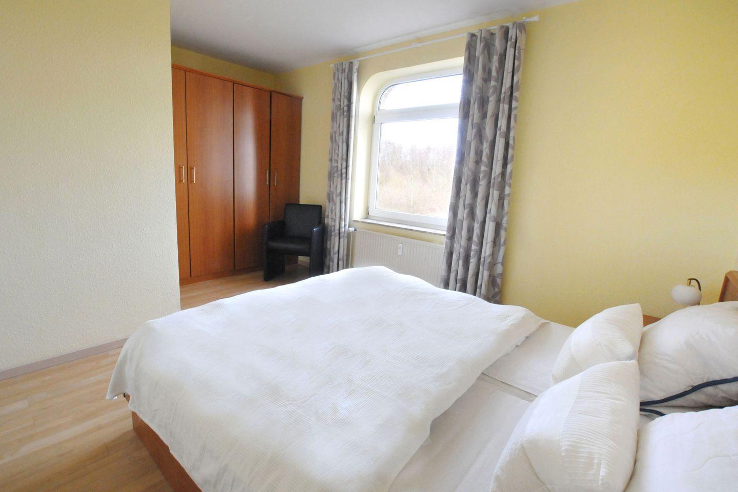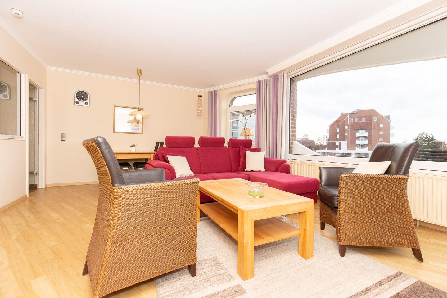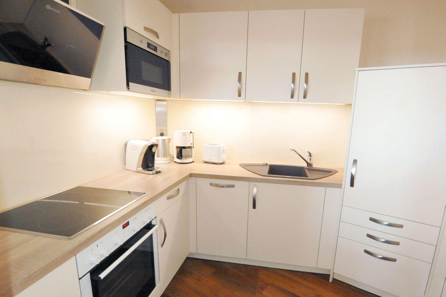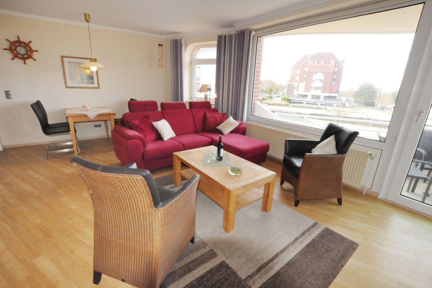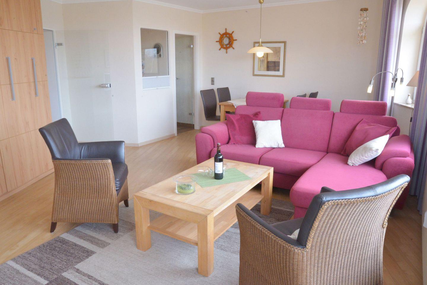Haus "Trafalgar", Typ D, App.-Nr. 121, bis 4 Pers., 1. Etage, ca. 66 qm, Nord/Westseite (ohne Meerblick), Wohnbereich mit Schrankbett (einzeln klappbar), sep. Schlafzimmer mit Doppelbett, sep. WC, Badezimmer mit Dusche, Küche mit Geschirrspüler, Mikrowelle, Backofen und 4-Platten Ceranfeld, zusätzliche Tchibo-Kaffeemaschine für Kapseln, Balkon, Telefon, kostenl. WLAN-Zugang im App., Flachbildschirm, Kabel-TV, Tiefgaragen-Stellplatz, Strandkorb im Sommer 2025