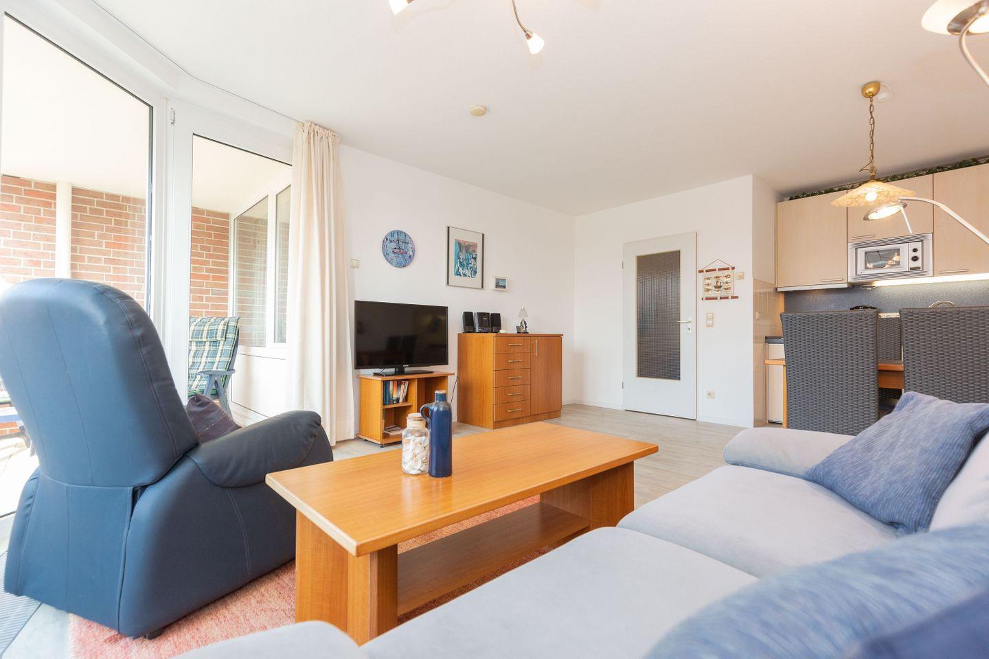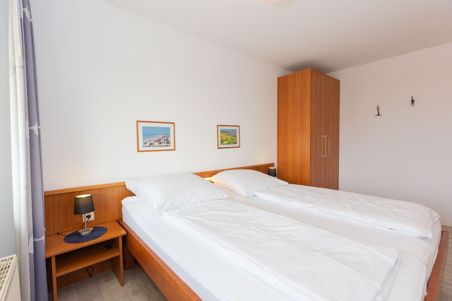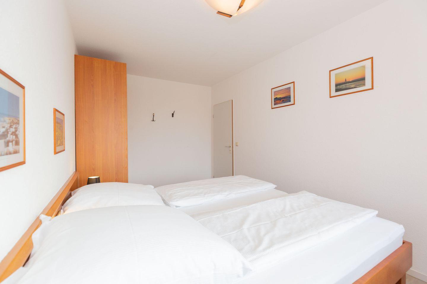 Haus "Trafalgar", Typ B, Appartement-Nr. 142, bis 2 Pers., 1.Etage, ca. 46 qm, Südseite (ohne Meerblick), Wohnzimmer mit Fernsehsessel, Schlafzimmer mit Doppelbett inklusive verstellbarer Lattenroste, Küchenzeile mit Geschirrspüler und Mikrowelle, Dusche/WC, Balkon, Kabel-TV, Telefon, kostenl. WLAN-Zugang im App., Haustiere sind nicht gestattet, Nichtraucherwohnung, Tiefgaragenstellplatz, Strandkorb im Sommer 2026.