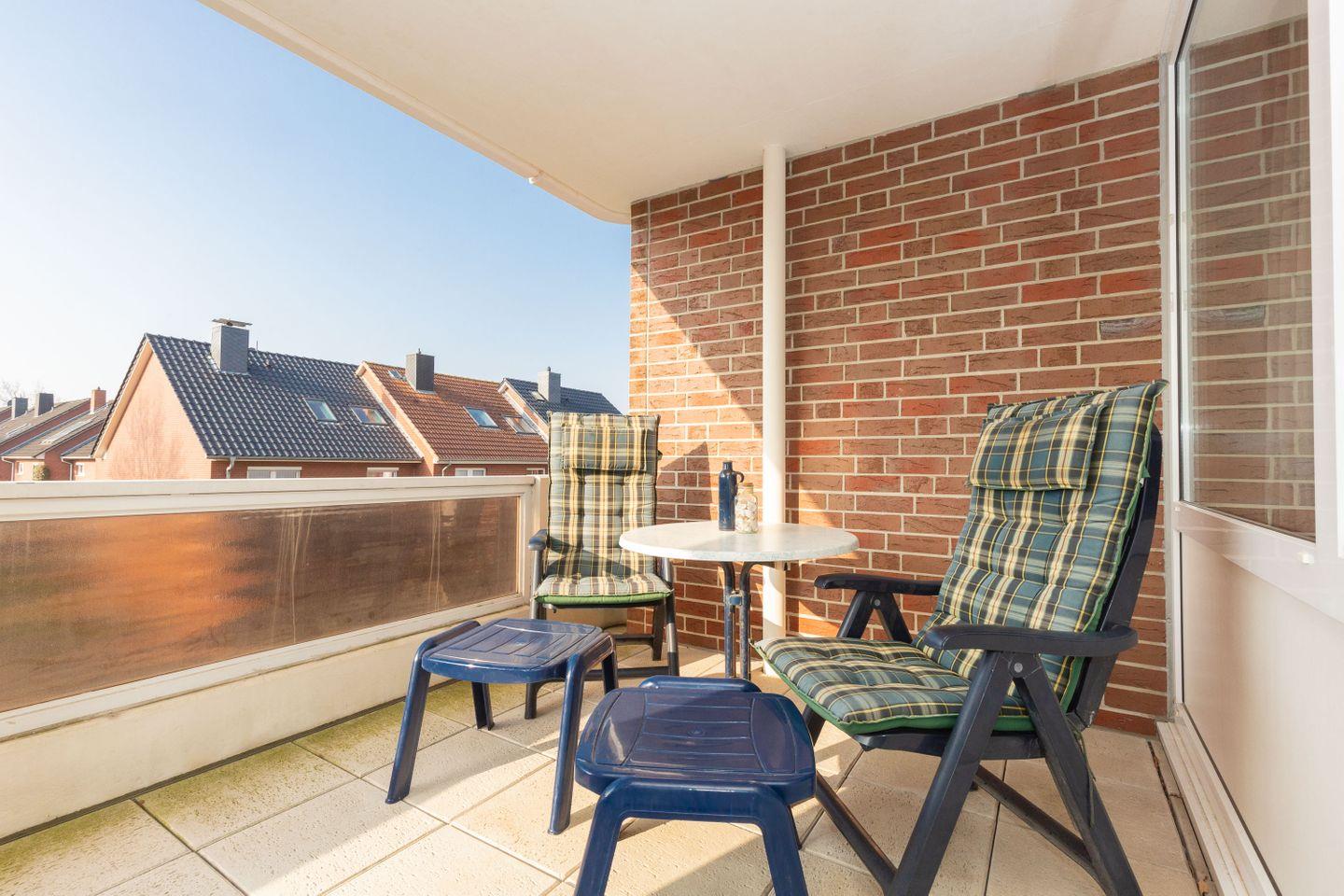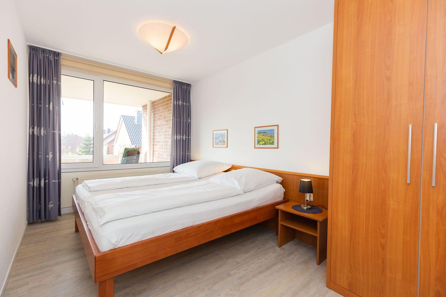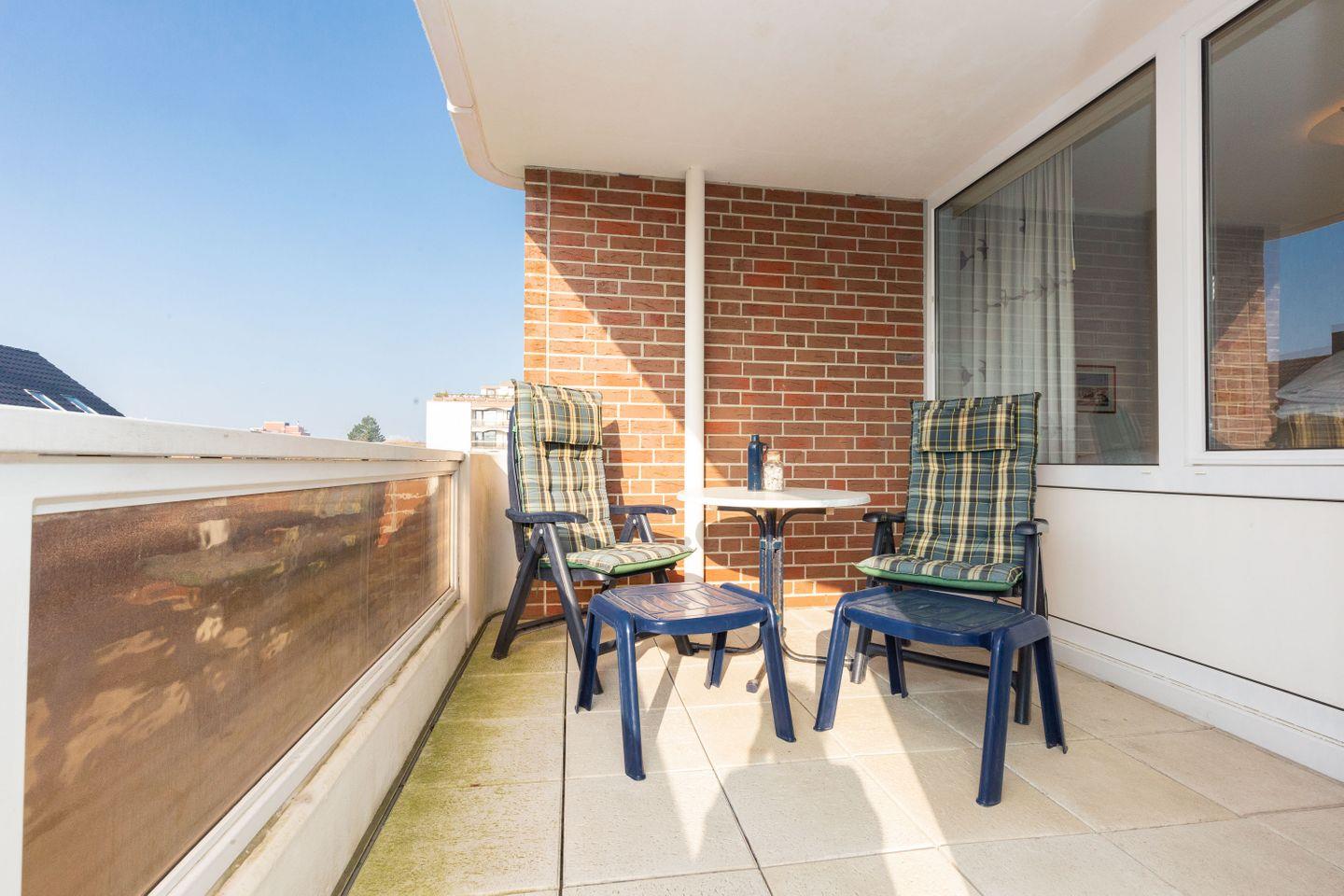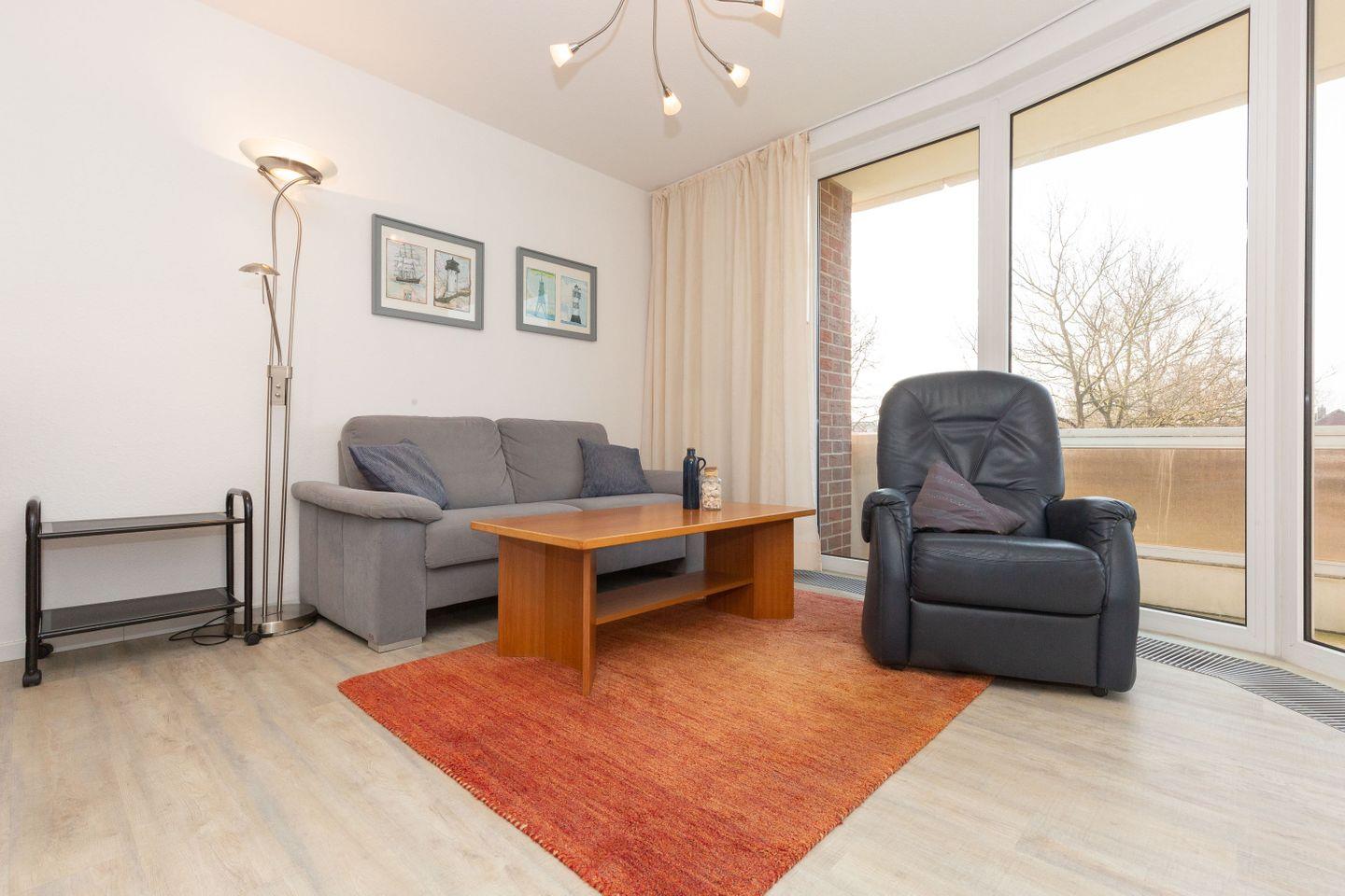 Haus "Trafalgar", Typ B, Appartement-Nr. 142, bis 2 Pers., 1.Etage, ca. 46 qm, Südseite (ohne Meerblick), Wohnzimmer mit Fernsehsessel, Schlafzimmer mit Doppelbett inklusive verstellbarer Lattenroste, Küchenzeile mit Geschirrspüler und Mikrowelle, Dusche/WC, Balkon, Kabel-TV, Telefon, kostenl. WLAN-Zugang im App., Haustiere sind nicht gestattet, Nichtraucherwohnung, Tiefgaragenstellplatz, Strandkorb im Sommer 2026.