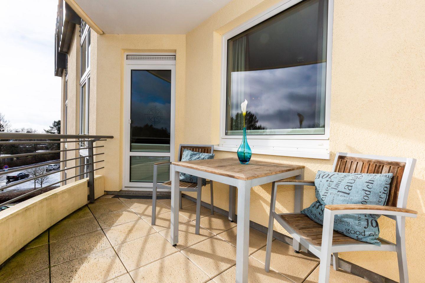 In der windgeschützten Loggia können die Urlaubsgäste jederzeit die frische Nordseeluft genießen. Der perfekte Ort, um einen Urlaubstag ausklingen zu lassen.