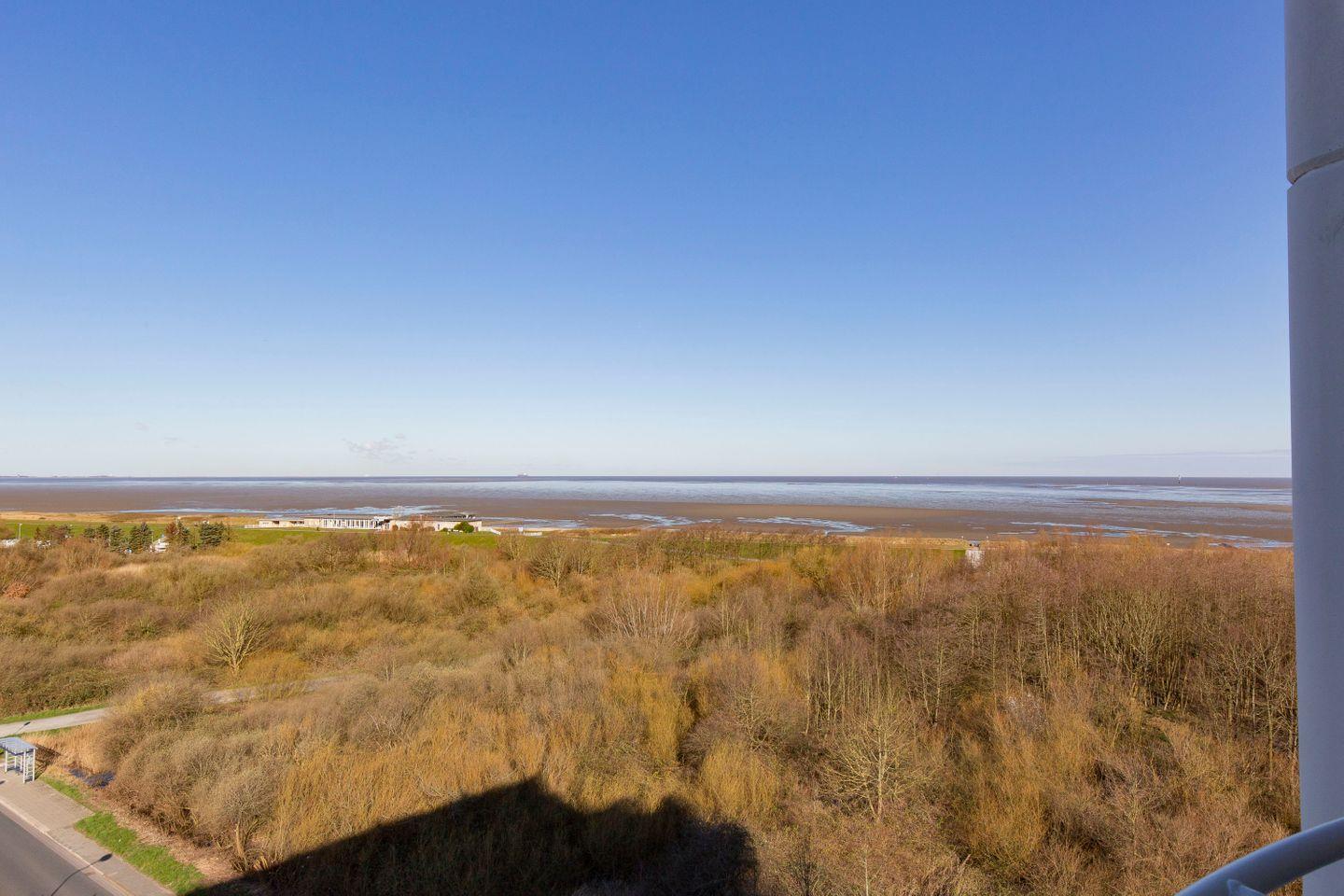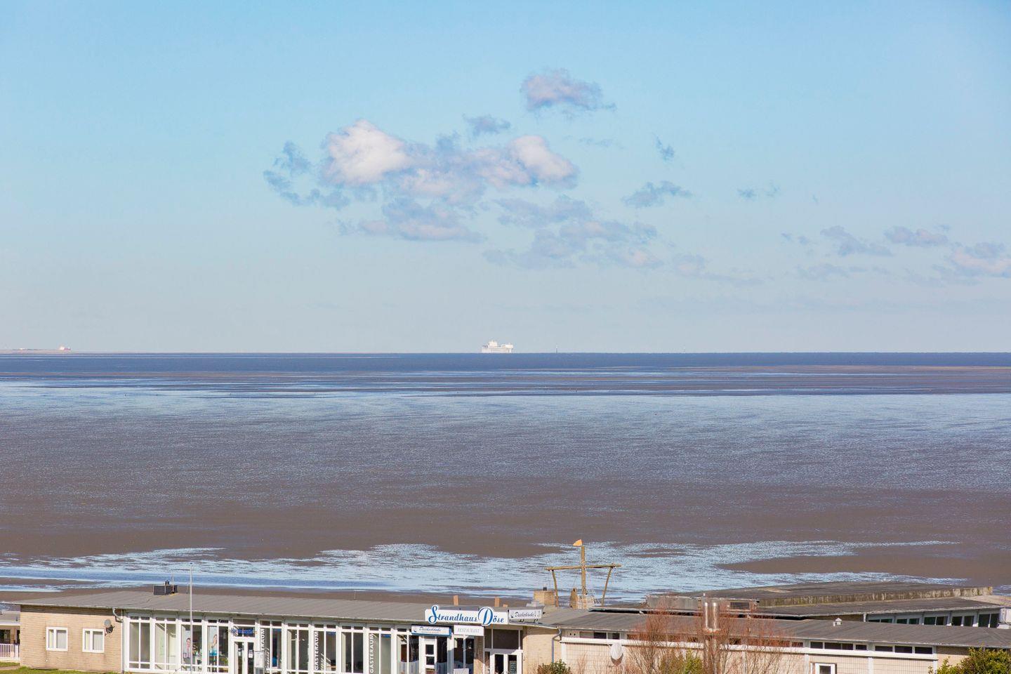 Vom Balkon der Ferienwohnung in der 8. Etage, ausgestattet mit Tisch und bequemen Korbsesseln, genießen Sie einen fantastischen Blick auf die Nordsee und die Insel Neuwerk. Hier können Sie nach einem ereignisreichen Tag entspannen und den Sonnenuntergang über der Nordsee auf sich wirken lassen.