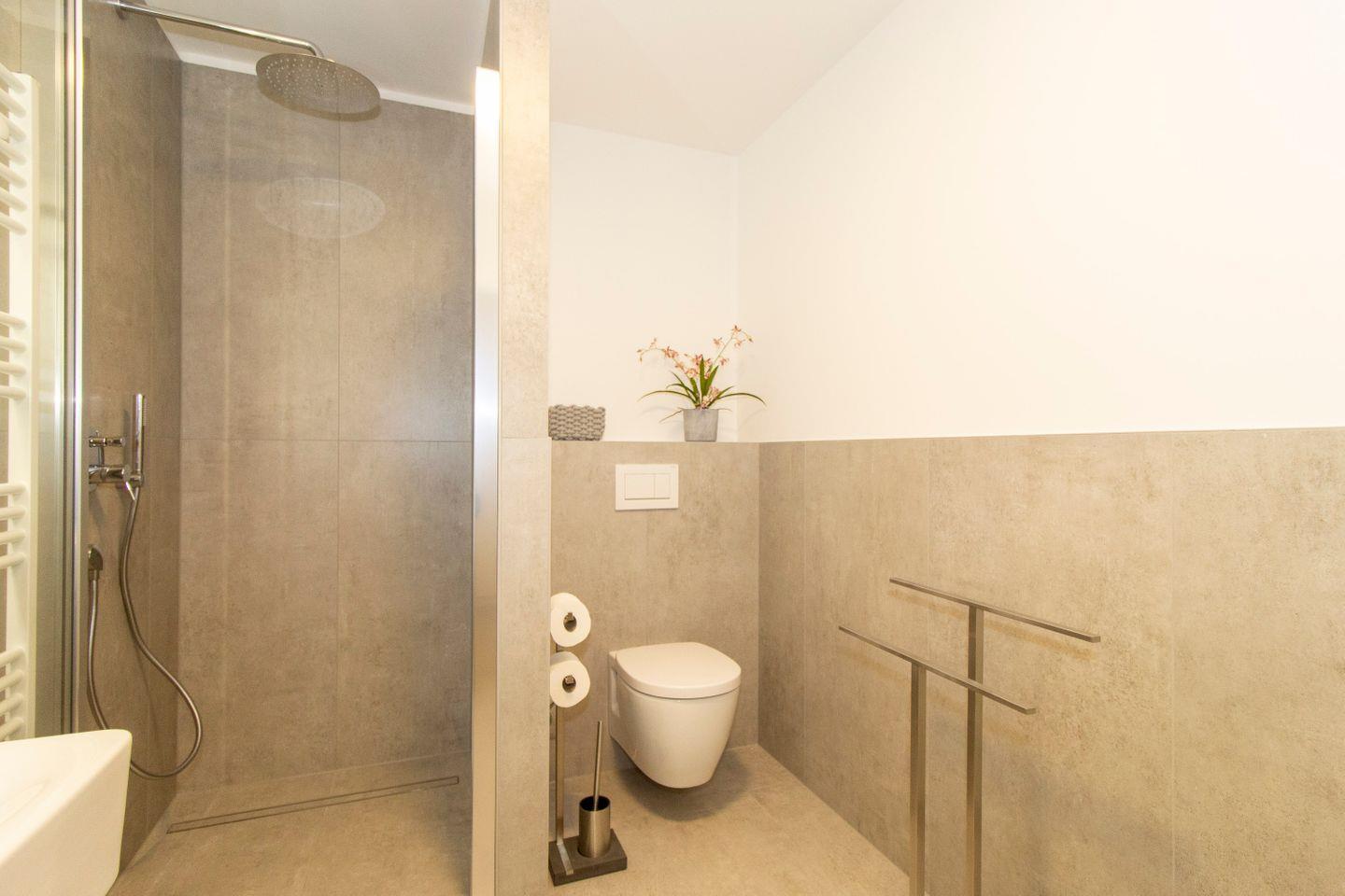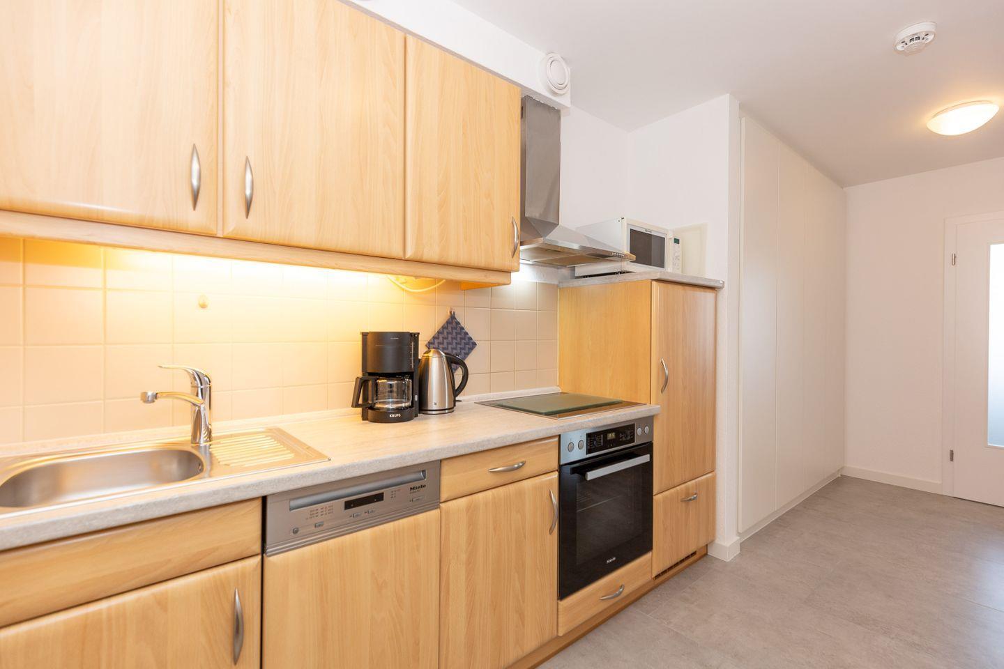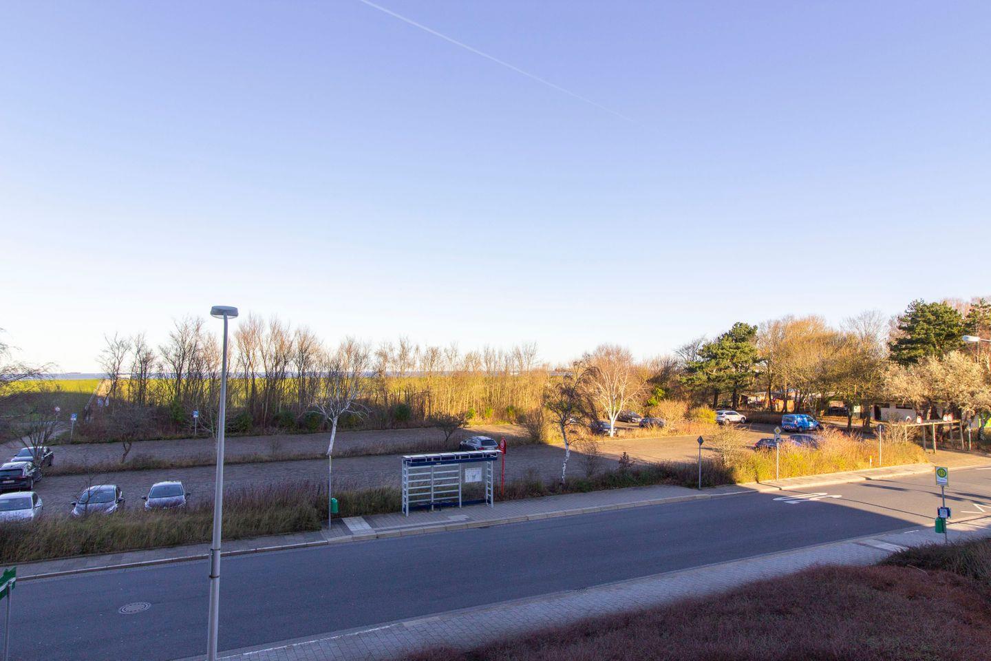 Die große Fensterfront bietet je nach Jahreszeit einen eingeschränkten Ausblick durch die Baumkronen Richtung Nordsee. Für ein Sonnenbad oder einen netten Abend im Freien kann die direkt der Wohnung gegenüber gelegene, große hauseigene Sonnenterrasse genutzt werden.