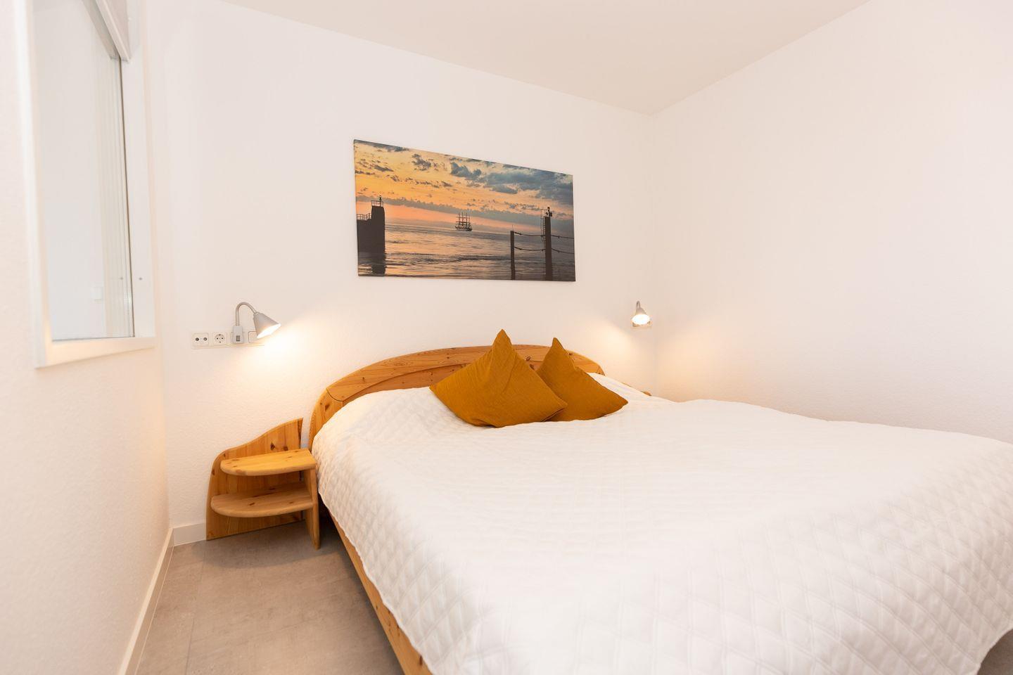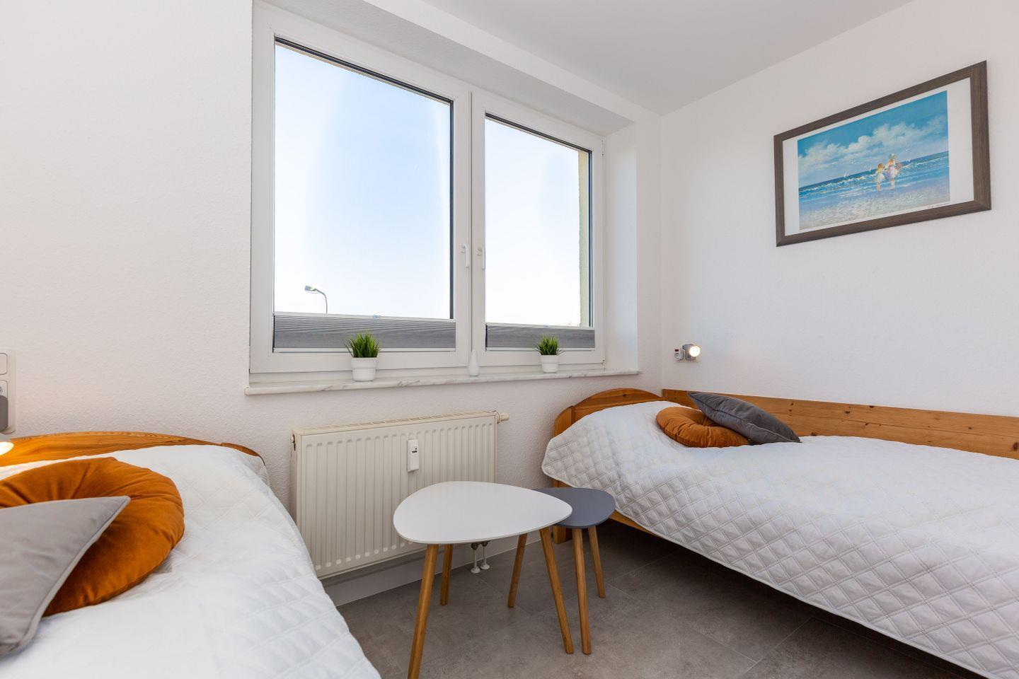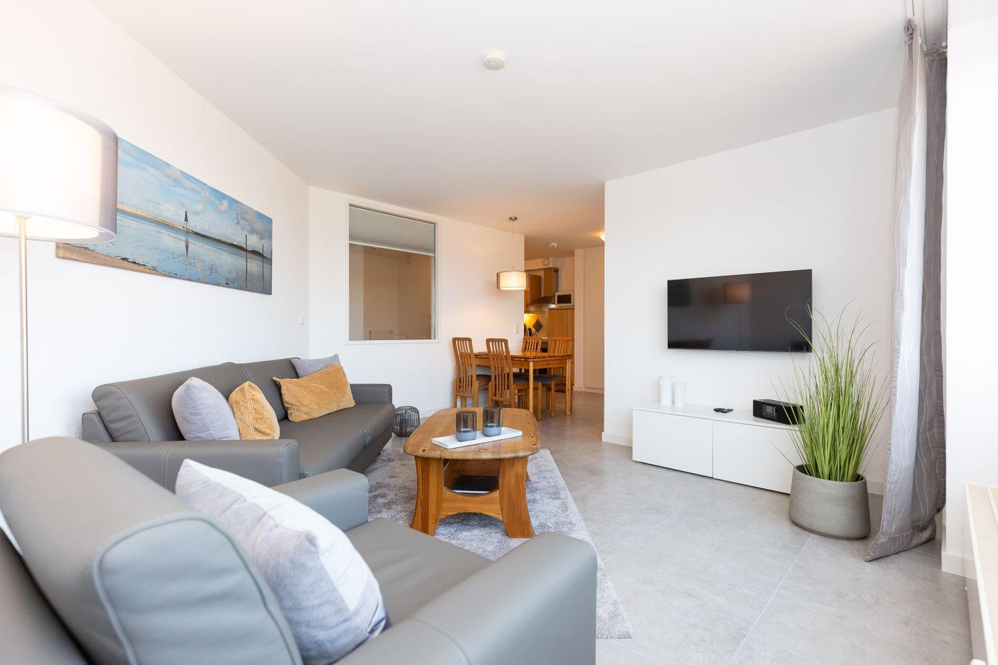 Haus "Kurpark-Residenz", Typ C2, App.-Nr. "139", 1. OG, Nordseite , ca. 45 m² Größe für max. 4 Personen, Wohnzimmer mit Ausblick Richtung Deich, SAT-TV, WLAN, 1 Schlafzimmer mit Doppelbett (innenliegend), 1 Schlafzimmer mit 2 Einzelbetten, Dusche/WC, Küchenzeile mit Mikrowelle, Backofen und Geschirrspüler, Sonnenterrasse in der 1. Etage nutzbar, Tiefgaragenstellplatz, Nichtraucher, Haustiere sind nicht gestattet, Strandkorb im Sommer 2026.