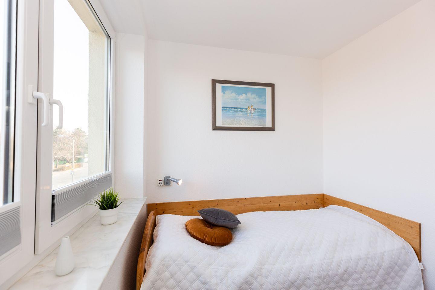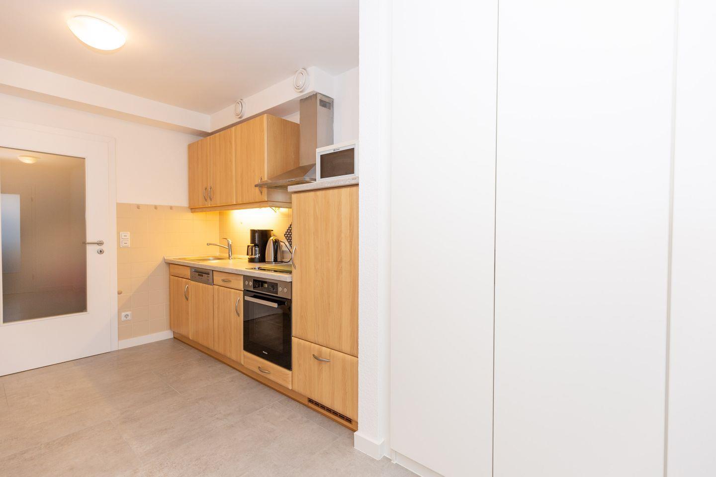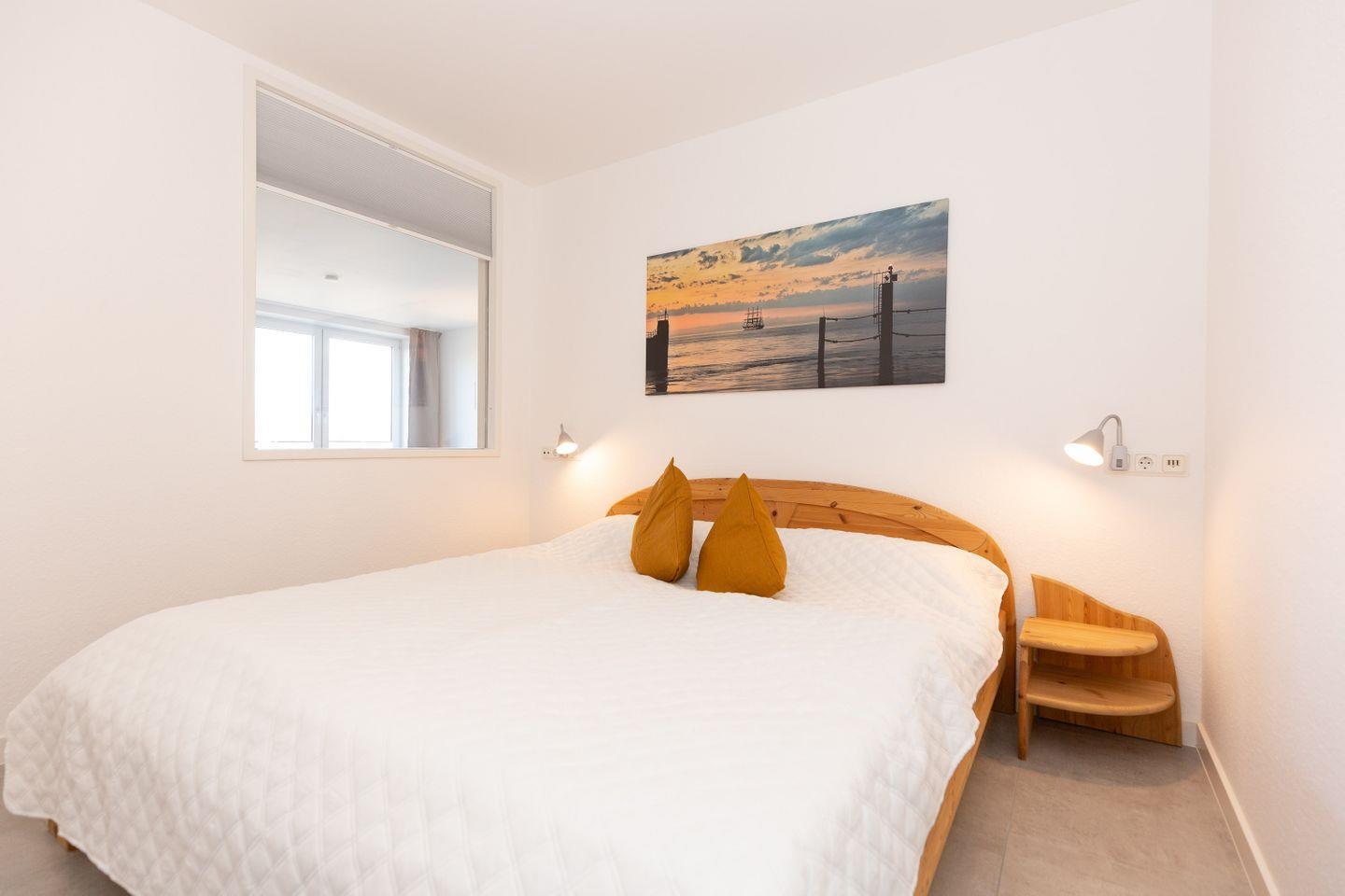 Haus "Kurpark-Residenz", Typ C2, App.-Nr. "139", 1. OG, Nordseite , ca. 45 m² Größe für max. 4 Personen, Wohnzimmer mit Ausblick Richtung Deich, SAT-TV, WLAN, 1 Schlafzimmer mit Doppelbett (innenliegend), 1 Schlafzimmer mit 2 Einzelbetten, Dusche/WC, Küchenzeile mit Mikrowelle, Backofen und Geschirrspüler, Sonnenterrasse in der 1. Etage nutzbar, Tiefgaragenstellplatz, Nichtraucher, Haustiere sind nicht gestattet, Strandkorb im Sommer 2026.