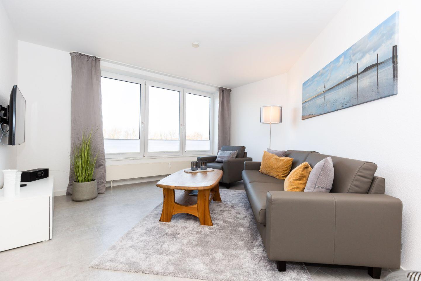 Diese hell und modern eingerichtete Ferienwohnung mit 2 Schlafzimmern für 4 Personen mit Blick Richtung Deich punktet mit absoluter Wohlfühl-Atmosphäre und macht sie zu einem wahren Zuhause auf Zeit für die ganze Familie.