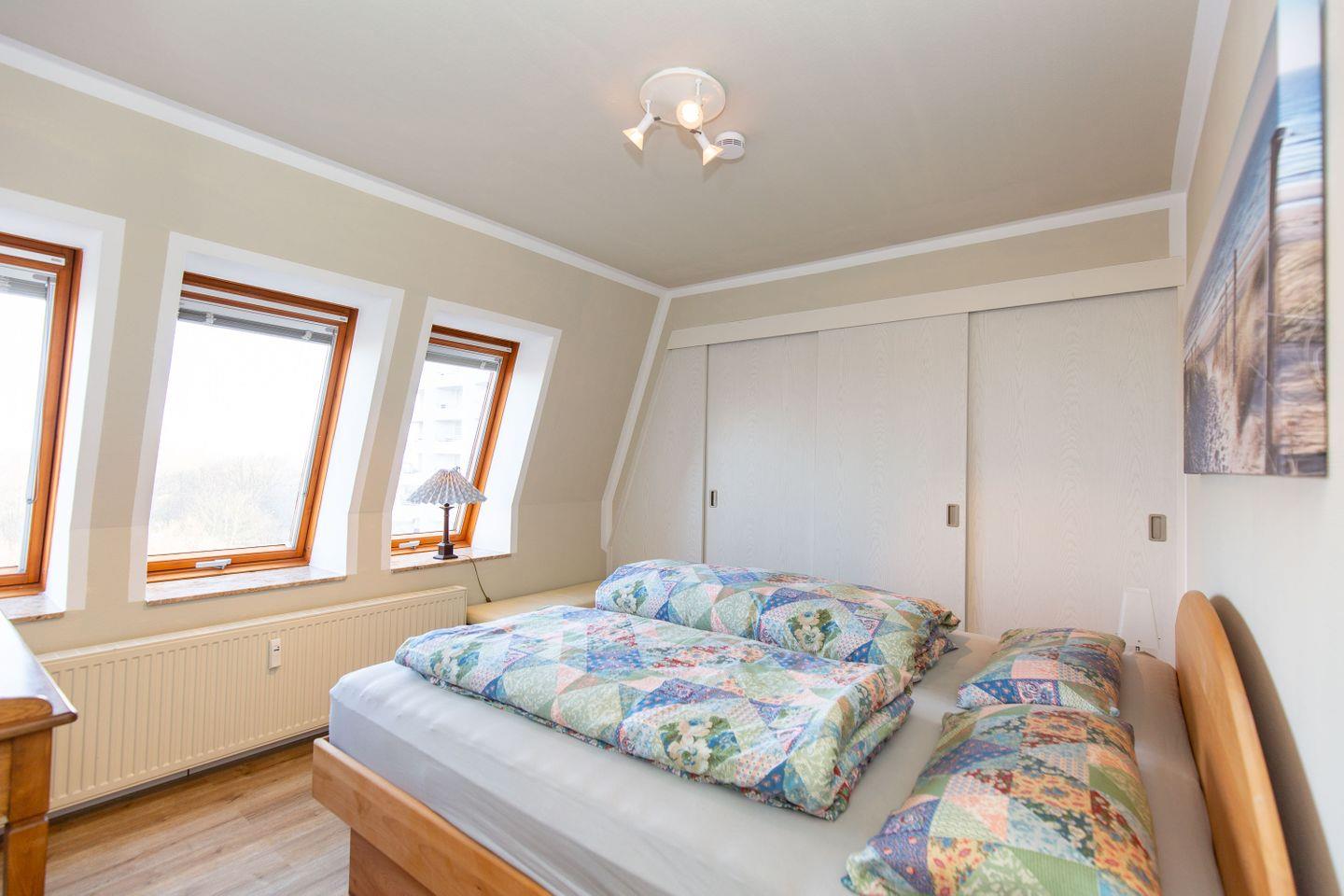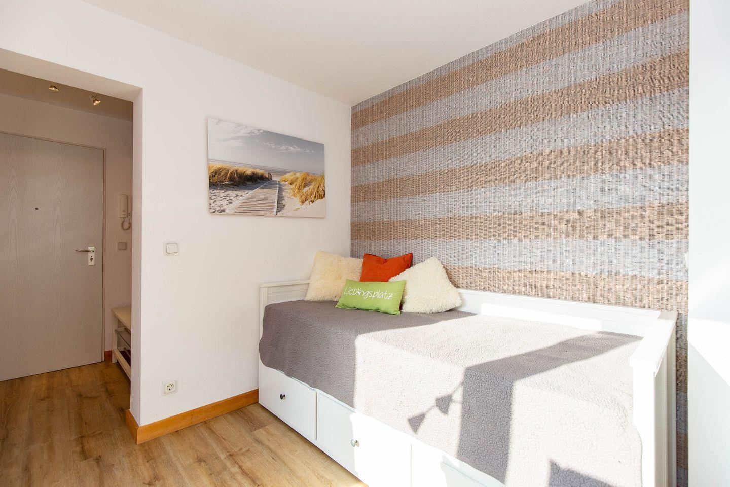 Haus "Trafalgar", App. 421, Typ D, bis 4 Personen, 4. Etage, ca. 60 qm, Westseite, Meerblick Richtung Neuwerk, Schlafzimmer mit Doppelbett, 2. Schlafzimmer mit ausziehbarem Doppelbett, Wohnbereich mit Ledercouch und Sessel, Dusche/WC, Gäste-WC, abgetrennte Küche durch einen Tresen mit Geschirrspüler, Backofen und Mikrowelle, Dachterrasse mit eigenem Strandkorb, Kabel-TV, W-Lan im App., Nichtraucher, Tiefgaragenstellplatz, Strandkorb am Strand im Sommer 2026.