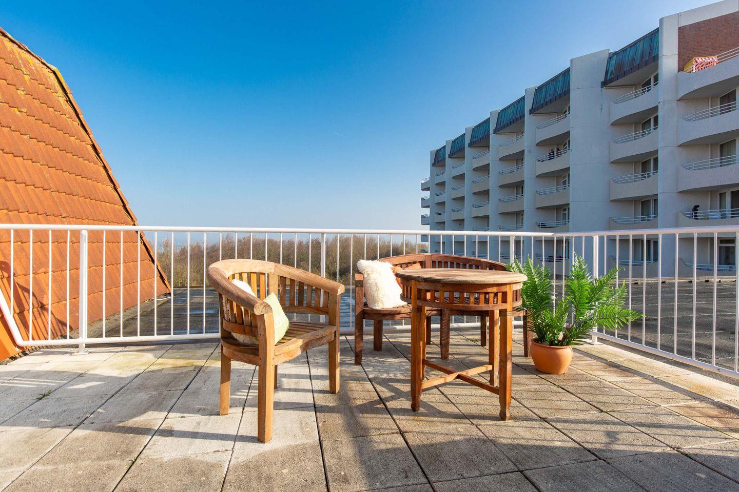 In dieser FeWo erwartet Sie eine große Dachterrasse mit eigenem Strandkorb. Bei Wind und Wetter können Sie hier die Aussicht auf die Nordsee und die frische Nordseeluft genießen.