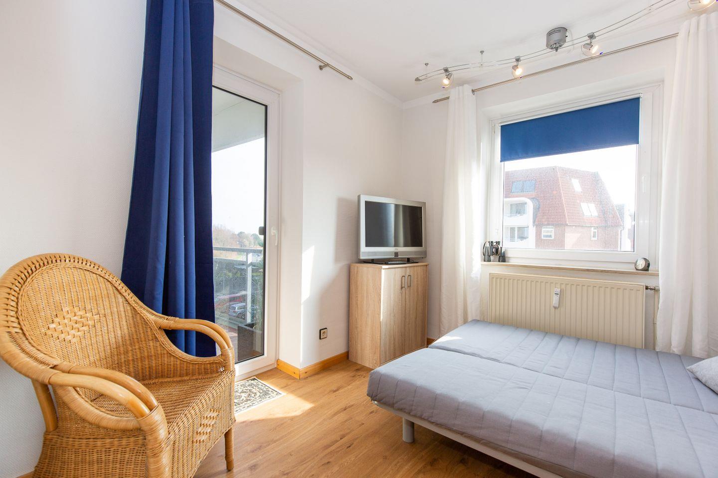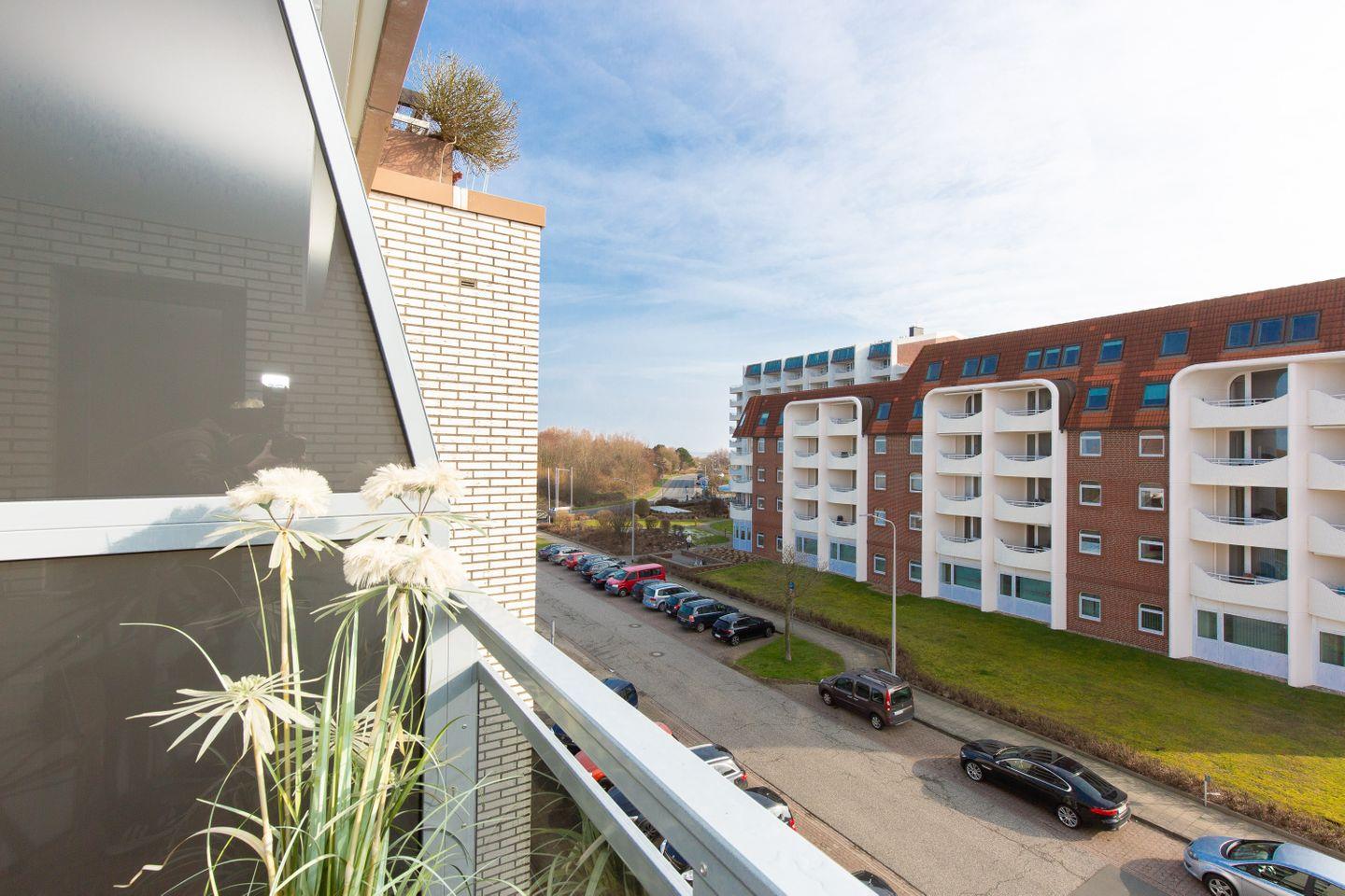 Es gibt einen Balkon vom Wohnbereich und einen weiteren vom 2. Schlafzimmer aus mit seitlichem Blick auf den Deich.