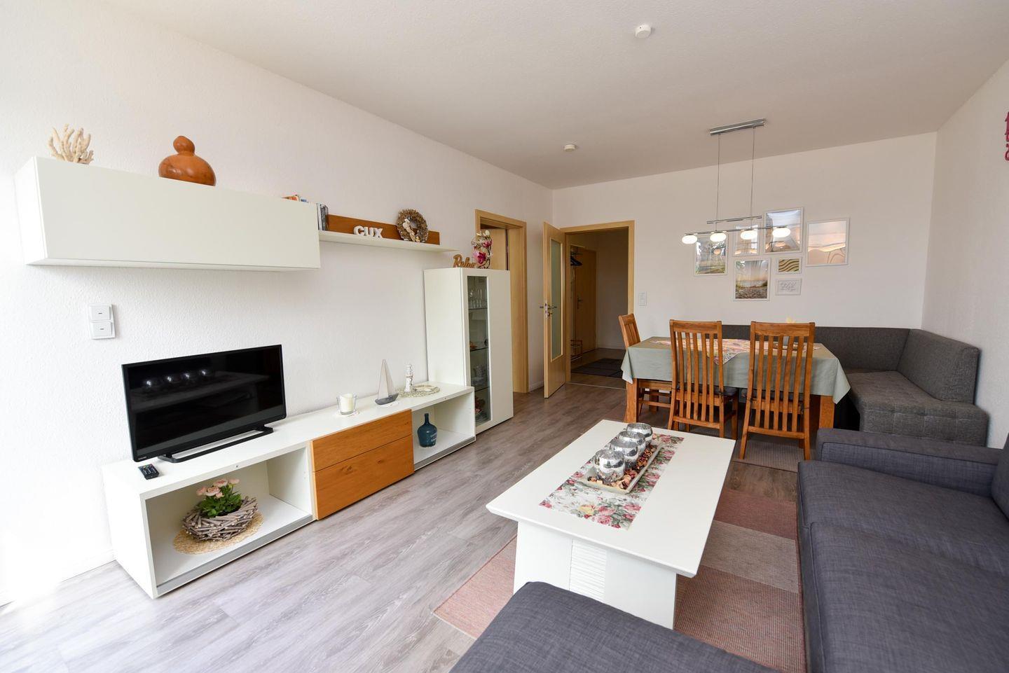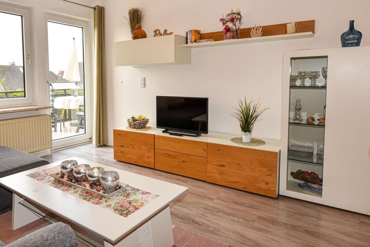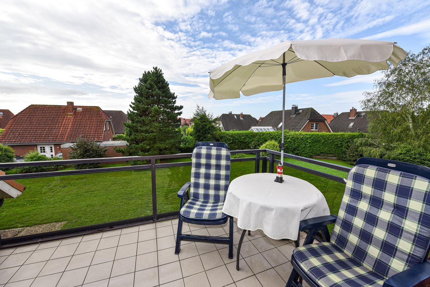 Modernes Ferienappartement mit sonnigem Balkon in Cuxhaven-Duhnen, ideal für erholsame Tage im Grünen.