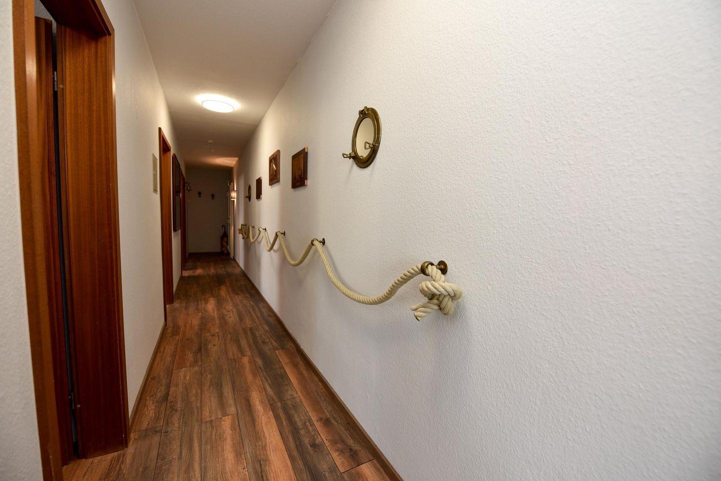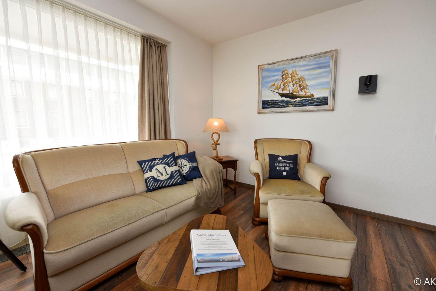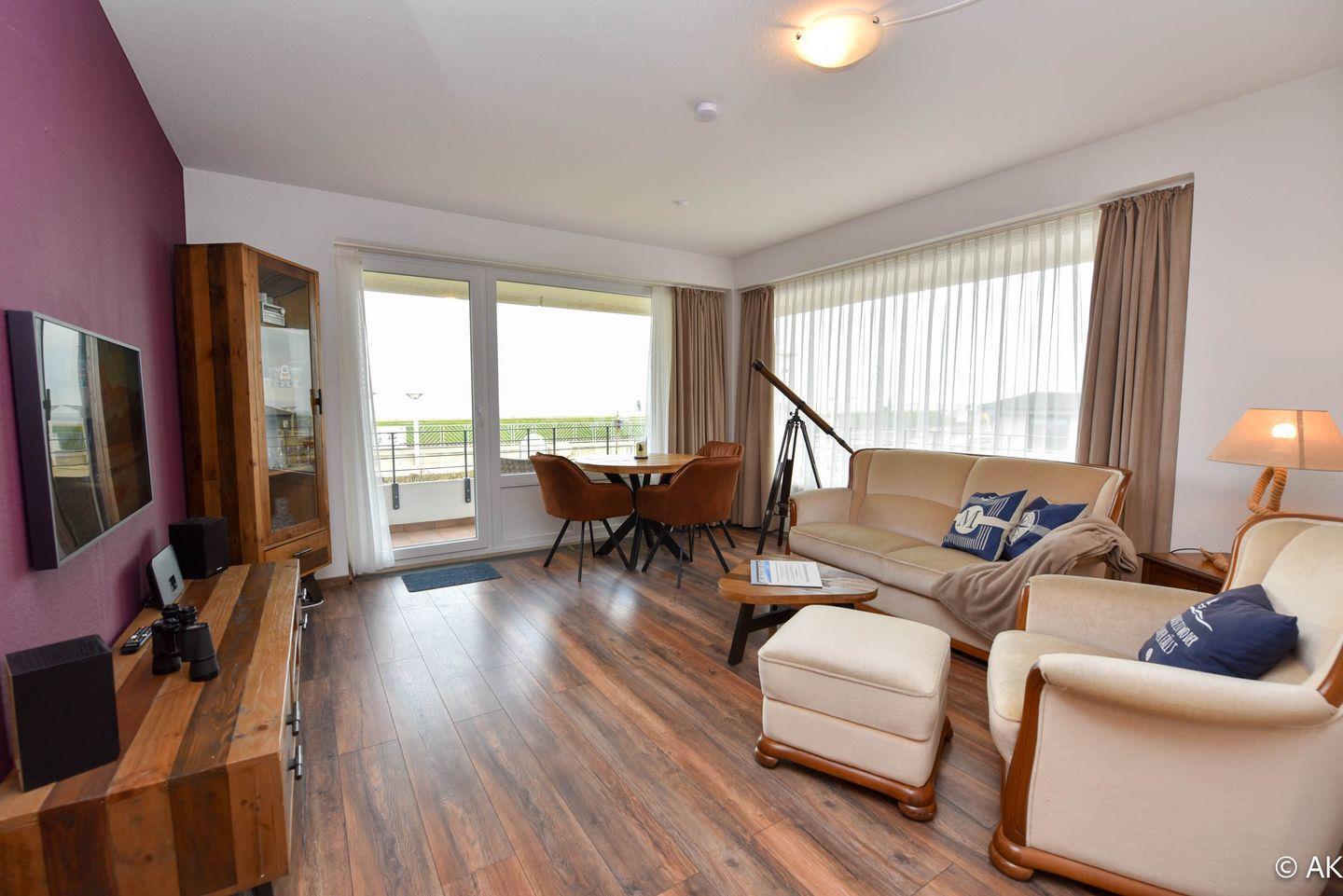 Die 3 Zimmer Eckwohnung Nr. 8 mit separater Küche und Balkon im Haus "Nautilus" liegt im Hochparterre und hat eine direkte Seesicht auf das UNSECO Weltnaturerbe Wattenmeer sowie den Weltschifffahrtweg. Die Wohnung ist aufgeteilt in ein Wohnzimmer, Küche, Schlafzimmer mit Doppelbett und ein Schlafzimmer mit einem Boxspringbett sowie einem Bad mit Dusche und WC.